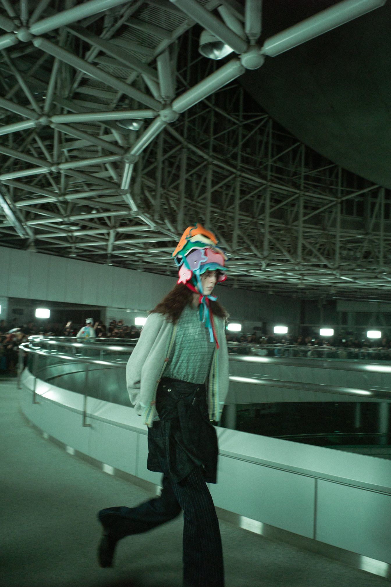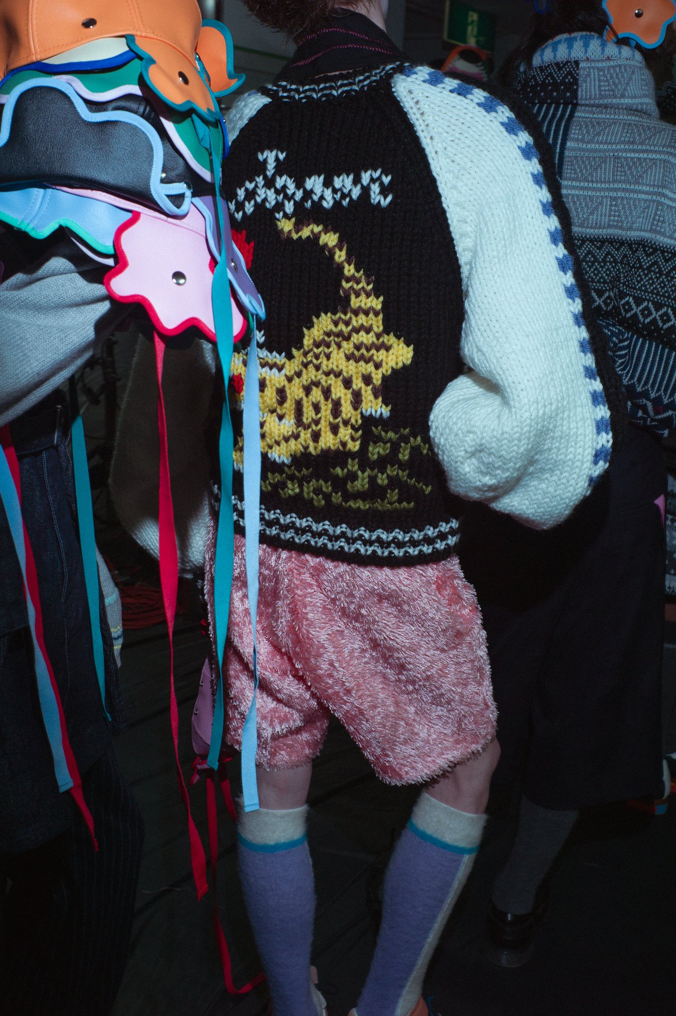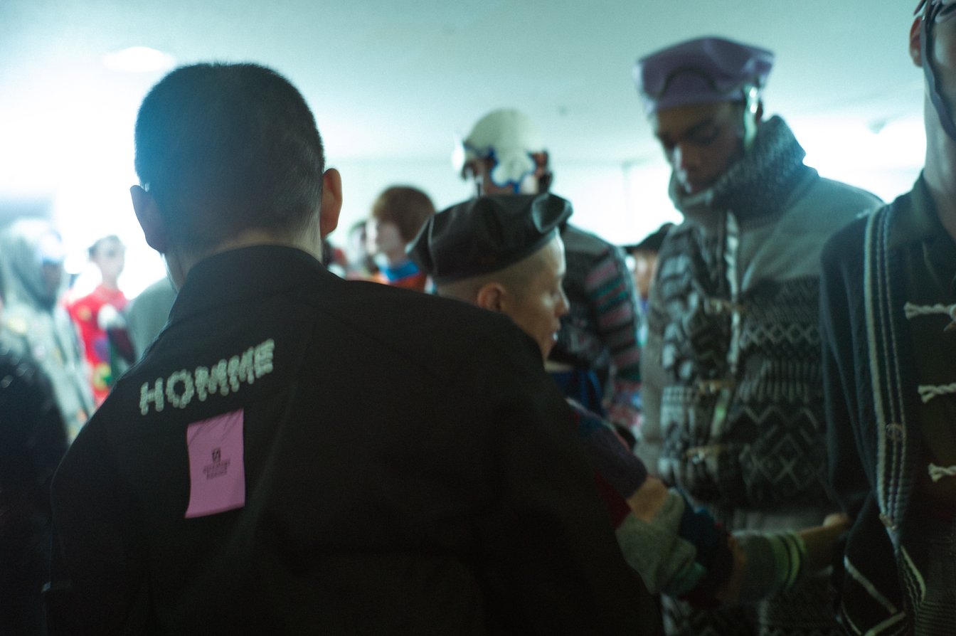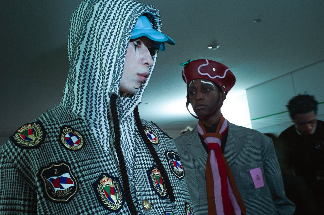 この日、気になったのは森永の盟友で、ショーのスタイリングを毎度手掛けているTEPPEIがいつも以上に熱く関係者と抱擁を交わしている様だった。話を聞けば、今回のミューズは他ならぬ彼にあったという。森永が言うところの「原風景」には、スマートフォンも普及していない2000年代初頭の原宿で、TEPPEIが(ウィメンズであるはずの)アンリアレイジの服を着て、ストリートスナップに登場し、たった一人の着用に街の景色を変えてしまうくらいの威力があると感じたことにもあったという。この日、TEPPEIはアンリアレイジの2007年コレクションに登場したニットのパッチワークカーディガンを羽織っていた。そのパッチワークももちろん、今回のショーで一部デザインに落とし込まれている。