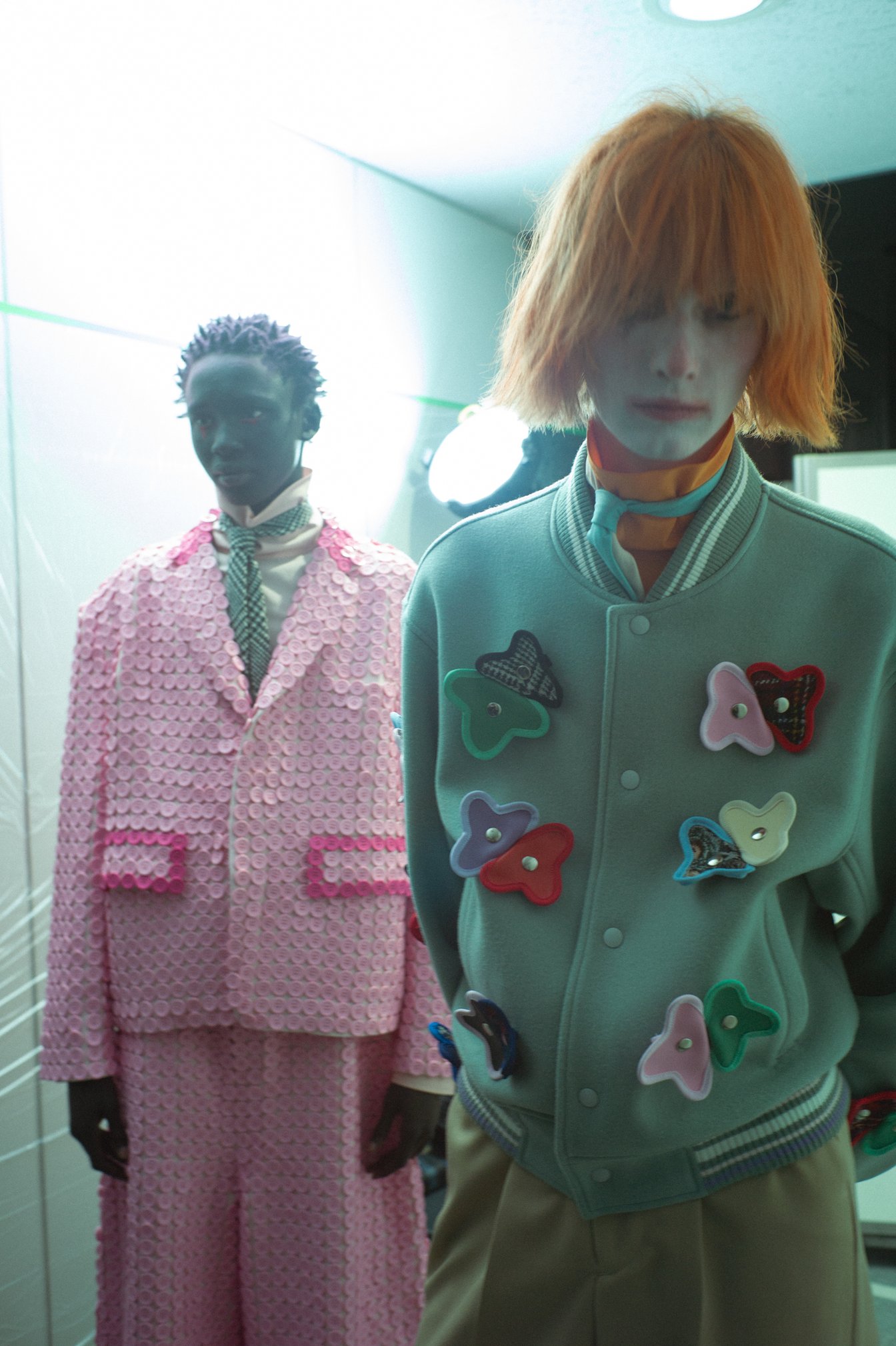 「その実態のない色のようなものは、僕にとっては開けるのも苦しいほどの服を作り始めめた時の原風景と通じるものがあった。昔のことではあるけど、そこに置いてきた魂もある。当時の自分が、このコレクションを見たらという想いもある」(森永邦彦)。