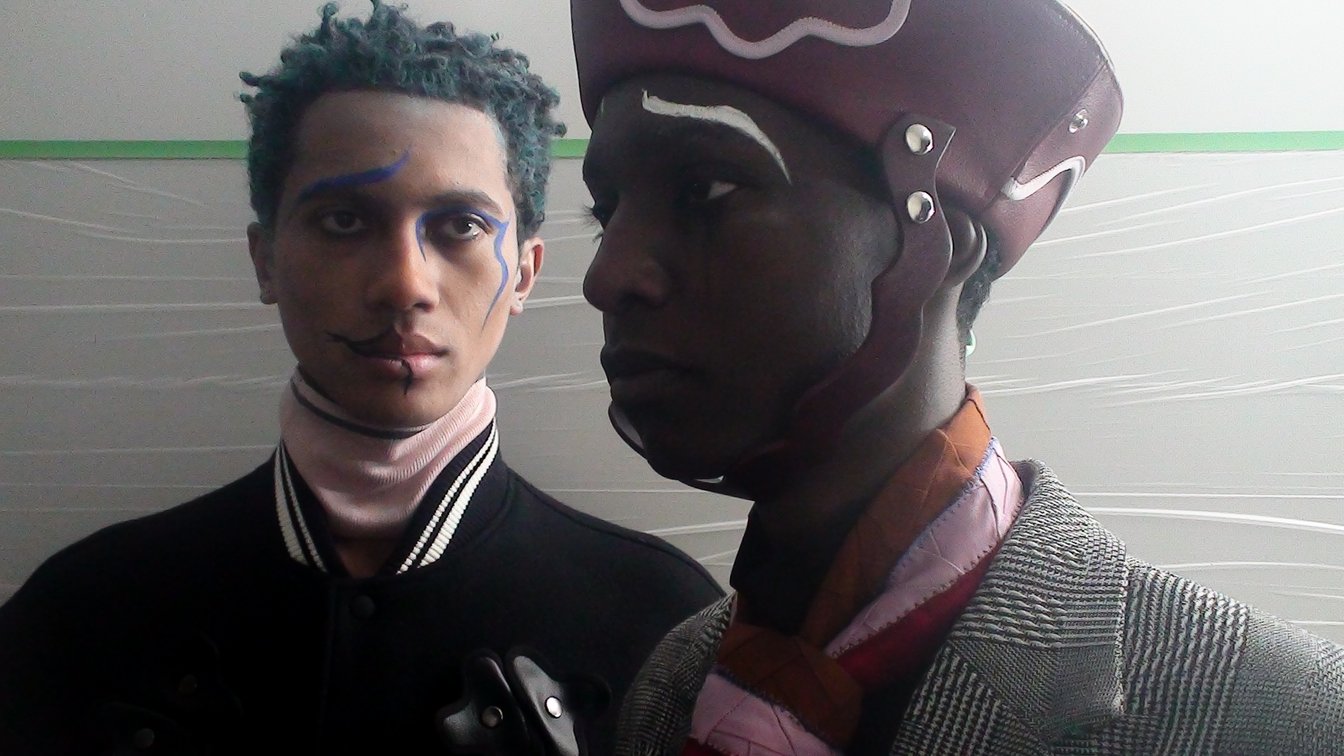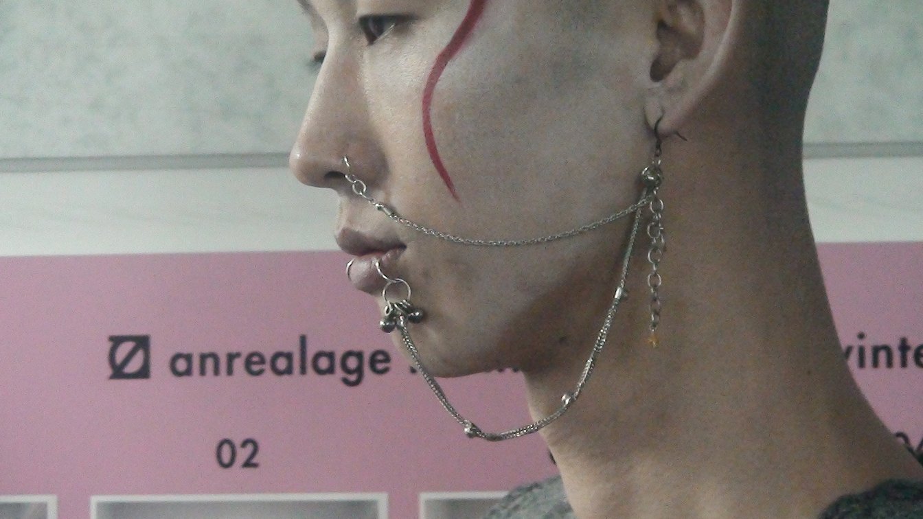 アンリアレイジとアンリアレイジ オムは出発地点は違えども、日常と非日常性の曖昧さに変わらず目を向けている。その証拠に、新進気鋭のブランド「ノリ エノモト(nori enomoto)」とコラボしたヘッドピースやジャケットは、コレクション全体に程よい「アンリアレイジらしからぬ」新たなテイストを与える。ノリ エノモトの曲線が象徴するように、メンズのボディをど真ん中に据えながらも、メンズにはないような曲線や色使いが数多く見られた。思えば、アンリアレイジ オムは鋭角的な印象を持つ大文字ではなく、丸い印象を与える小文字の「anrealage homme」が正式表記だ。