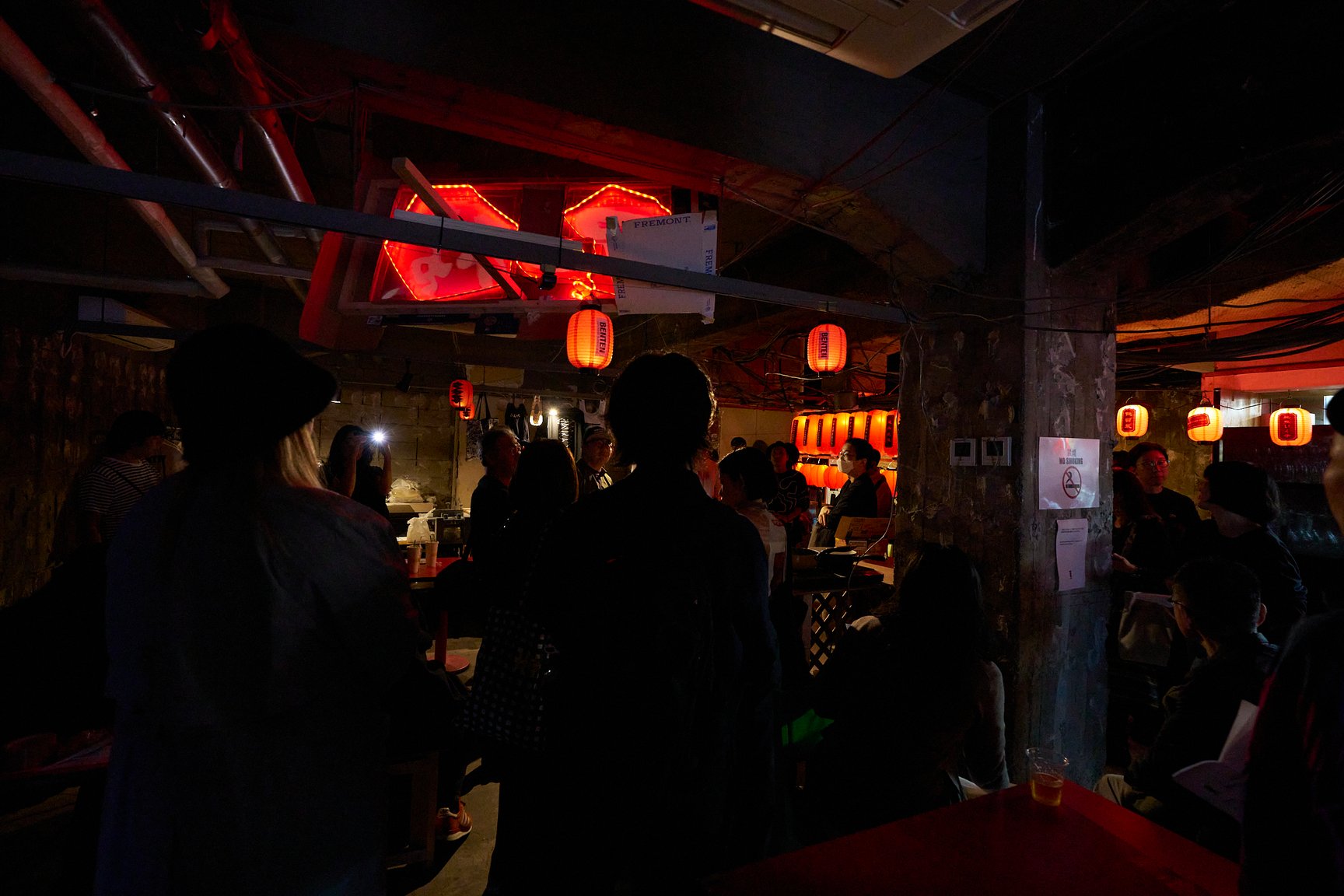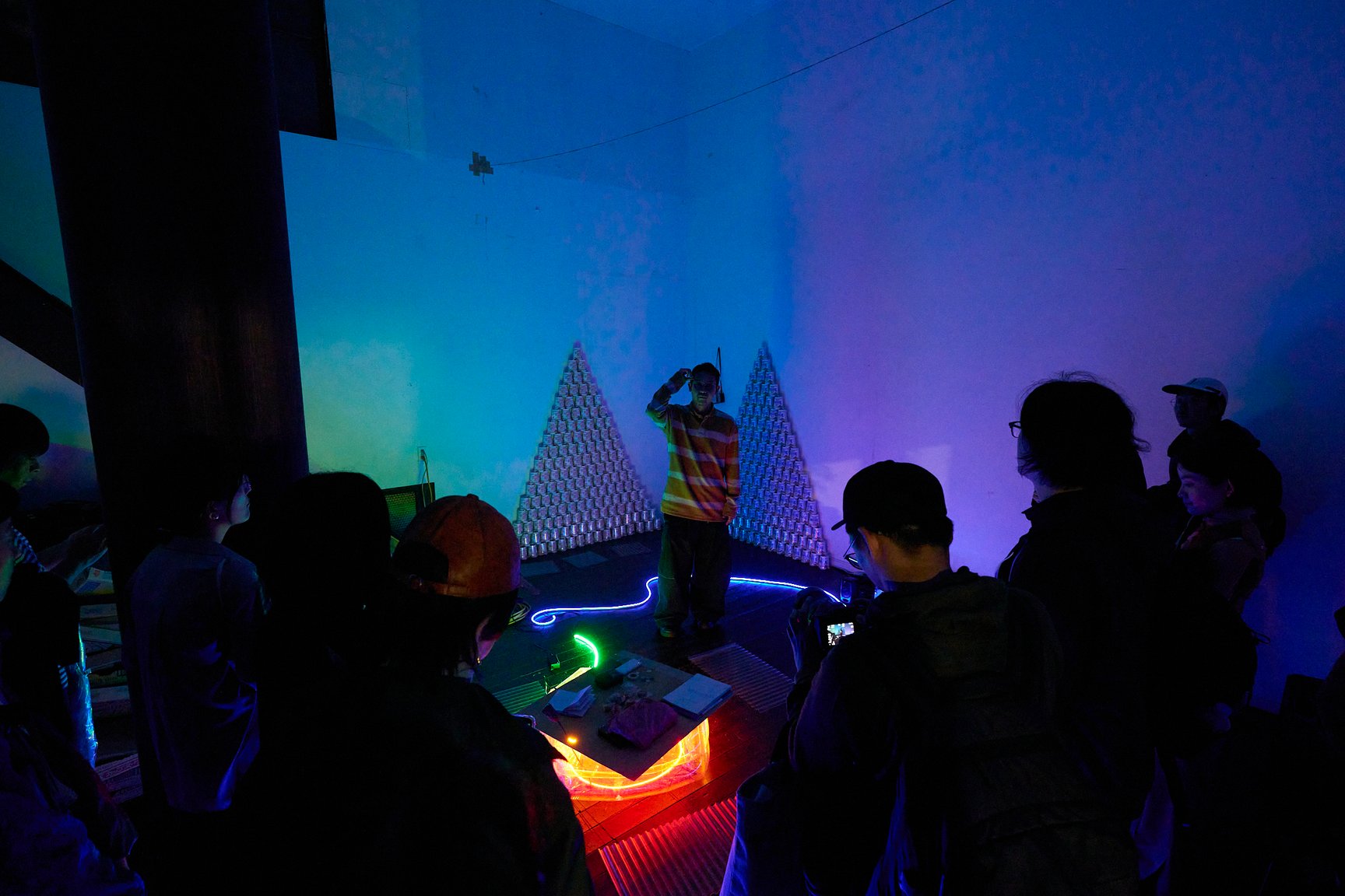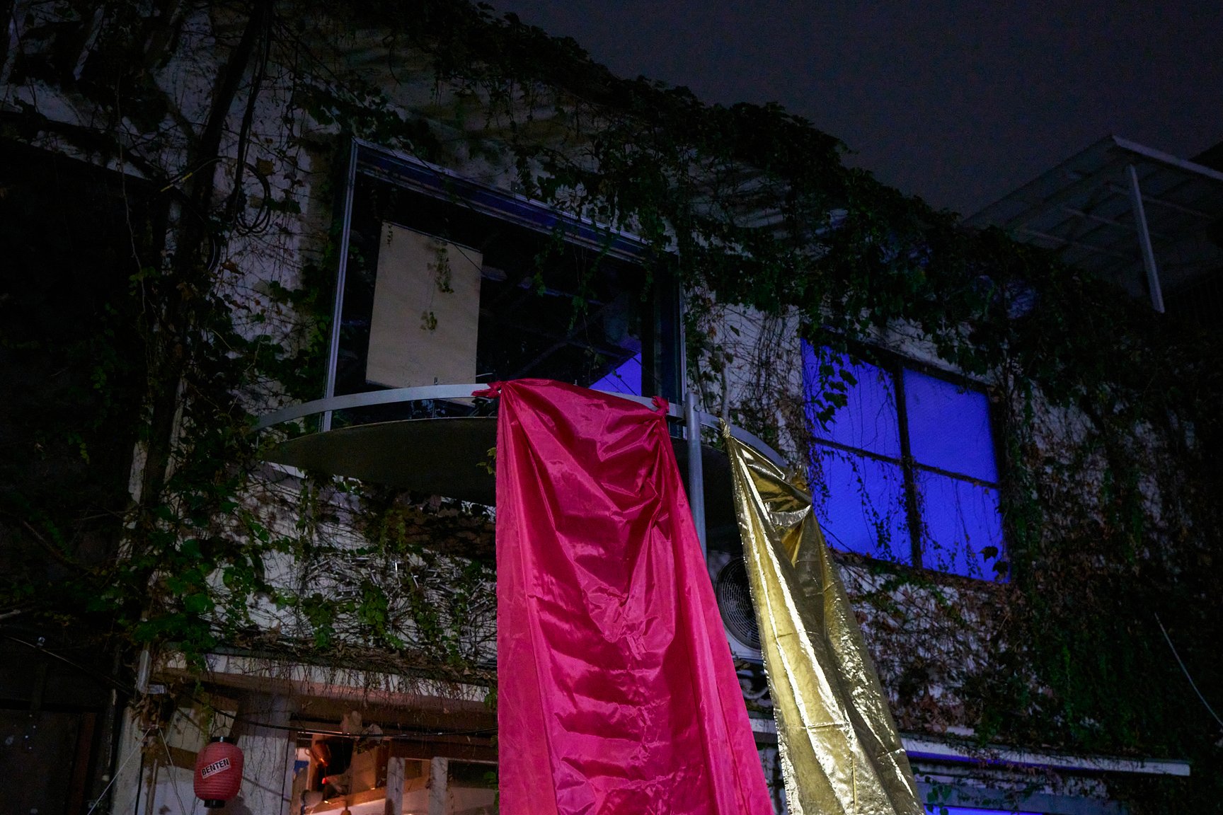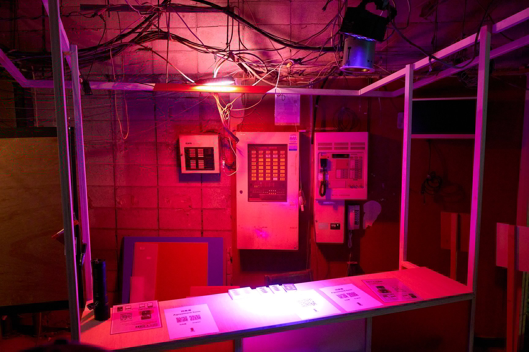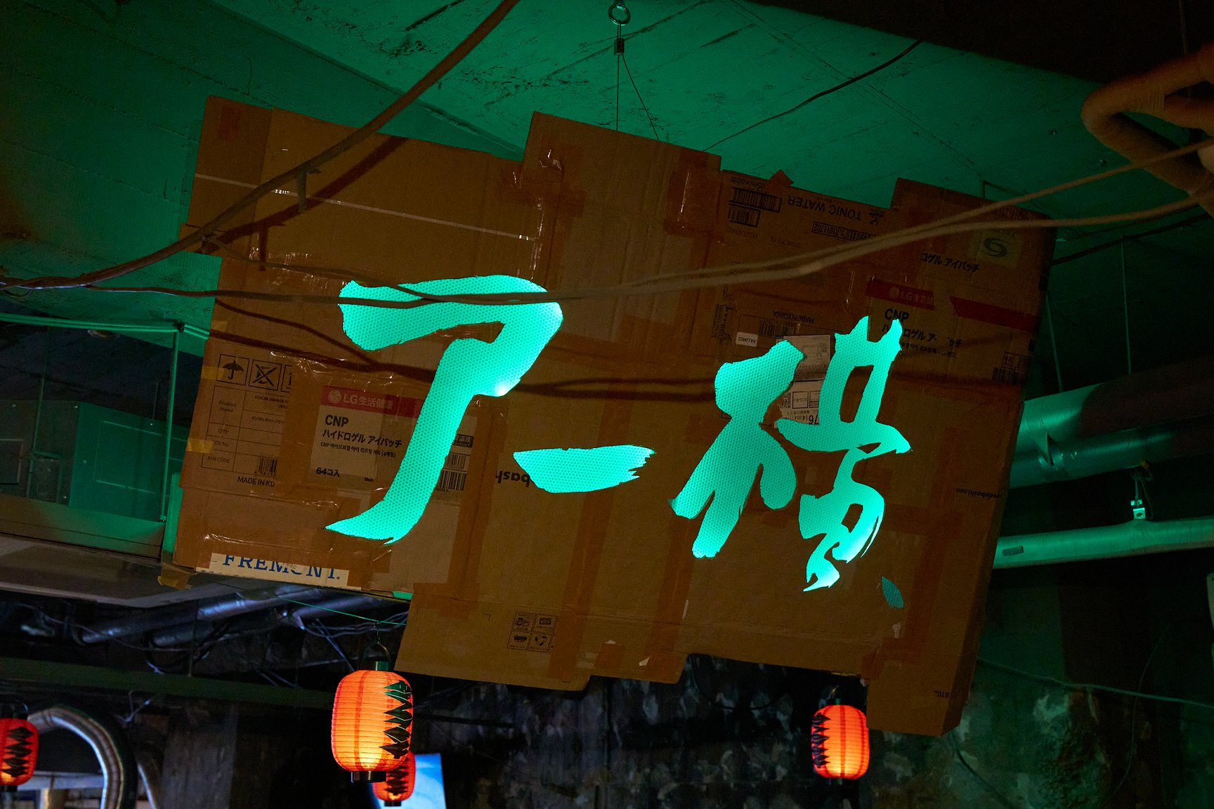 ビルの中に足を踏み入れると、そこには昭和の懐かしさを感じるような赤提灯が並ぶ、アンダーグラウンドな光景が広がります。1階では「アー横」と題し、再開発ブームで増え続ける東京の横丁に対するオルタナティブとして、アーティストやアートコミュニティが集まり、22時から朝5時まで飲食やパフォーマンス、物販を“ゆるく”展開する横丁イベントを実施。11月2日には会田誠が重慶の友人からもらった火鍋を日本人向けにマイルドにアレンジした「特製火鍋」を提供するほか、3日には山下陽光が手掛ける「途中でやめる」が、服を通じた金儲けをお題に客のマッチングを図る「即実験ランド」を開店します。ちなみに、緑のネオンに照らされた「アー横」の文字は、会田誠の手によるものだそうです。