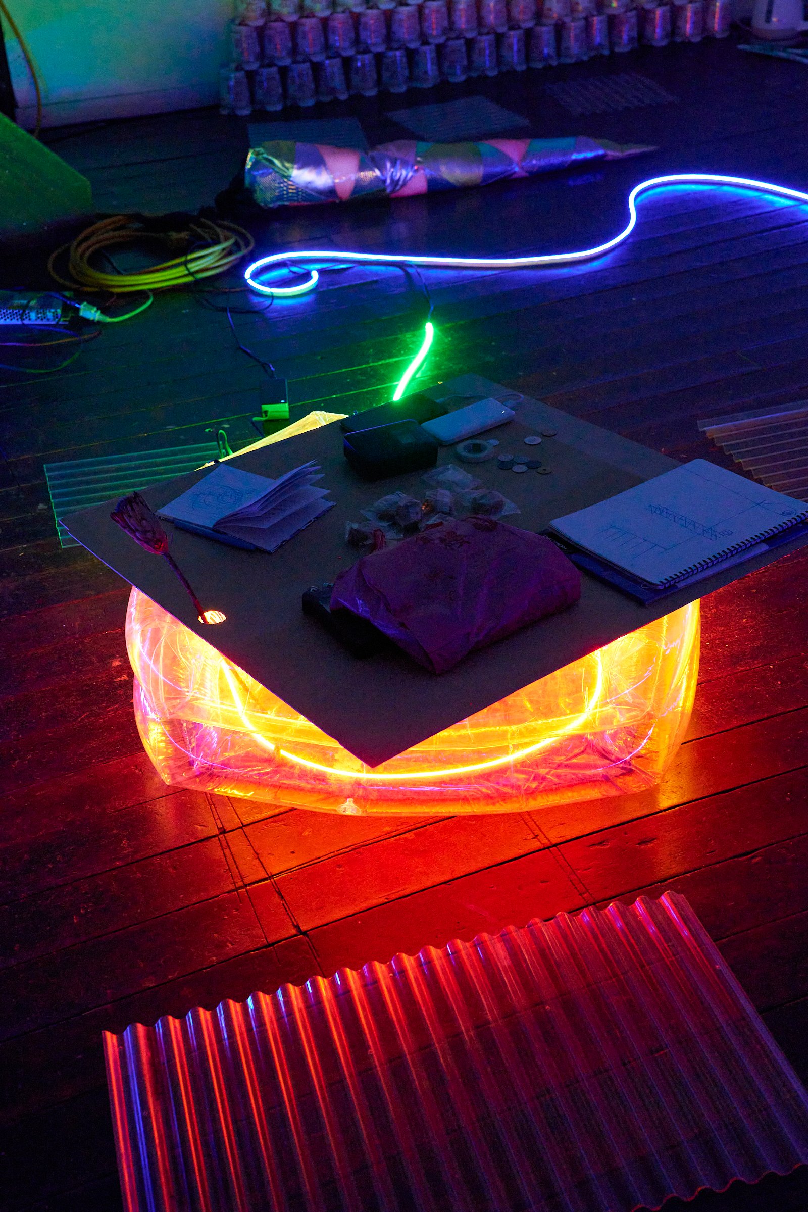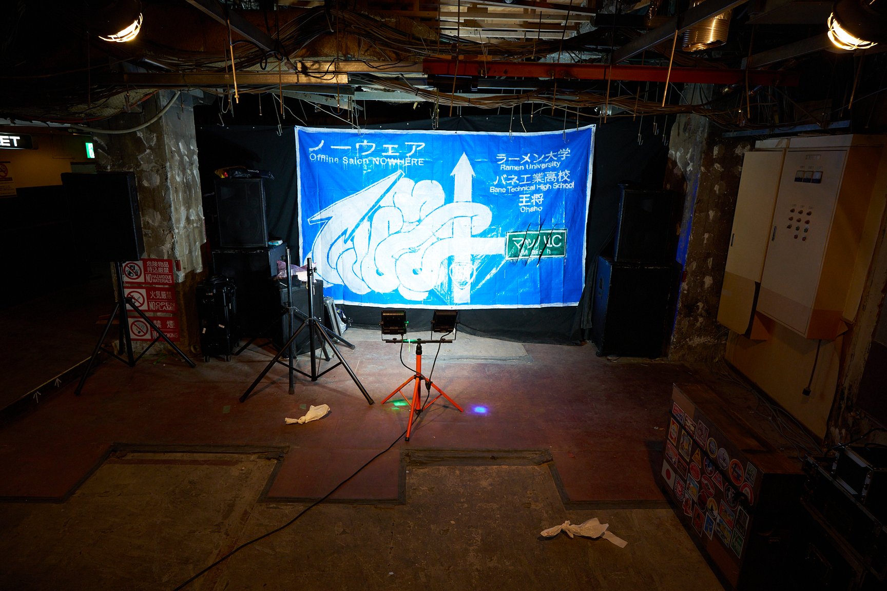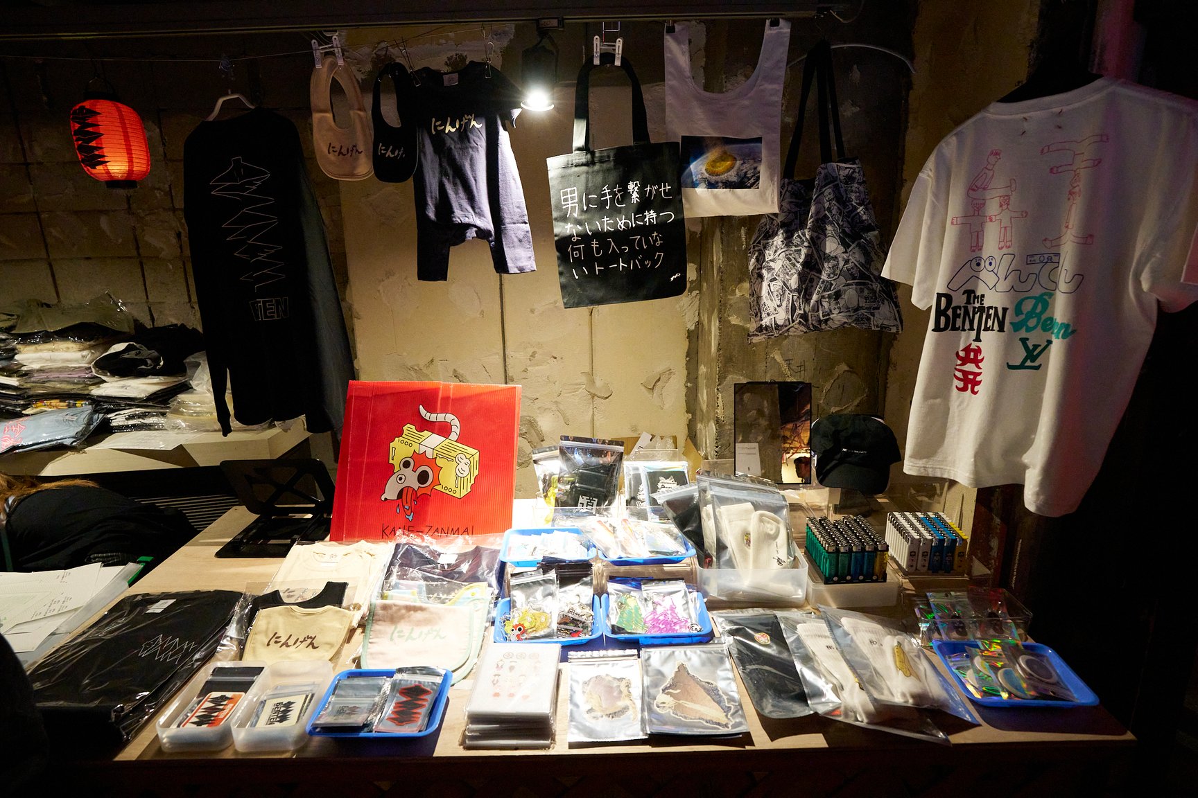1階の奥には、期間中さまざまなアーティストがパフォーマンスやライブを開催するスペースが設けられているほか、Chim↑Pom from Smappa!Groupの「金三昧」が、歌舞伎町最奥地のセレクトショップ「THE FOUR-EYED」とコラボレーションして作った“FAKE商品”の物販コーナーも登場。SNS上で高い人気を集めるアーティスト「ぼく脳」の特製ドリンクや、墨田区の社会実装型アートスペース「京島駅」によるタンドール窯で焼いた「宇宙のパワーナン」、松戸のオフラインサロン・ノーウェアによる「ノイズカレー」と「コンドームおにぎり」などのフードやドリンクも楽しめます。