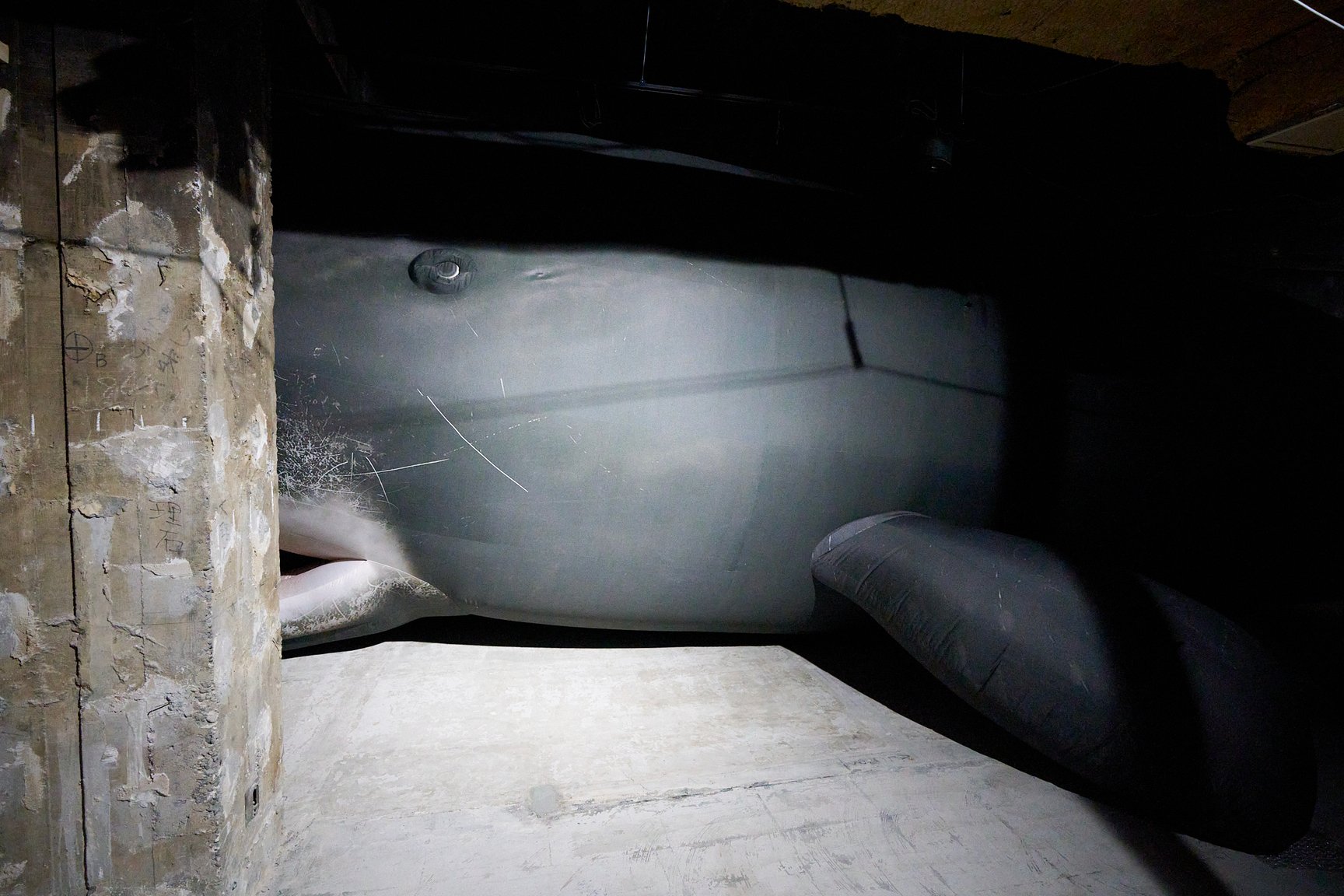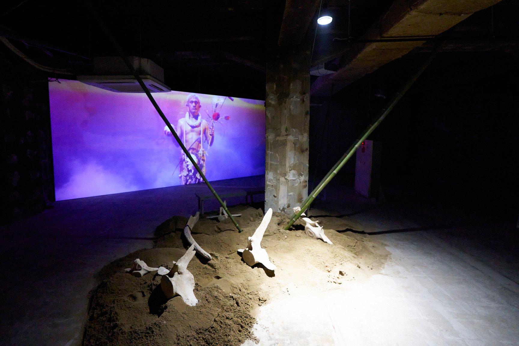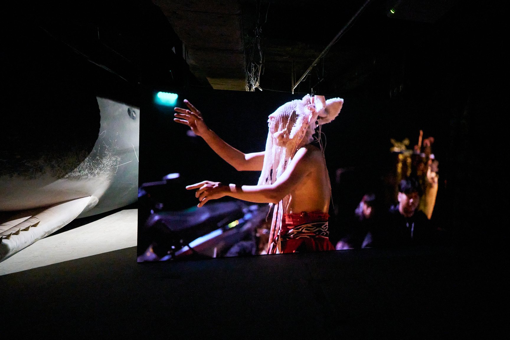 王城ビルの2階と3階では、“Asian Dope Boys”として知られる中国・北京出身のアーティスト チェン・ティエンジュオが、2フロアを使った大規模なインスタレーションを展開。フロア内に設置された複数の大きなスクリーン上では、インドネシア・ラマレラ村の伝統捕鯨から着想を得て、チェンとダンサーのシコ・スティヤントが公演として儀式を行った映像を展示という形で再構成して披露しています。薄暗いフロアに存在感たっぷりに佇む、空間に収まりきらないほど巨大な鯨のオブジェにも注目です。