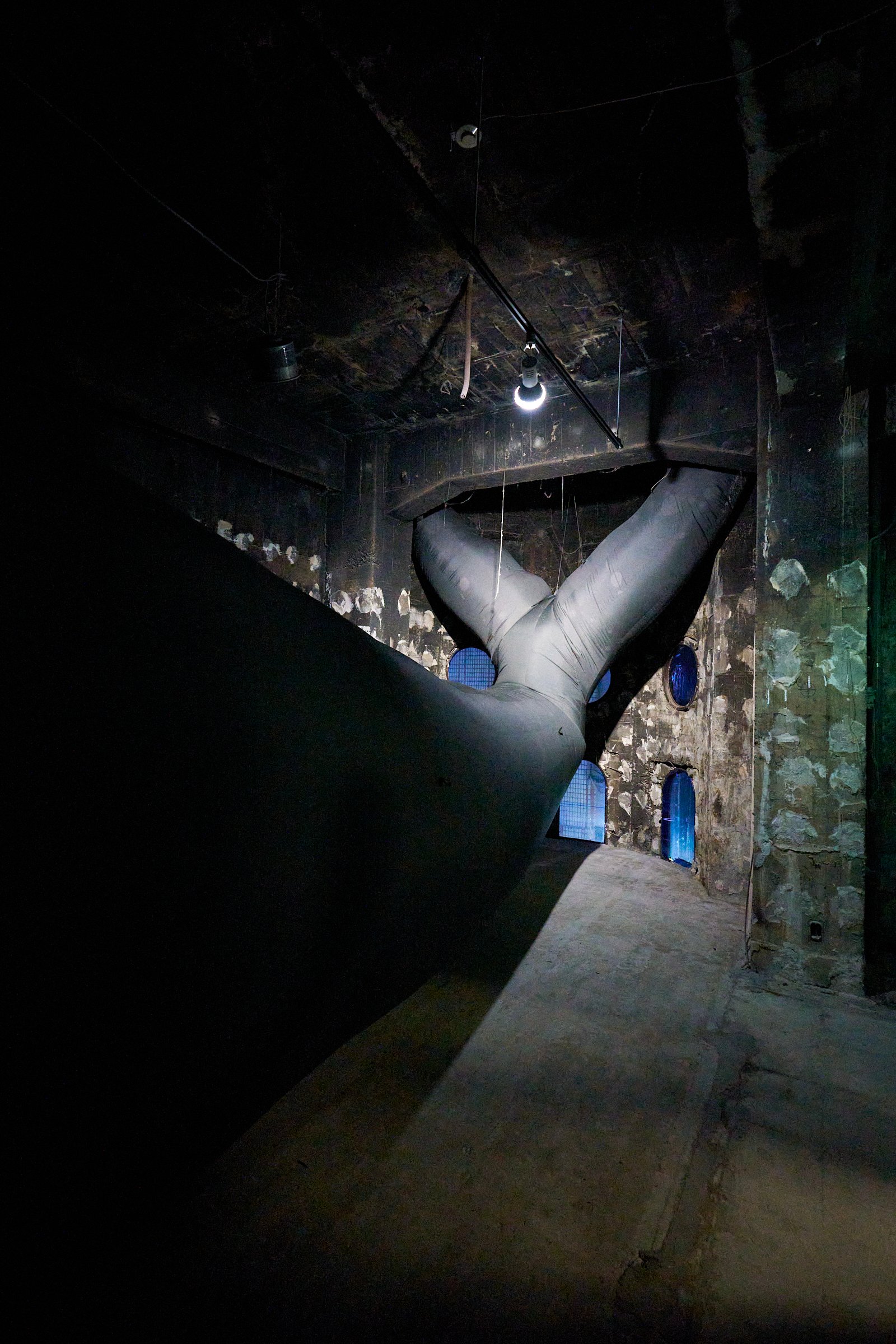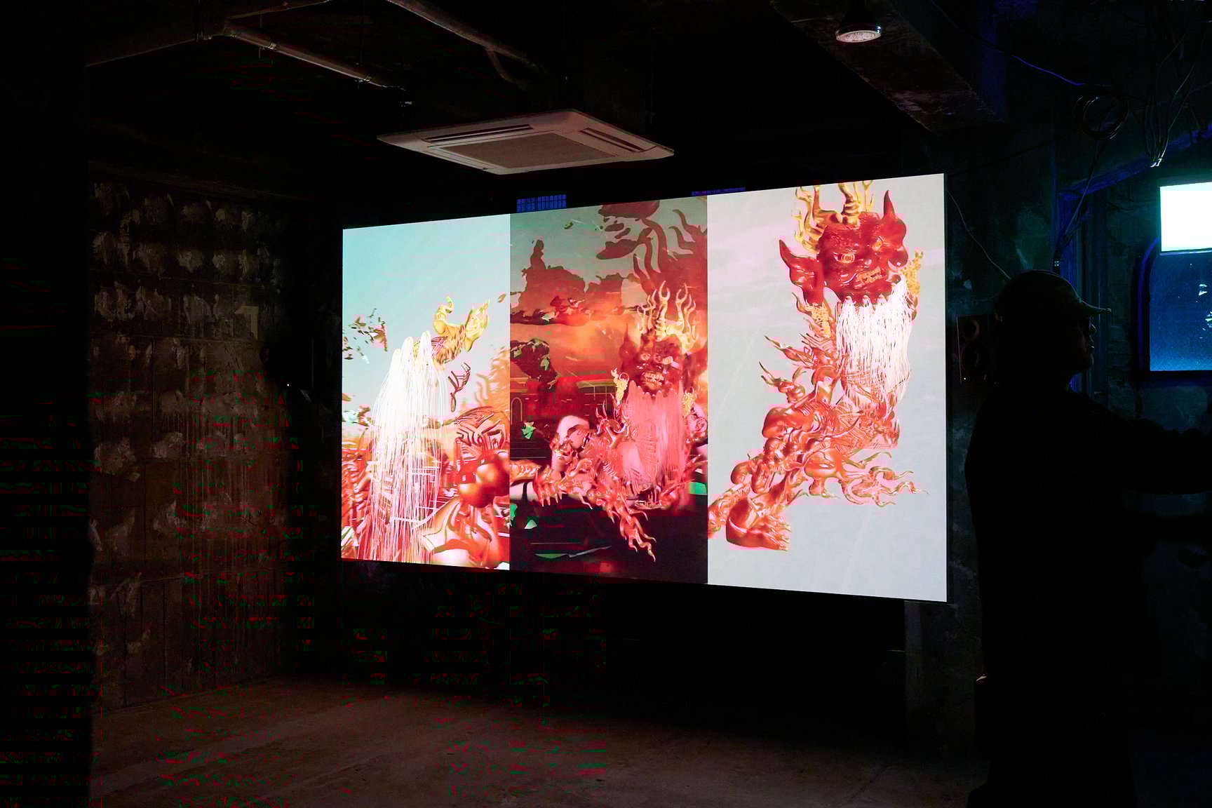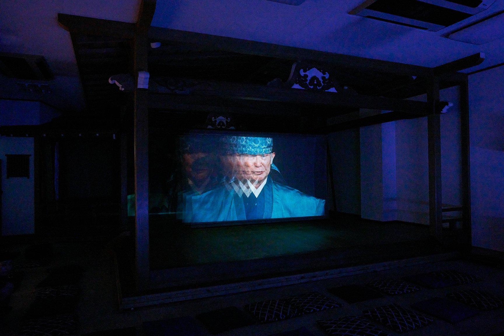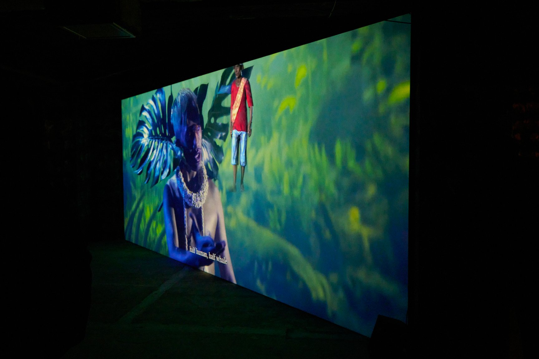 王城ビルの2階と3階では、“Asian Dope Boys”として知られる中国・北京出身のアーティスト チェン・ティエンジュオが、2フロアを使った大規模なインスタレーションを展開。フロア内に設置された複数の大きなスクリーン上では、インドネシア・ラマレラ村の伝統捕鯨から着想を得て、チェンとダンサーのシコ・スティヤントが公演として儀式を行った映像を展示という形で再構成して披露しています。薄暗いフロアに存在感たっぷりに佇む、空間に収まりきらないほど巨大な鯨のオブジェにも注目です。