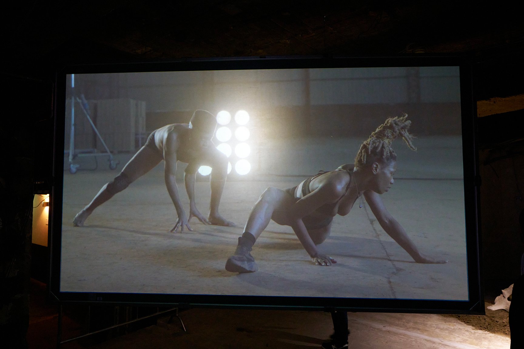 王城ビル最上階の5階では、アーティストの遠藤麻衣が、2024年に国立西洋美術館で開催された展覧会「ここは未来のアーティストたちが眠る部屋となりえてきたか?」のために、エドヴァルド・ムンクの「アルファとオメガ」に触発されて制作した映像作品を上映。国立西洋美術館でのヌードパフォーマンスと日本のストリップ劇場の歴史を重ね合わせた内容で、作品では現役ストリッパーの宇佐美なつと遠藤自身が共演しています。