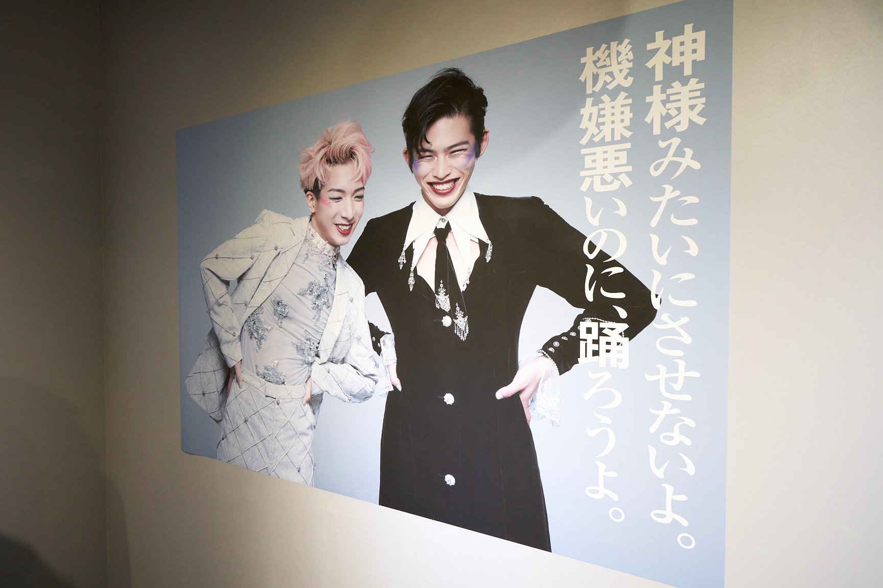 展示作品の中で、2人は繊細なディテールが美しい「タナカ ダイスケ(tanakadaisuke)」の淡いピンクと黒の衣装を着用。11月4日の夜18時と20時に王城ビルで実施予定のスペシャルライブでは、実際に同衣装を着てのパフォーマンスを予定しています。予約者優先エリアでの観覧予約は既に満席となっているものの、エリア外からの鑑賞も可能。一夜限りのスペシャルなパフォーマンスは必見です。