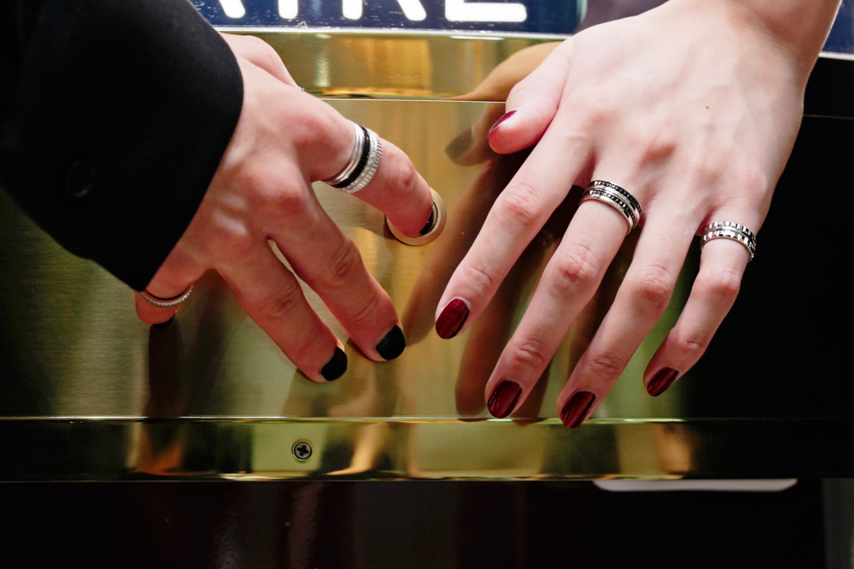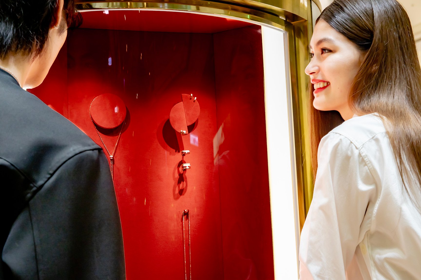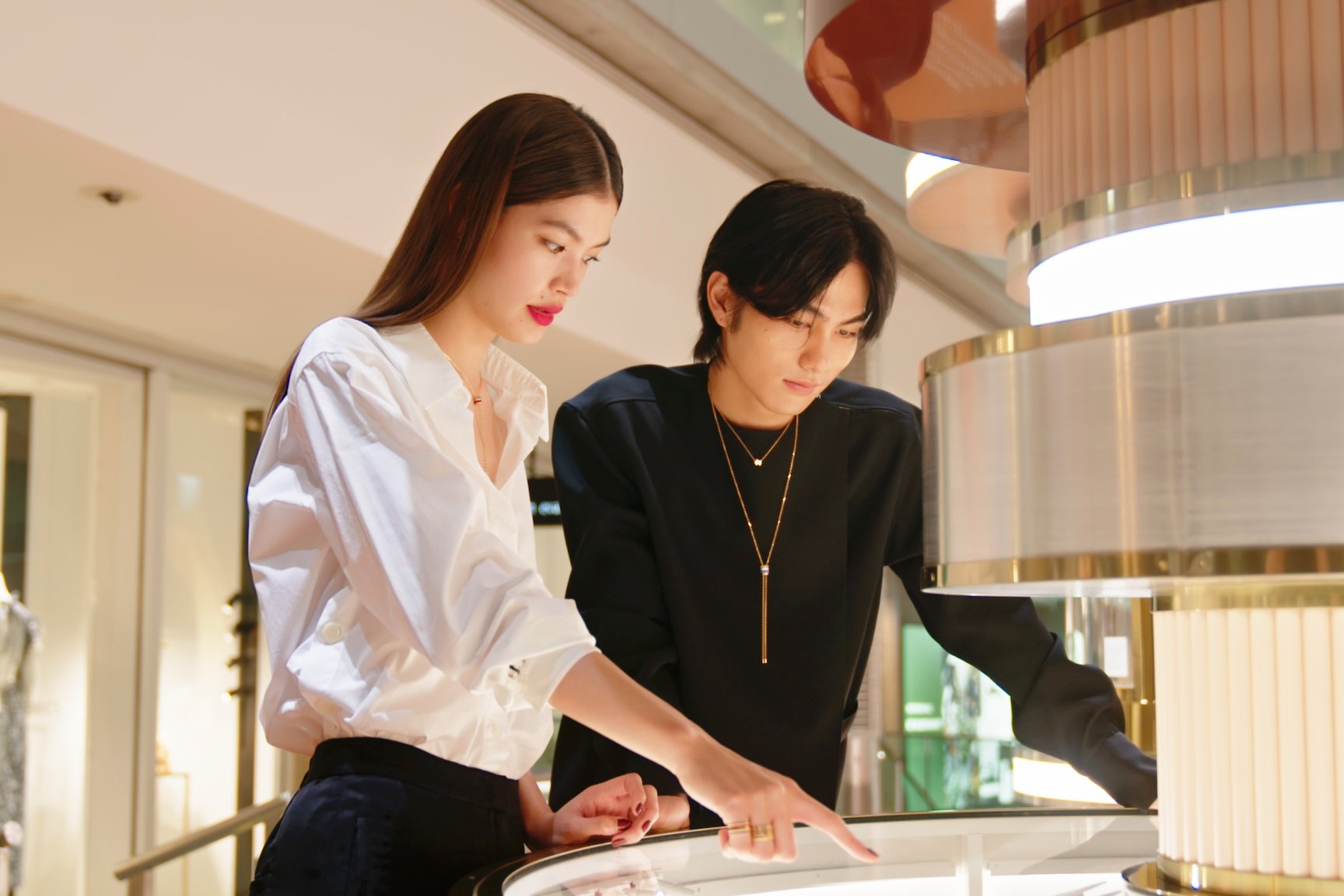 福士さんは「ジュエリーを色々な角度から見られるのがいいですね。光の反射によって美しく煌めくダイヤモンドや、立体的な彫刻のディテールが際立ちます」と、その輝きに見入っていました。大平さんは「ジュエリーをとても身近に感じることができるポップアップですね。キャトルはジェンダーレスなコレクションなので、友人と遊びに来たり、デートにもいいですね。好みのカラーやデザインを見つけられると思います」と笑顔で語ります。