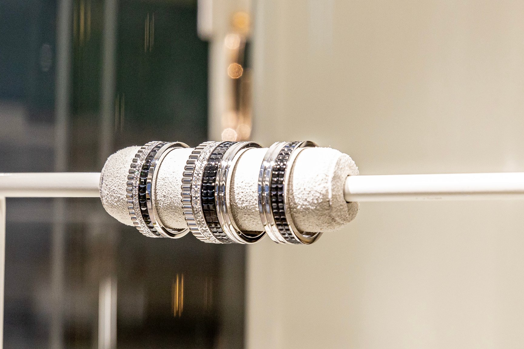 イヤリング『キャトル ラディアント』オープンロー シングル(WG×ダイヤモンド)¥440,000、リング ともに『キャトル ブラック』右手:ダイヤモンド リング ラージ(WG×ブラックPVD×ダイヤモンド) ¥1,425,600、左手中指:リング ハーフ 各¥303,600(同じアイテムを重ねて着用)、小指(指先から):『キャトル クル ド パリ』リング ミディアム ¥279,400、『キャトル ラディアント』リング ハーフ(WG)¥327,800