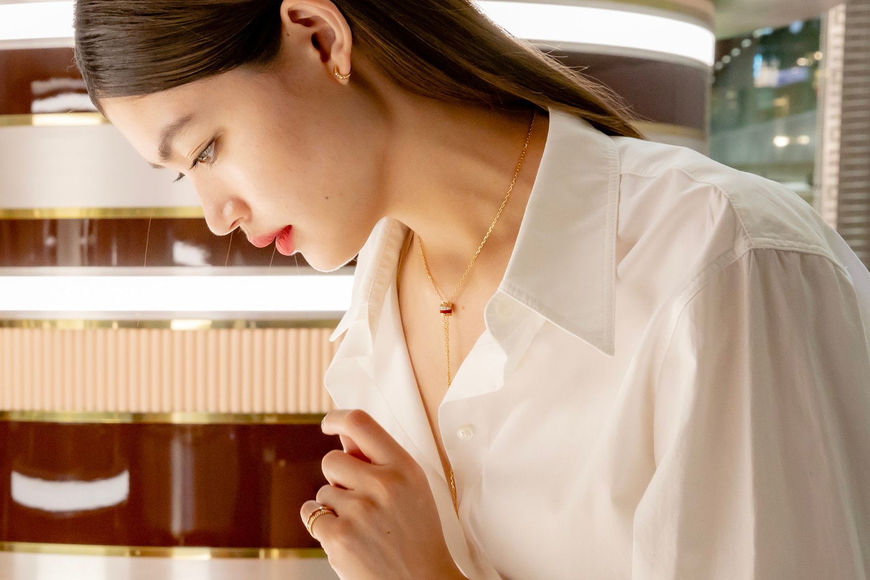福士さんのお気に入りは、リップのカラーともリンクするレッドのネックレス。「シンプルなデザインなのに、個性的なところが好き。カラーで遊んで自分らしさを表現できるのはキャトルの魅力ですね」。大平さんは「いつか欲しいと思っていた憧れのジュエリー。キャトルを着けるとコーディネートのアクセントになるし、スタイルがきれいにまとまるんです」と、それぞれのキャトルへの思い入れも。