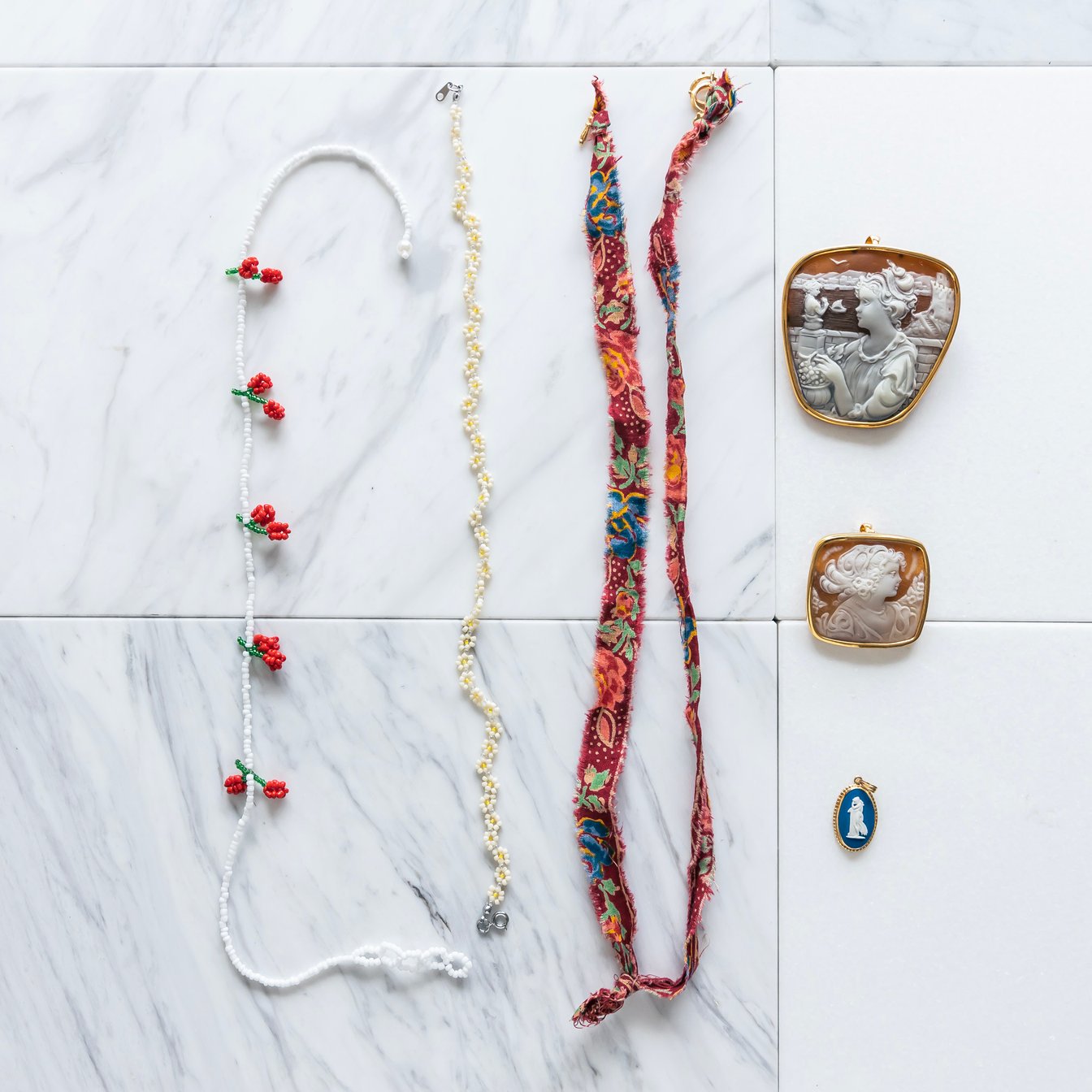 カメオのほか、ビーズネックレスや紐などを好みで用意。今回はメルカリで購入したビーズネックレスと、着なくなった服の切れ端を使用しました。