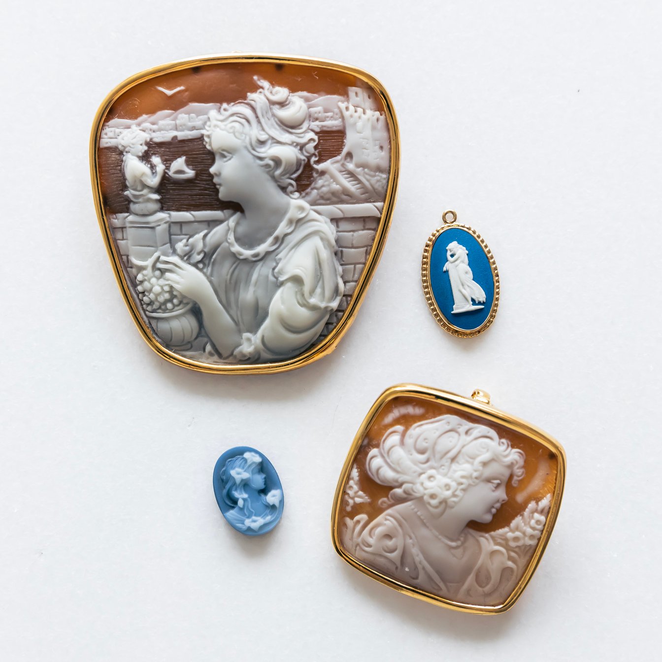 価格は材料や彫りの技術によって異なりますが、今回使用するカメオはメルカリで2000〜3000ほどで購入したもの(※一部を除く)。 鼈甲色のカメオはシェルタイプで大ぶりなデザイン。右上の「ウェッジウッド」のカメオ風ブローチは陶器製で、素材によって雰囲気もがらりと変わるのが印象的です。