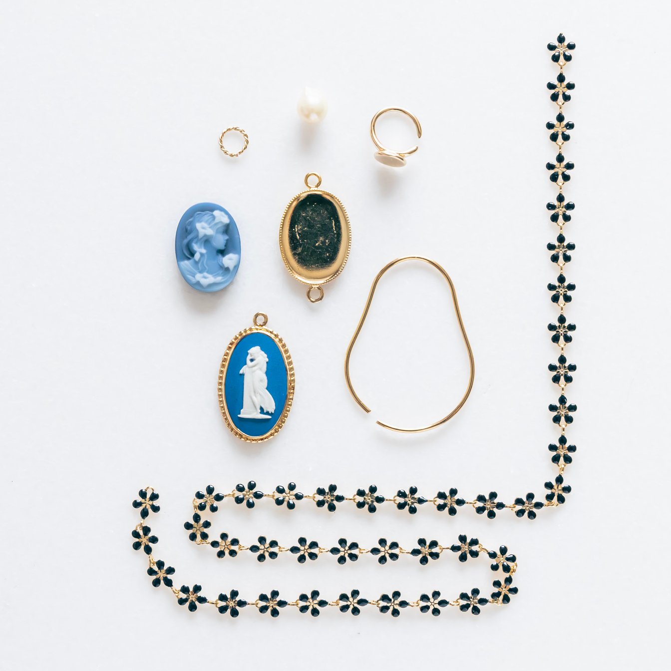 カメオのほか、ミニパールや花モチーフのチェーンをアレンジのアクセントとして用意。金具はカメオの台座として使用する「ミール皿2カン付き」(140)、「イヤーカフ 丸皿付き」(440)、ビーンズ型の「メタルリング ビーンズ」(200)、丸カンを用意しました。今回使用したパーツはほとんど貴和製作所で購入。