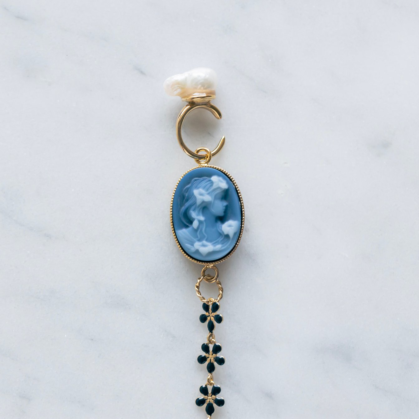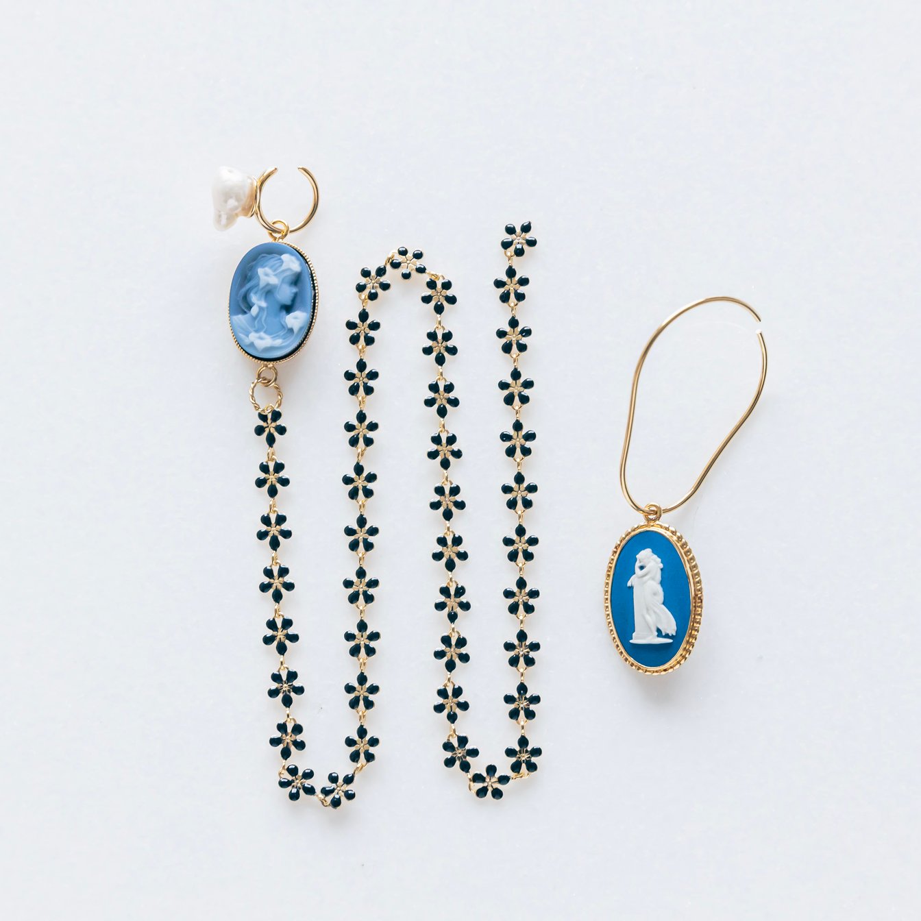 ネックレスとピアス、それぞれ着けるとこんな感じ。「何個もじゃらじゃらつけると可愛いですよ。特にサイズ感が違うカメオを合わせると、スタイリングに強弱がついておすすめです!」(石上さん)。