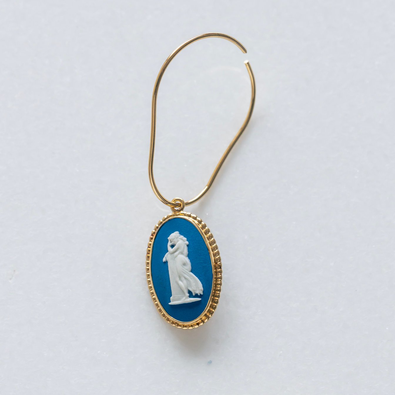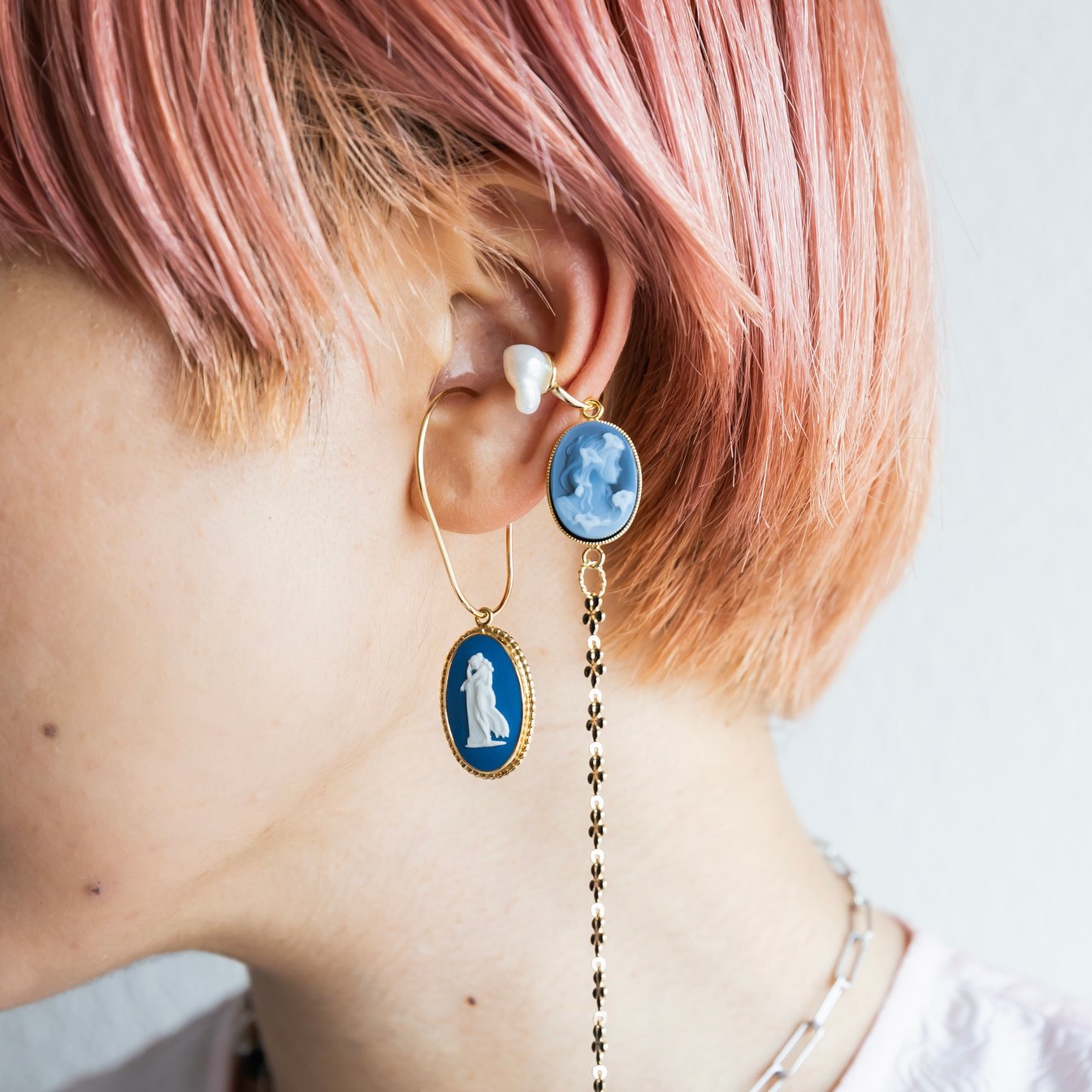 「ウェッジウッド」のカメオを使用したイヤーカフは、貴和製作所で購入した「メタルリング ビーンズ」を丸カンに通すだけで完成。ビーンズ型の「メタルリング ビーンズ」はイヤーカフ用のパーツではありませんが、痛みなく着用することができました◎