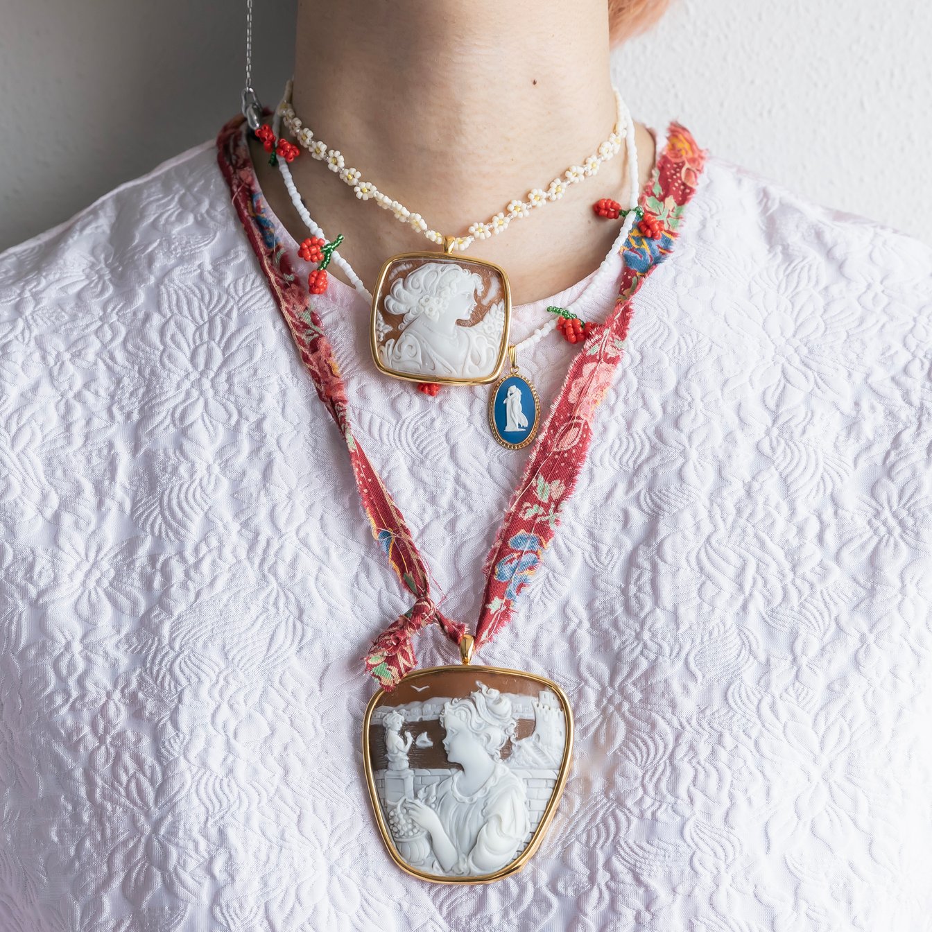 カメオとは、一般的にメノウや大理石、貝殻などに浮き彫りを施した工芸品を指します。神話のモチーフや女性の横顔のデザインが多く、アンティークなムードは今のトレンドにもマッチ。アレッサンドロ・ミケーレ(Alessandro Michele)がカメオリングをよく着用していたり、「トムウッド(Tom Wood)」や「フェリアン(FERIAN)」のカメオアクセサリーに注目が集まるなどじわりトレンドの予感。