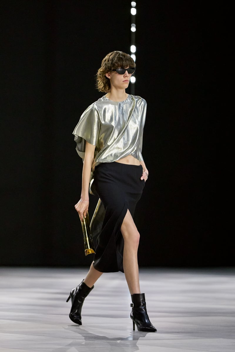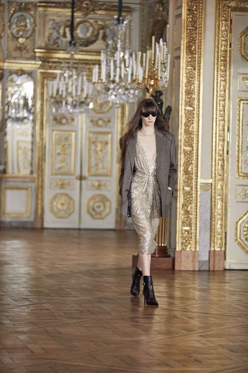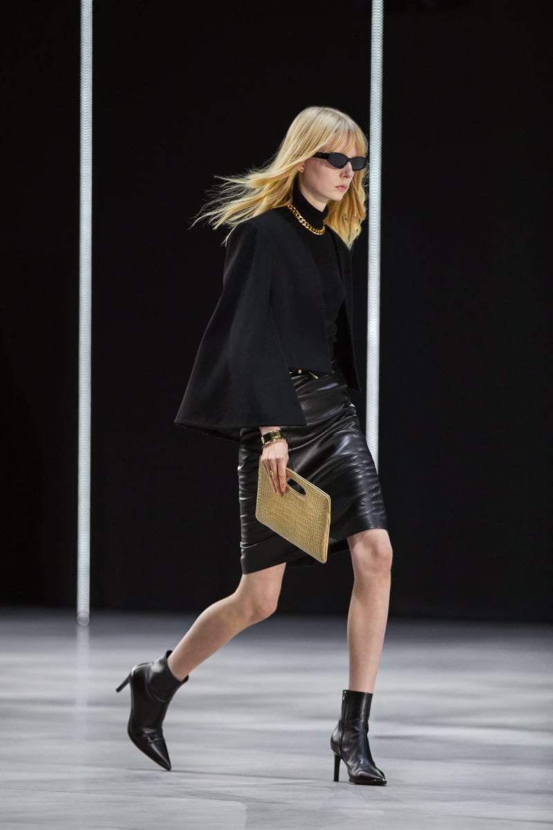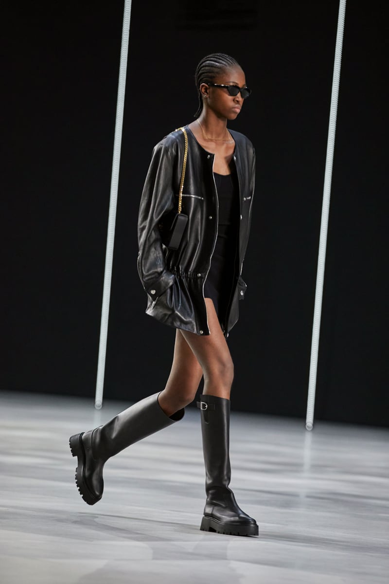 もちろん、エディならではのロックイズムも健在。ゴールドのショートネックレスや黒のサングラス、シャープなヒールが特徴の新作ブーツ「セリーヌ・ヴェルヌイユ(CELINE VERNEUIL)」など、辛口でセクシーな小物使いも印象的だ。ラグジュアリーなレザーピースの数々も、グラムな魅力を放っていた。