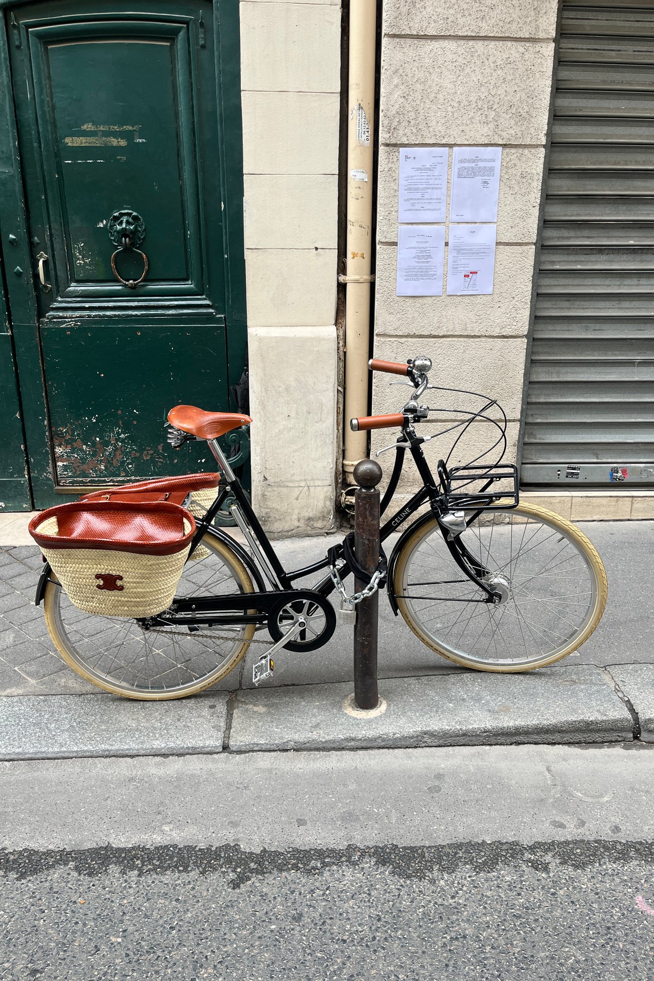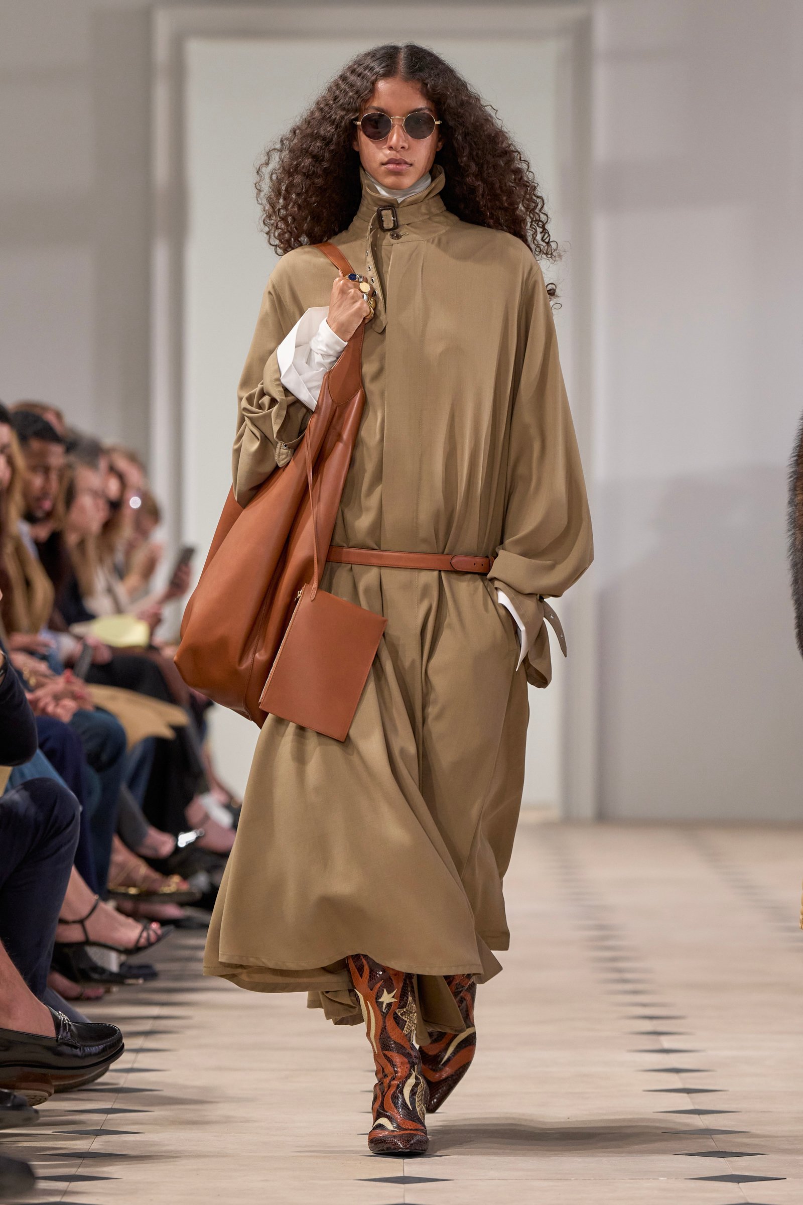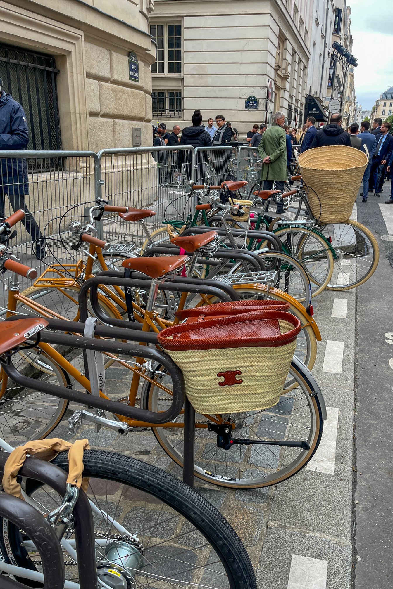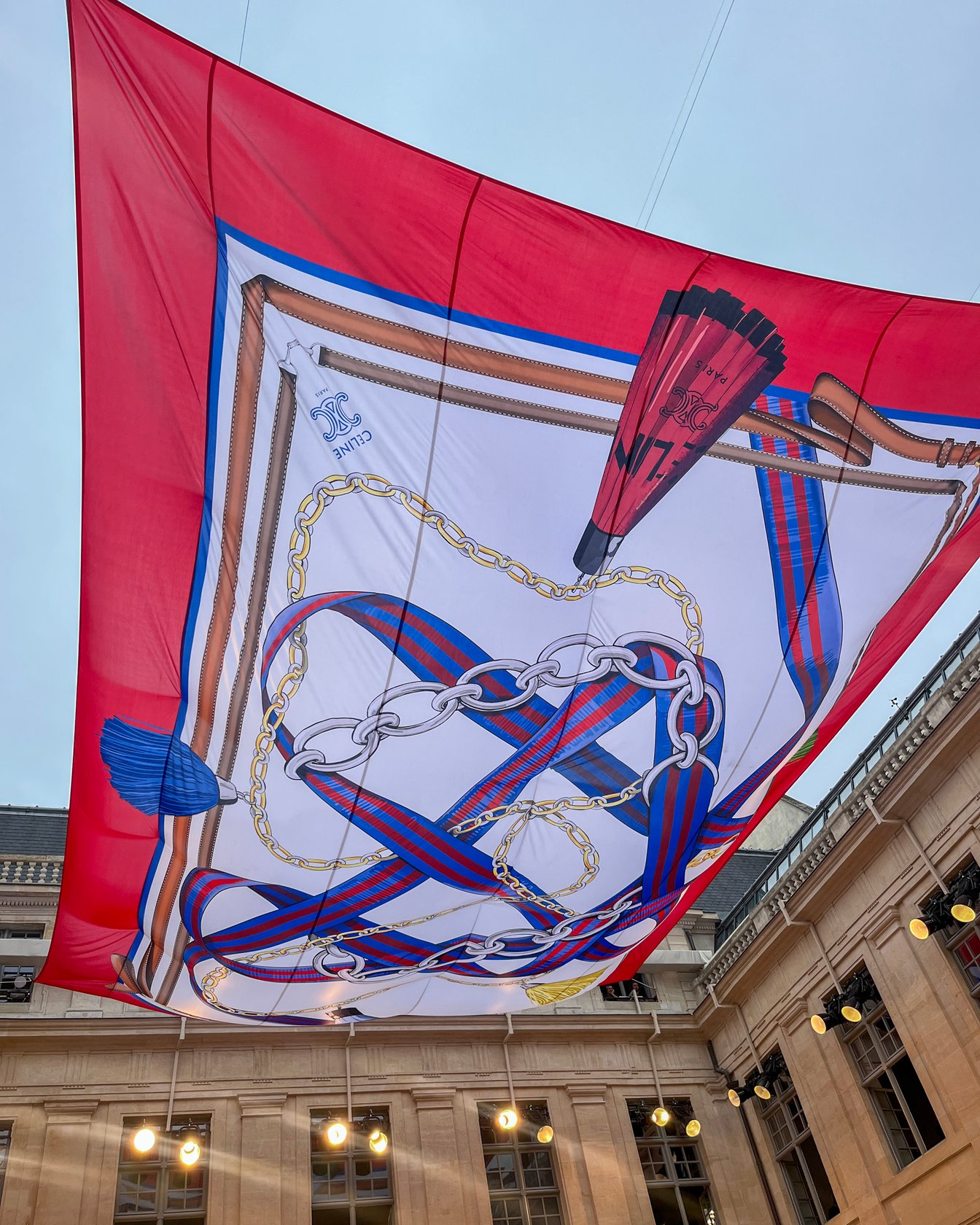 ショー会場となったパリのセリーヌ本社は、入口前の通りが封鎖され、道路脇にはセリーヌロゴ入りの自転車がずらりと並んでいた。中庭の吹き抜けには、巨大なスカーフが帆を張るように設置され、柔らかで軽やかな演出はブランドの新たな船出を予感させる。