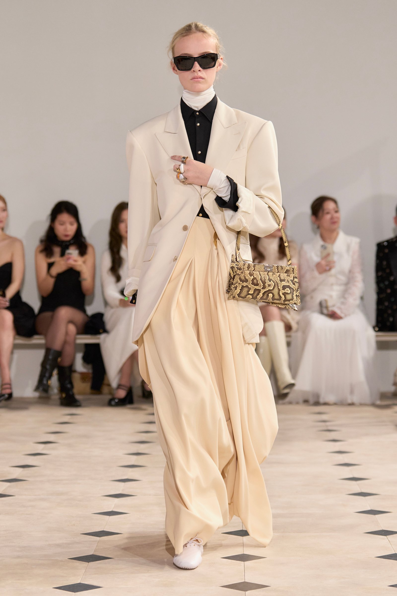 今回のショーでは、72人のモデルたちが足早にランウェイを歩き、ひとつの強いヴィジョンを打ち出すというよりは、多様なスタイルが提示された。パッド入りの力強いショルダーラインにウエストが絞られたテーラリング、重ね付けされたアクセサリー、ピタリとしたスキニーパンツ。シャープなカッティングに大胆なドレーピング、フィービーが描いた都会的で先進的な女性像の気配もあれば、エディによる70年代フレンチ・ブルジョワジーやロックの精神も息づいている。