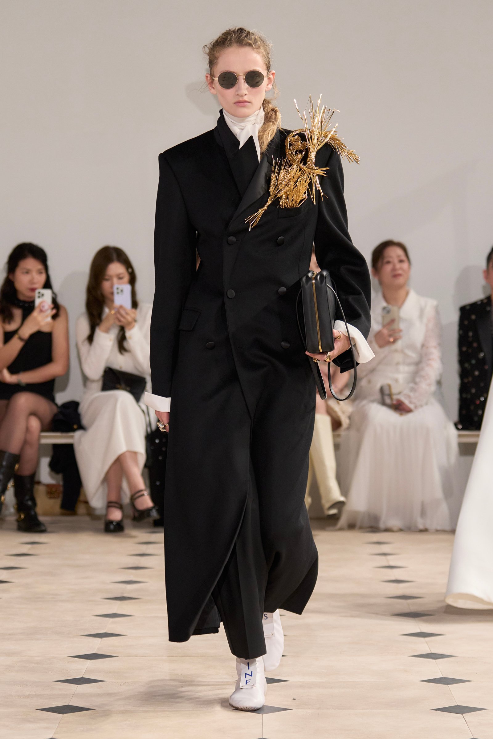 では、今回見られたマイケルらしさとは? なんでもこなせる器用さは見ての通り。アイテムとしては、ある種の外しとして機能したコンバット風ブーツやレザージャンプスーツ、ジョッパーズパンツ、ミリタリージャケット、花のビーズ刺繍があしらわれたデニムパンツ、ストローハットと合わせた優雅な白のドレス。ロング丈のコートやジャケットの背面には深いスリットが入り、動きを強調するディテールが光っていた。