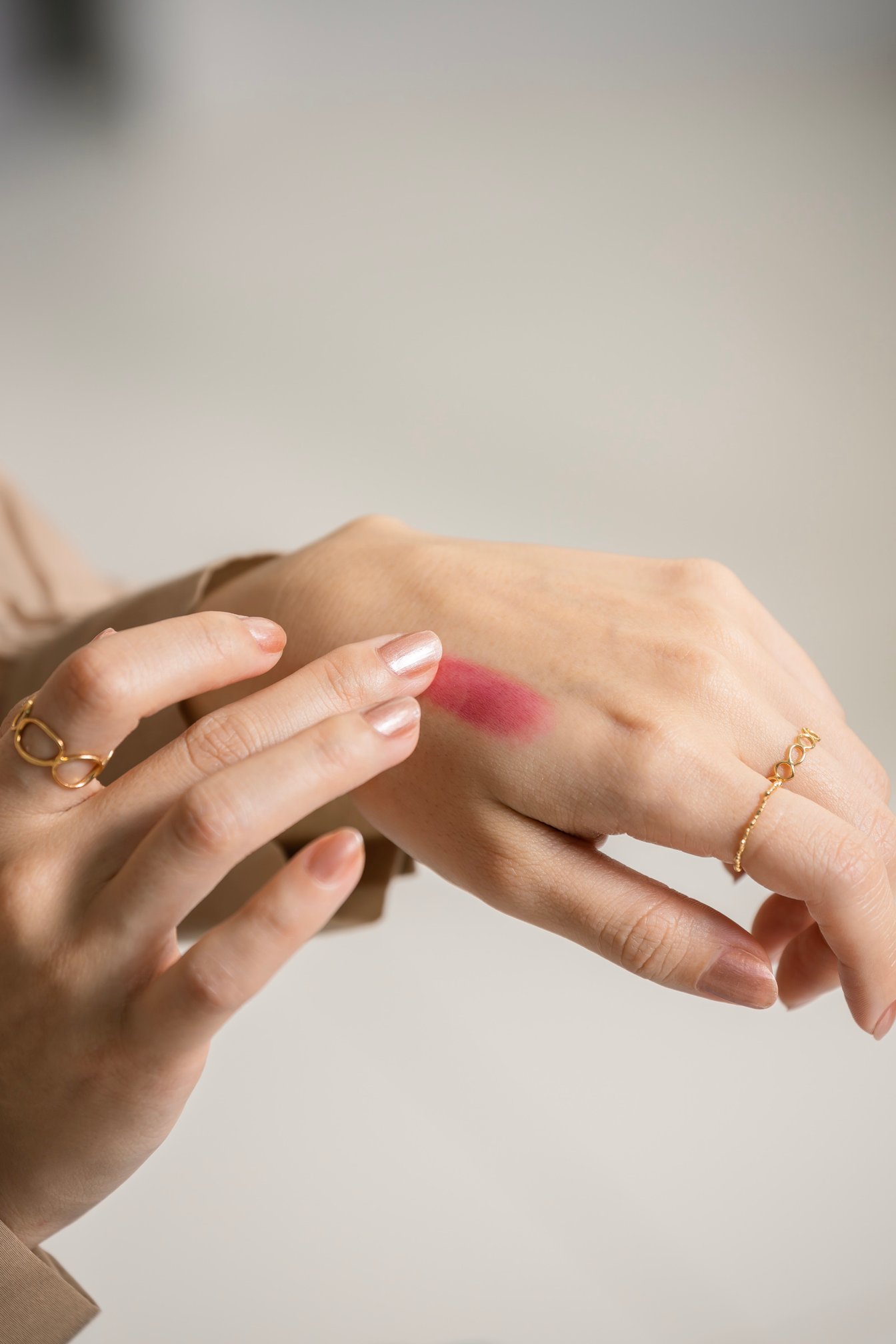 今つけているのがヴァイタル ベージュ。個人的に一番好きな色で、ヘビロテすると思います。程よいピンクの中にしっかりベージュの要素があって、深みもあるので本当に使いやすいカラーだなって。チークは頬骨から縦に伸ばすようになじませて塗っていて、そうすることで顔の中心に色が集まってメイクがまとまるし、リップカラーとの統一感でこなれた印象になるんです。