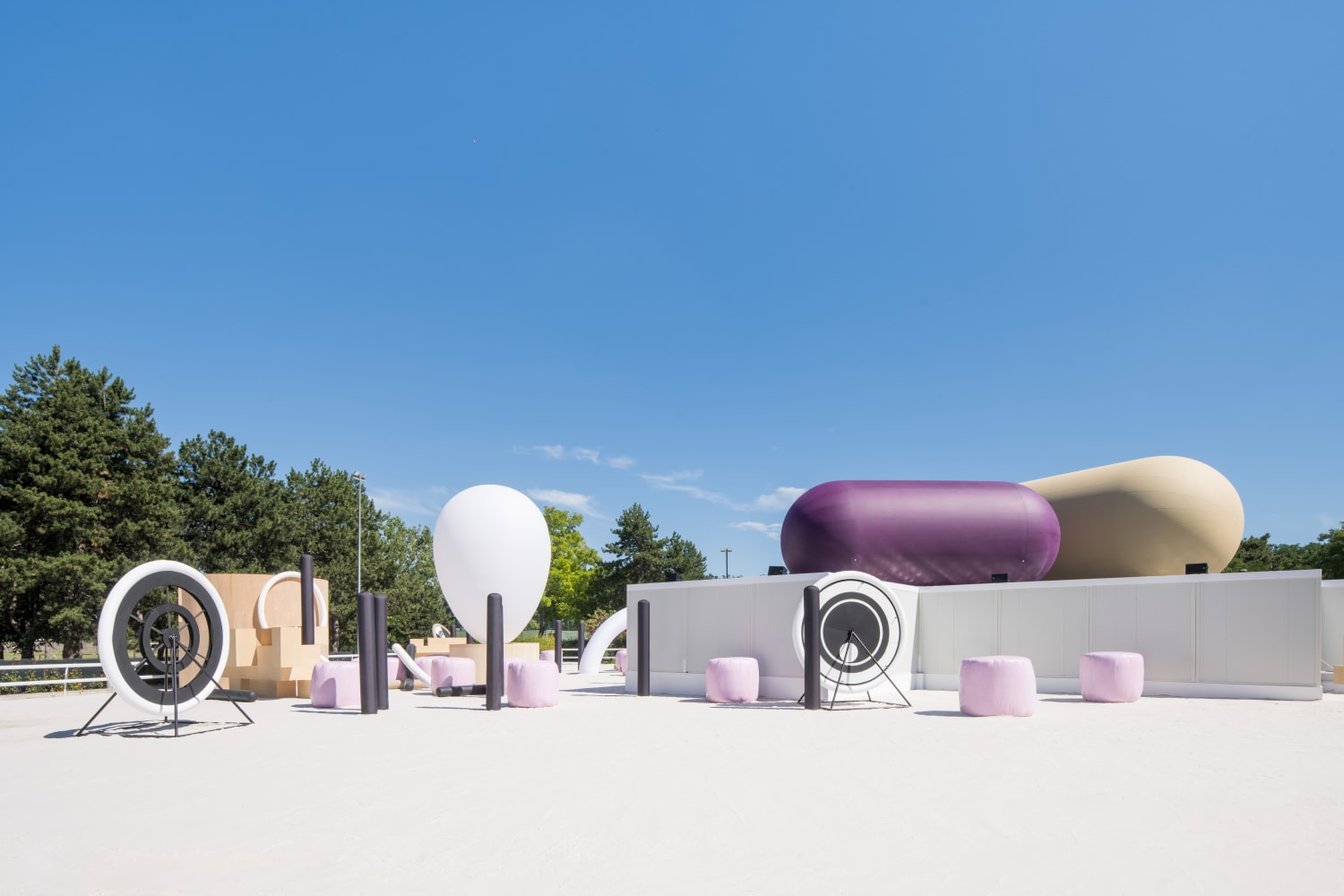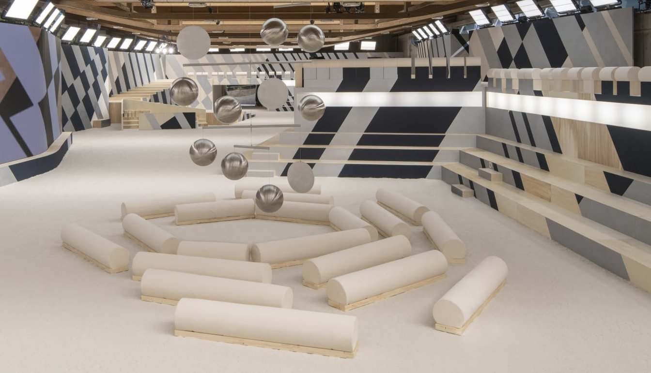 美術セットは、アーティストのグザヴィエ・ヴェイヤン(Xavier Veilhan)がデザイン。アンディ・ウォーホル(Andy Warhol)が制作拠点としていたニューヨークのスタジオ「シルバーファクトリー(Silver Factory)」が着想源の一つとなり、天井には銀色の球体オブジェがいくつも吊り下げられていた。視覚的なカモフラージュからインスピレーションを得たストライプやシェイプが壁面をグラフィカルに彩っている。