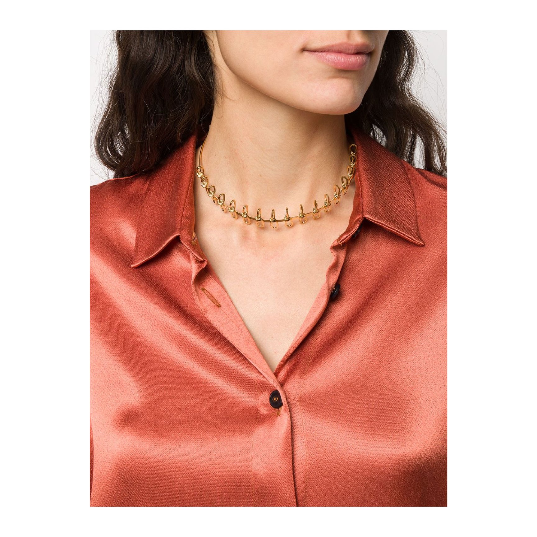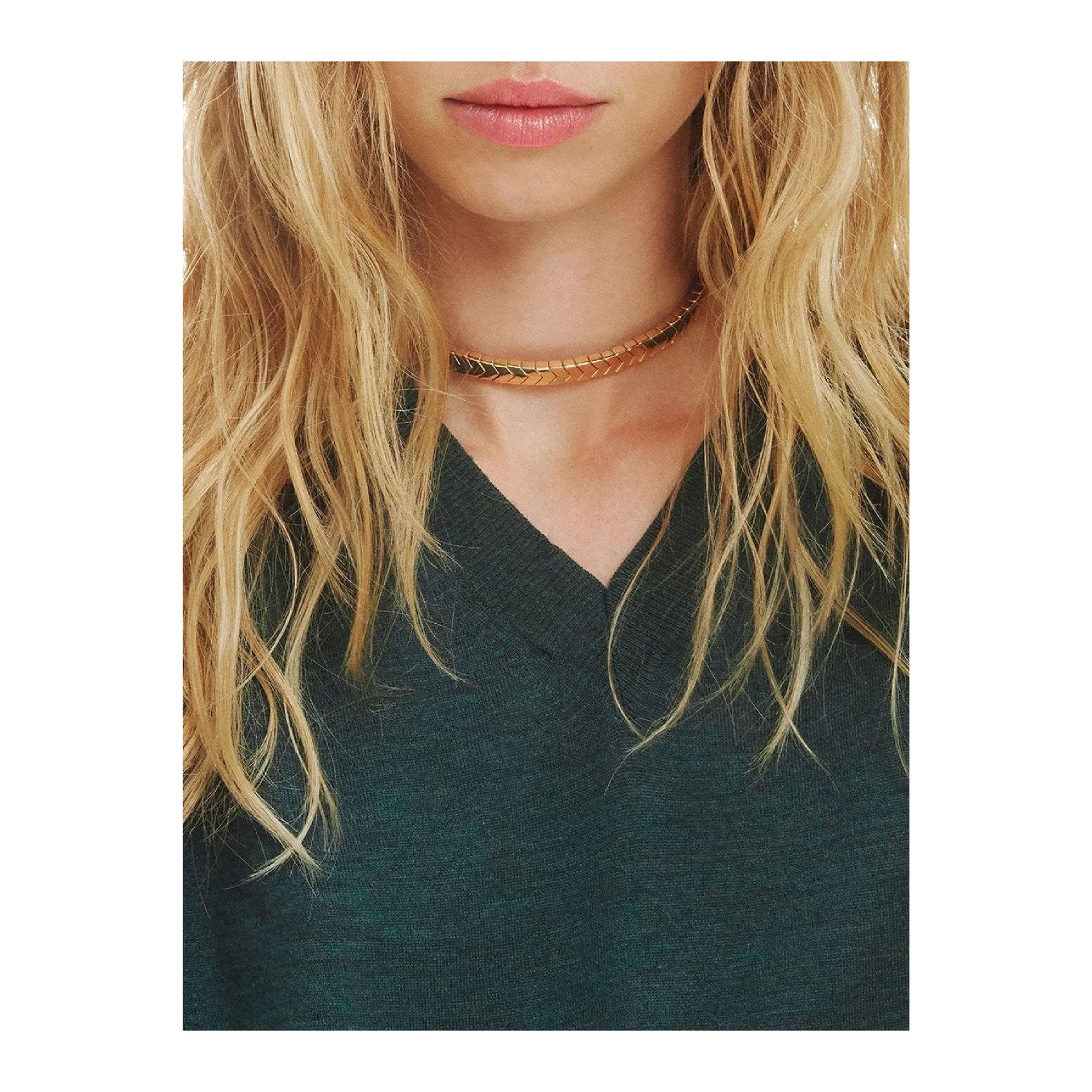 「アネリス ミシェルソン(Annelise Michelson)」のゴールドチョーカーは、ポリッシュ加工による真鍮の美しい輝きと独特なデザインが特徴。一見シンプルながらも、こだわりのディテールがインパクトをプラスします。