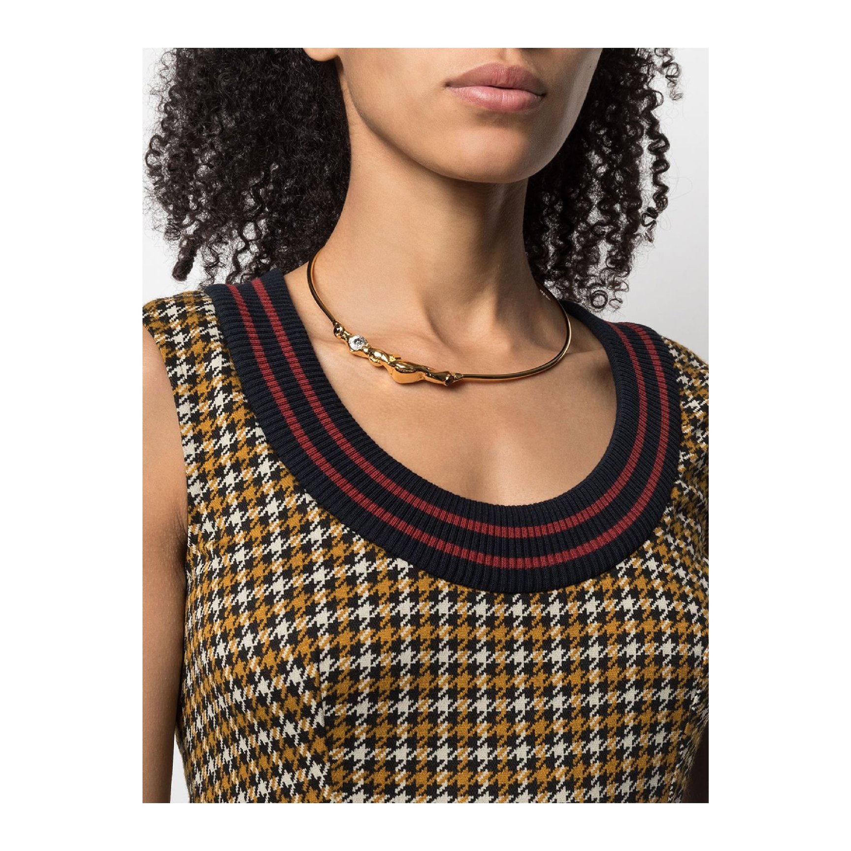 真鍮の美しい輝きを首元にプラスしてくれるのが、「マルニ(MARNI)」のラウンドシェイプチョーカー。中に埋め込まれているクリスタルが高級感あるルックを演出。マルニらしい独特なワンポイントデザインが、シンプルなコーディネートによく映えます。