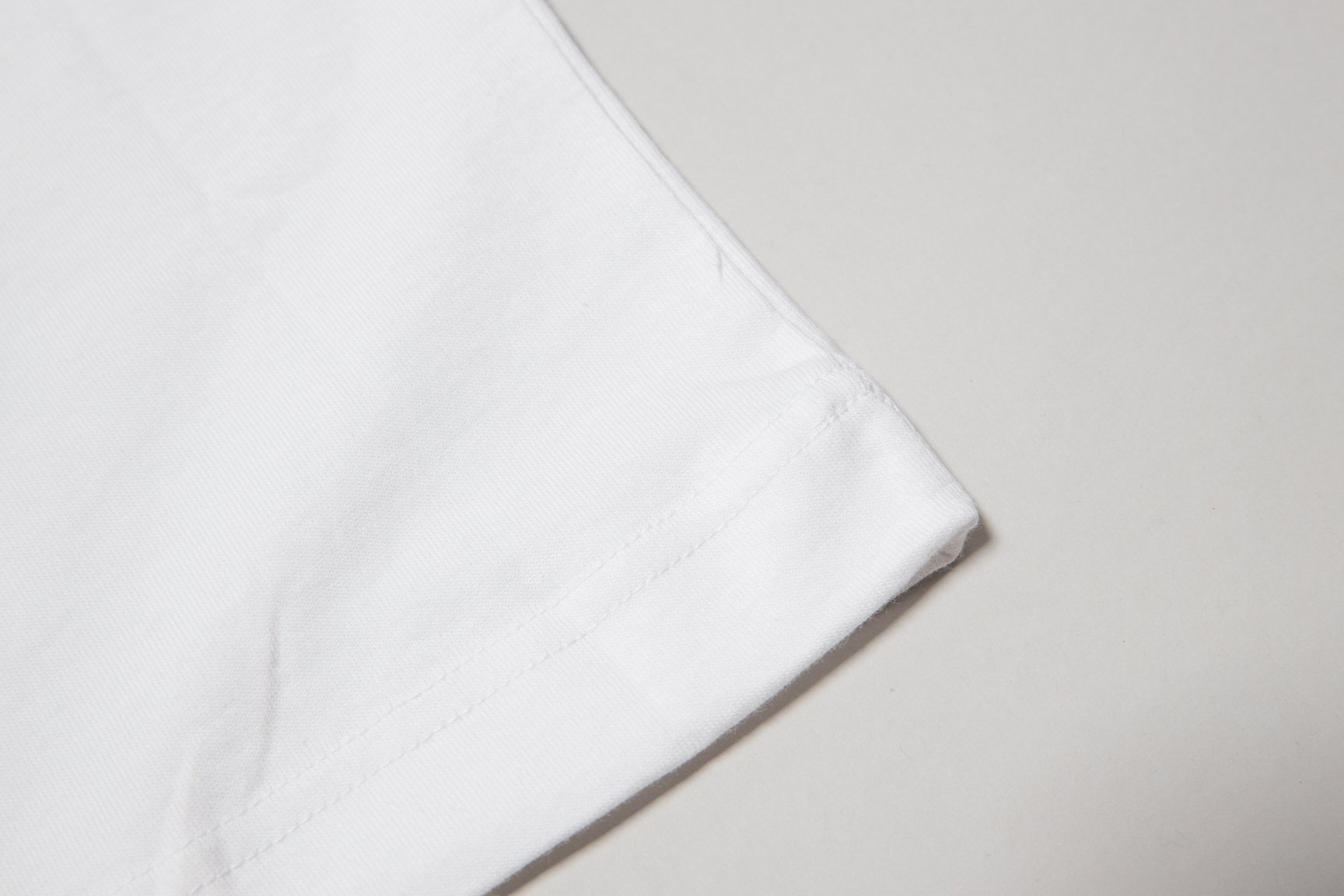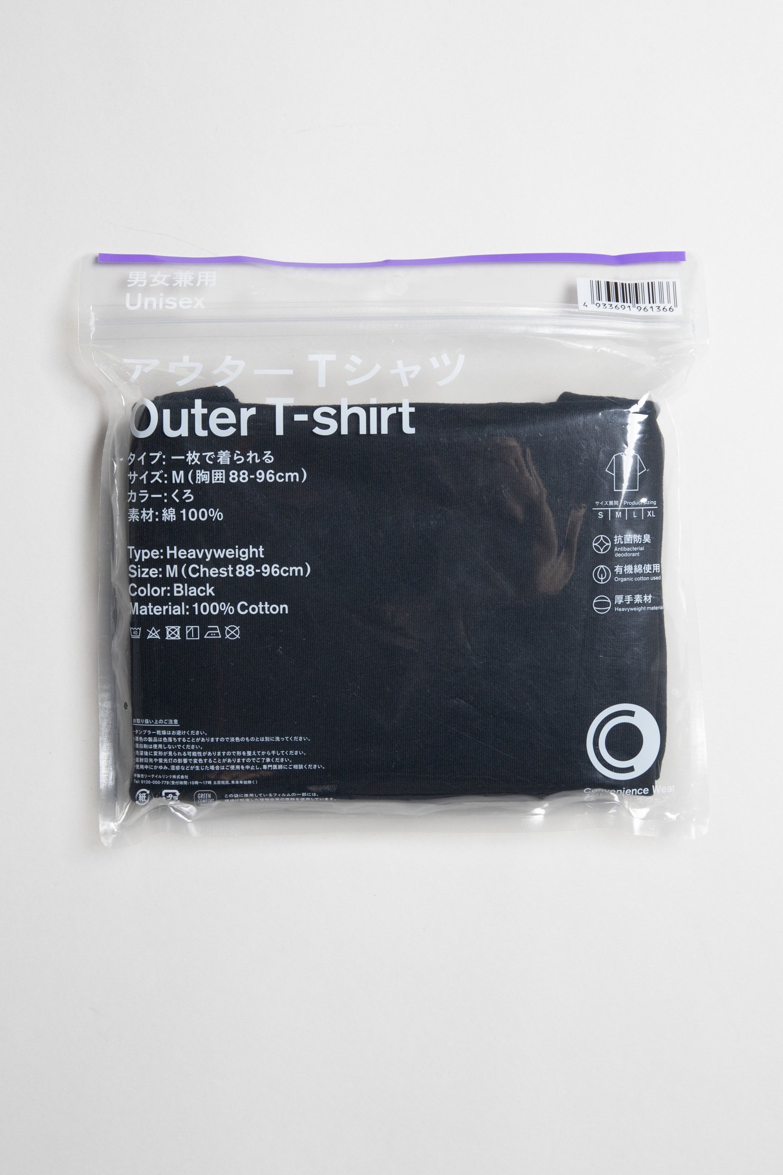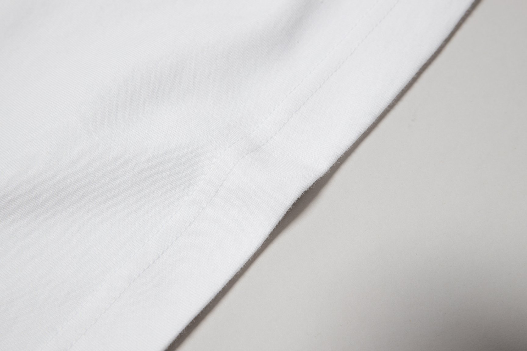 クルーネックで首元にはコンビニエンス ウェアのロゴや、サイズ表記、取り扱い絵表示をプリント。首のリブ幅は2cmで平均的な太さでした。厚手仕様で、商品名の通り1枚で着られるアイテム。インナーTシャツをメインに展開しているコンビニでアウターTシャツは珍しく、白T好きには是非試してもらいたい一枚です。