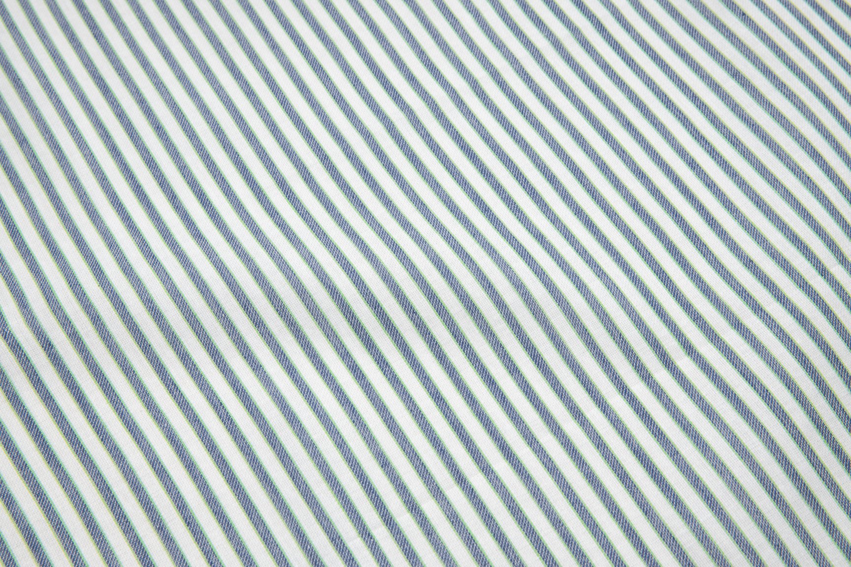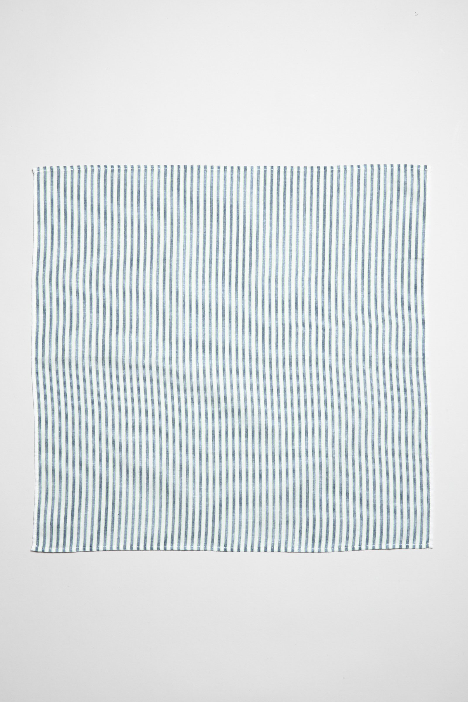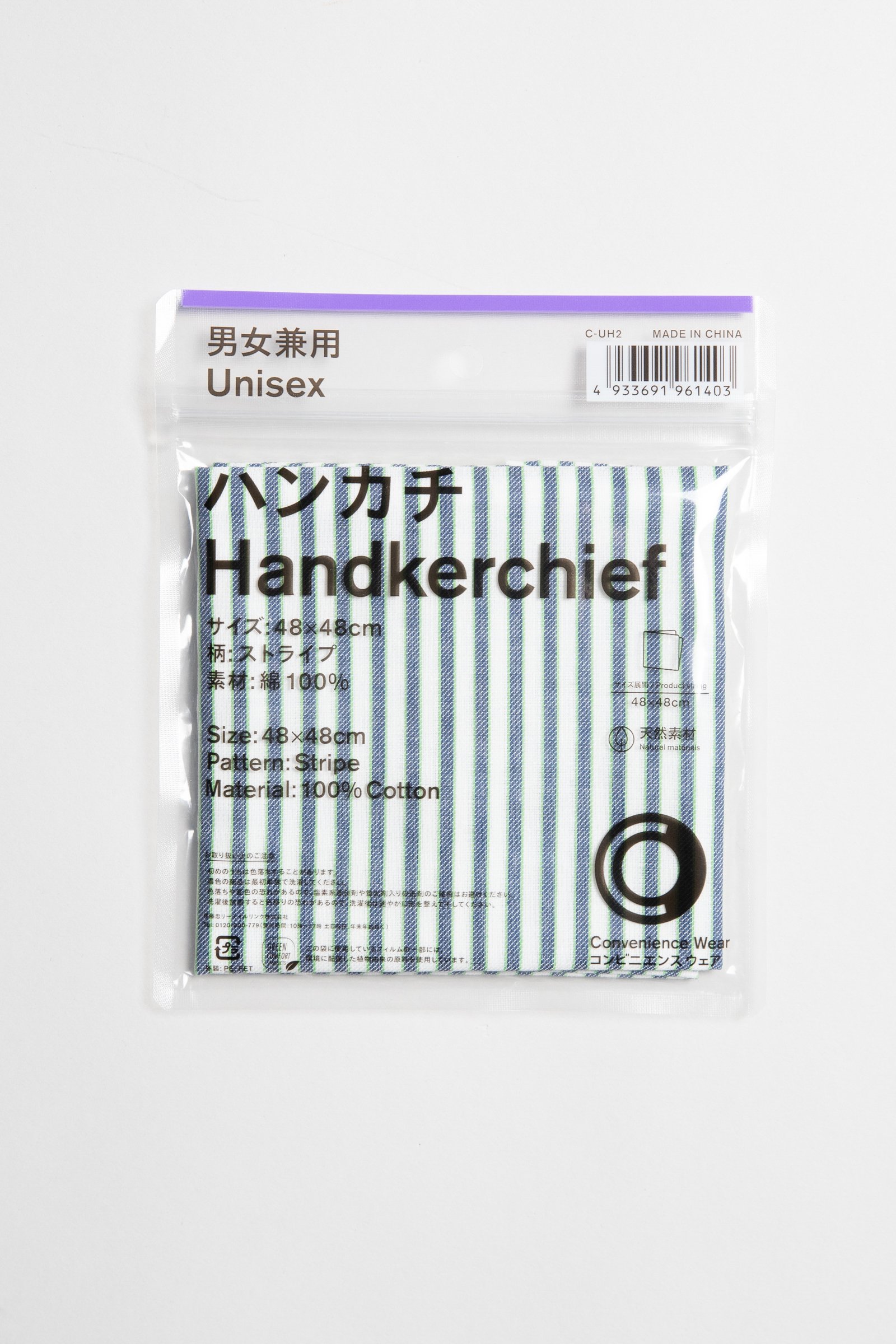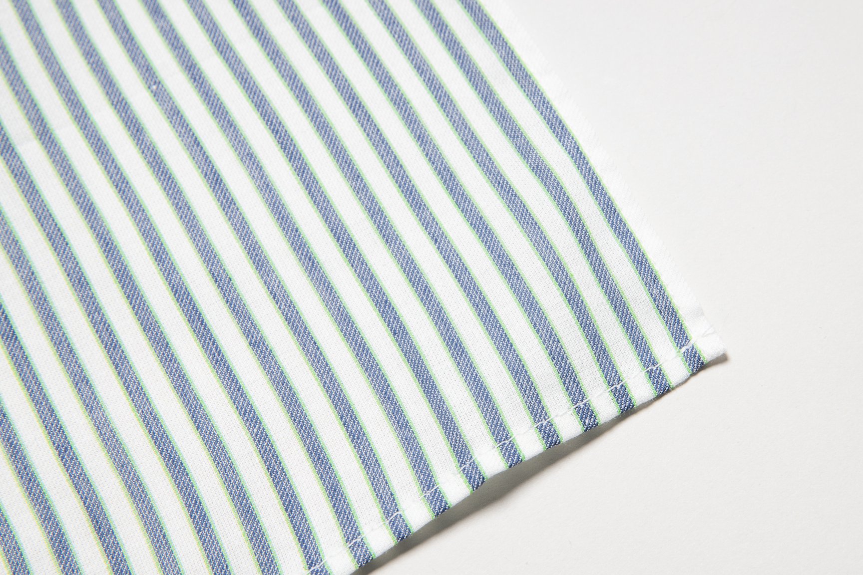 コットン100%のハンカチ。ブルーとグリーン、ホワイトのラインのストライプ柄で、落ち着いたデザインに仕上げられています。