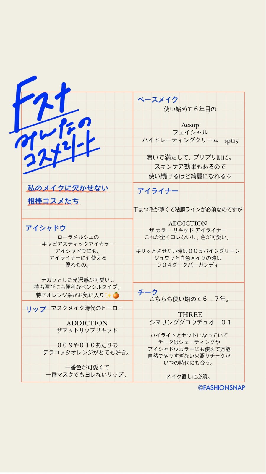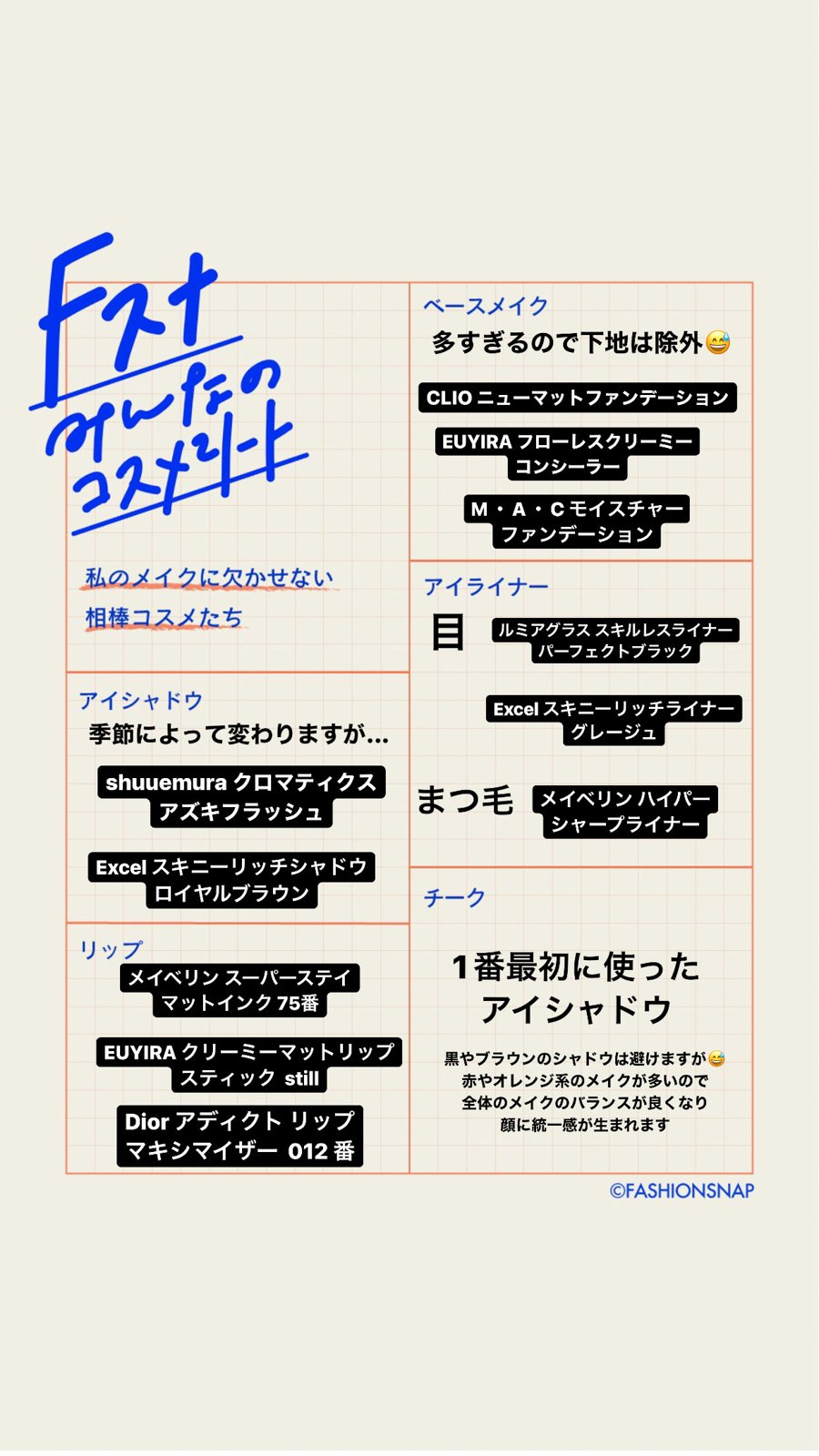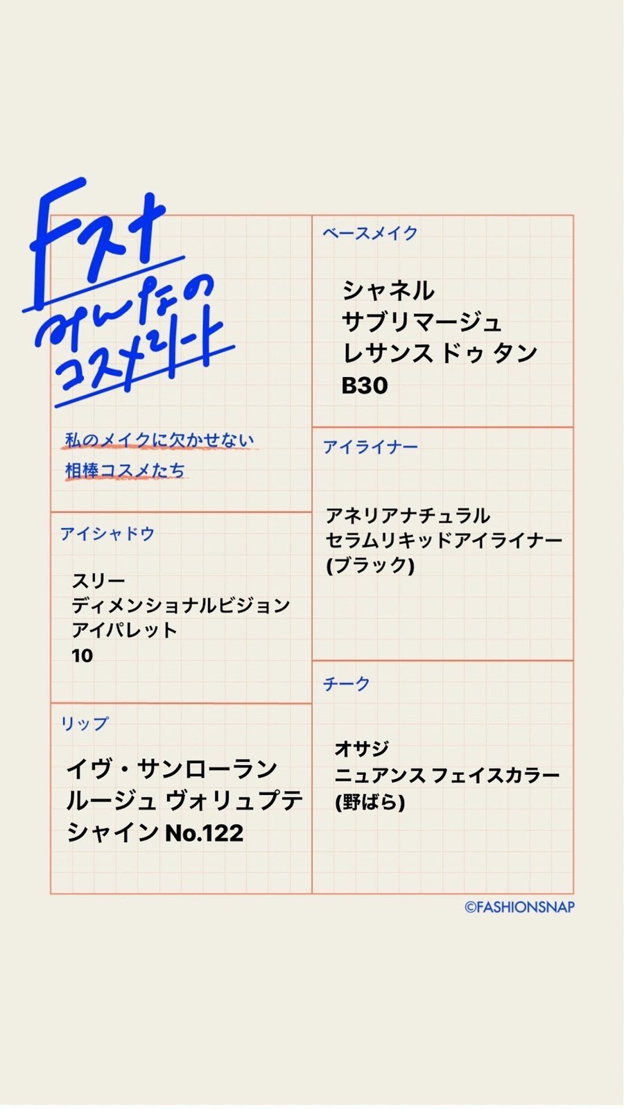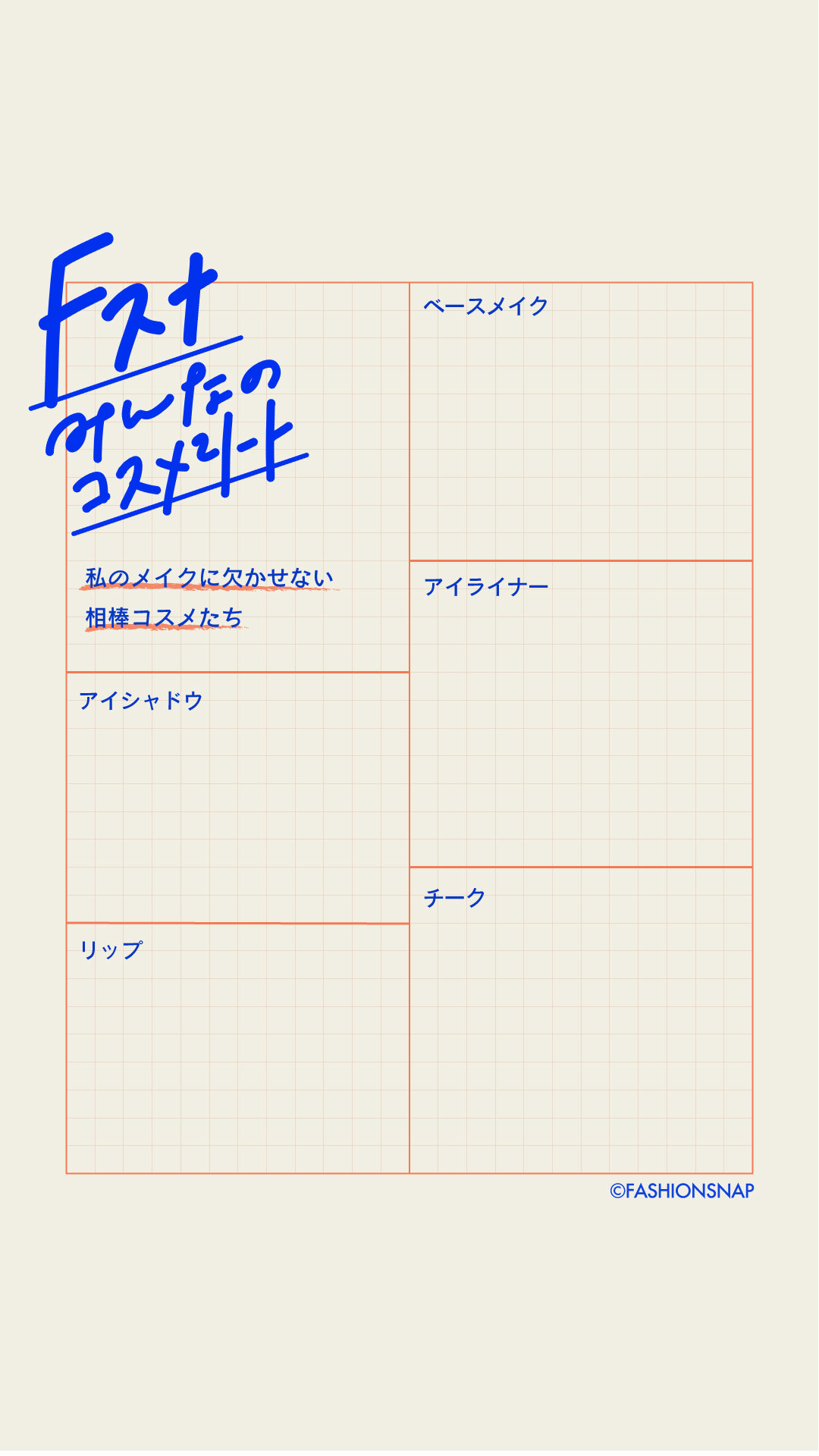 コスメが好きな人はどんなアイテムを使ってるんだろう?逆にコスメが好きな人は、自分が使って良かったコスメをもっと知ってほしい!コスメに対してあくなき探究心を持つからこそ、そんな風に思うもの。そこで、FASHIONSNAPでは「Fスナ みんなのコスメシート」を作成しました。TwitterやInstagramの投稿に使って、是非コスメ好きの輪を広げて下さい!ここではFASHIONSNAPが今気になるビューティパーソンにお願いしたコスメシートを紹介。それぞれの視点で選んだコスメは参考になること間違いなし!