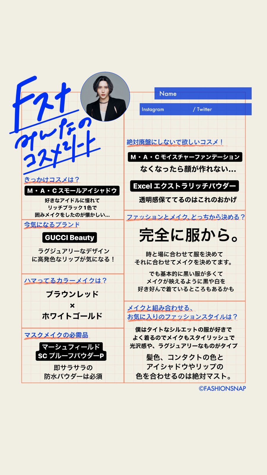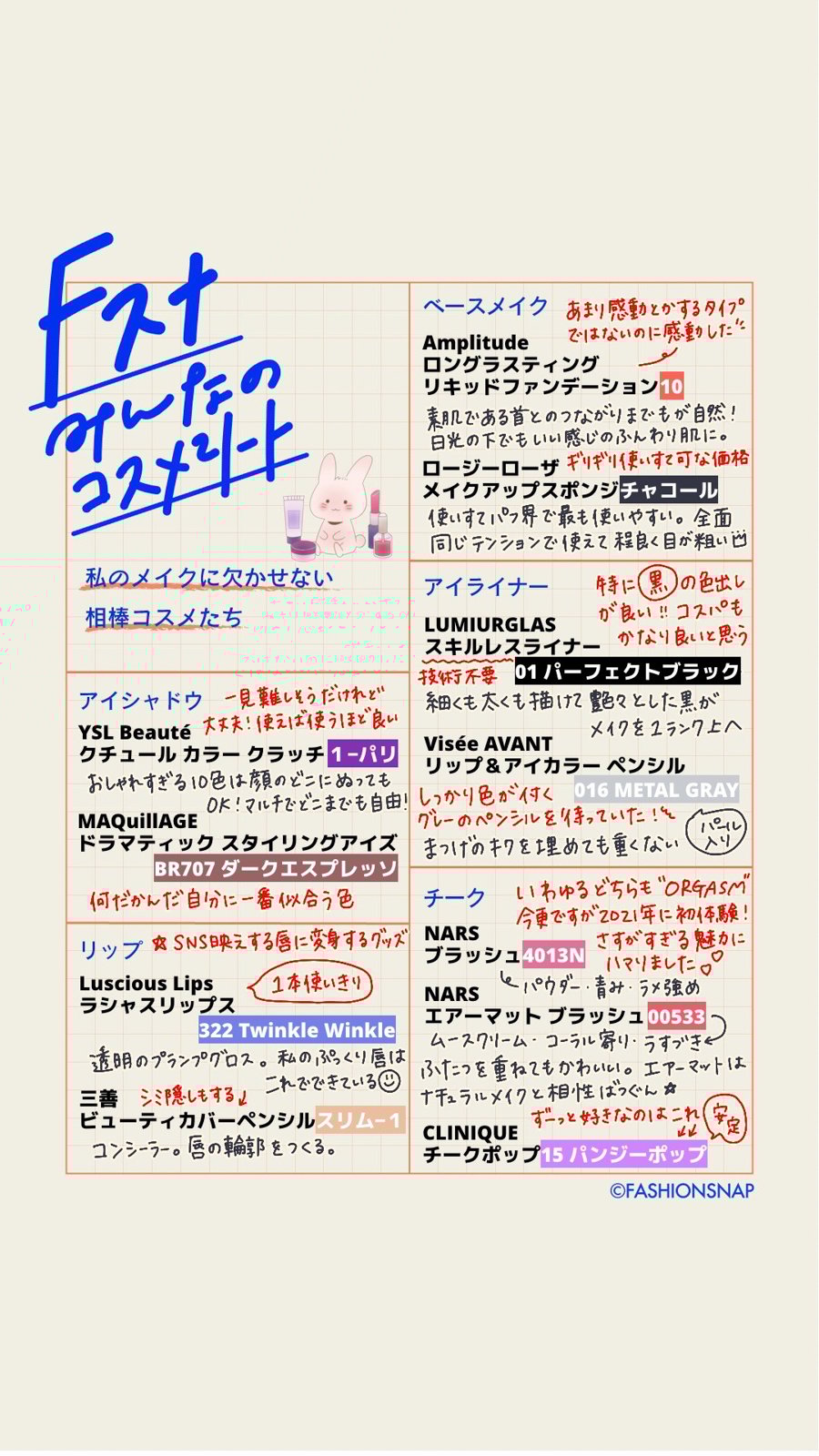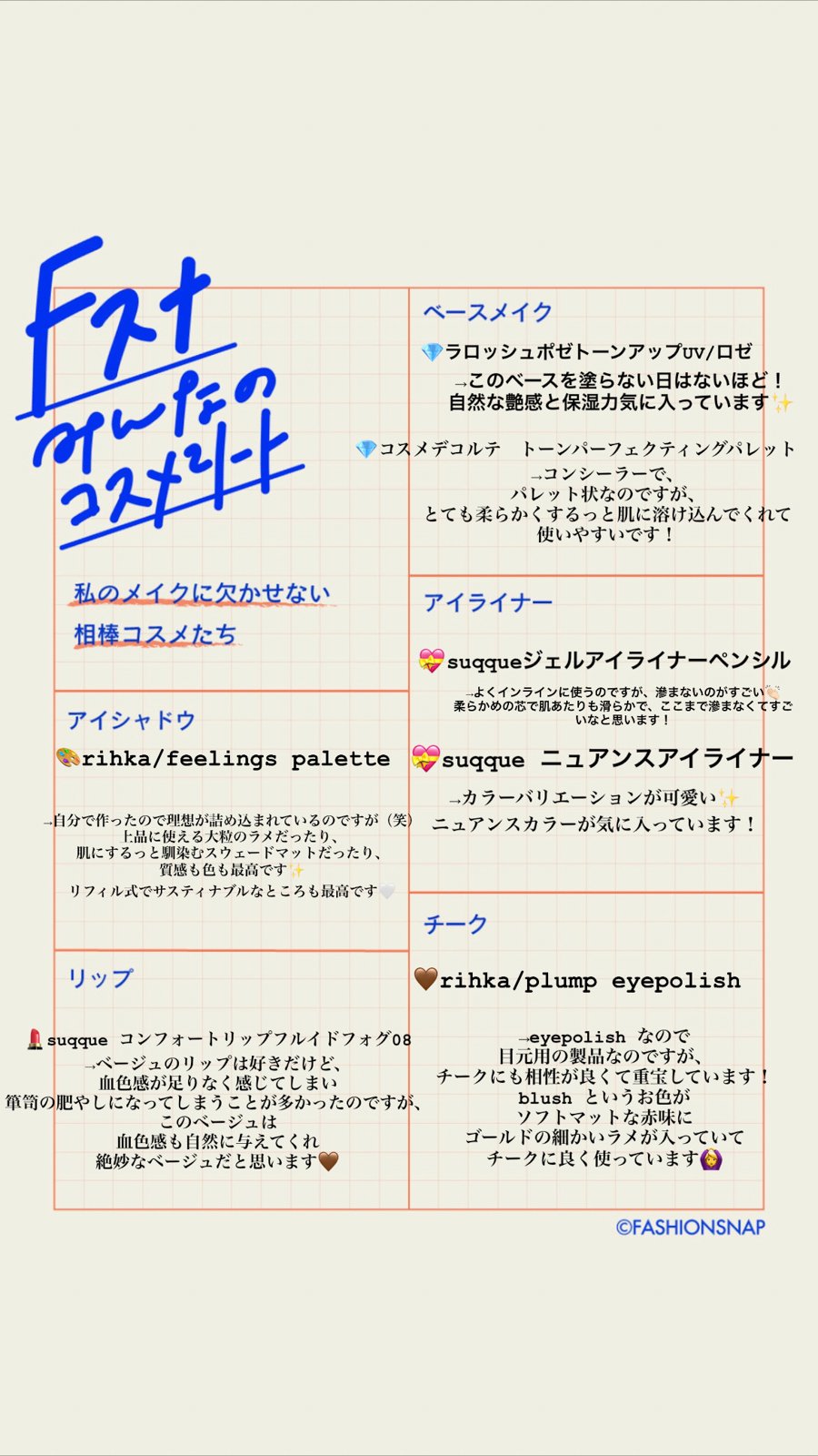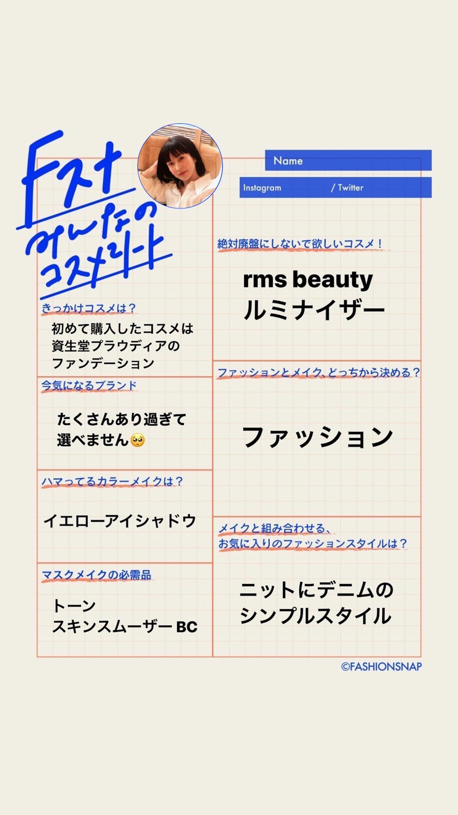 コスメが好きな人はどんなアイテムを使ってるんだろう?逆にコスメが好きな人は、自分が使って良かったコスメをもっと知ってほしい!コスメに対してあくなき探究心を持つからこそ、そんな風に思うもの。そこで、FASHIONSNAPでは「Fスナ みんなのコスメシート」を作成しました。TwitterやInstagramの投稿に使って、是非コスメ好きの輪を広げて下さい!ここではFASHIONSNAPが今気になるビューティパーソンにお願いしたコスメシートを紹介。それぞれの視点で選んだコスメは参考になること間違いなし!