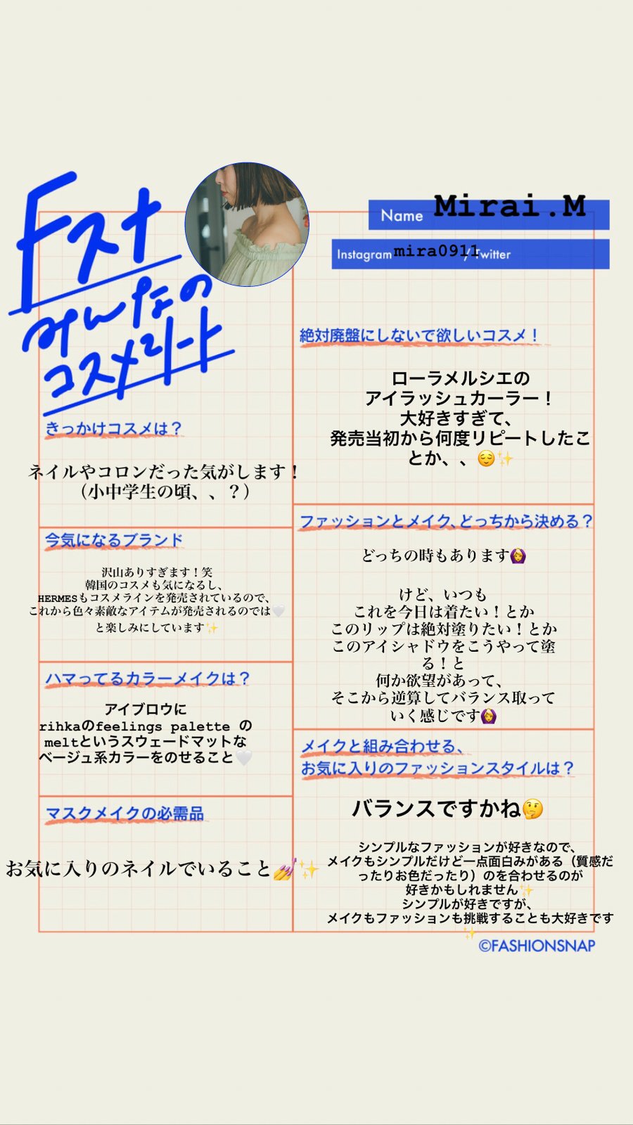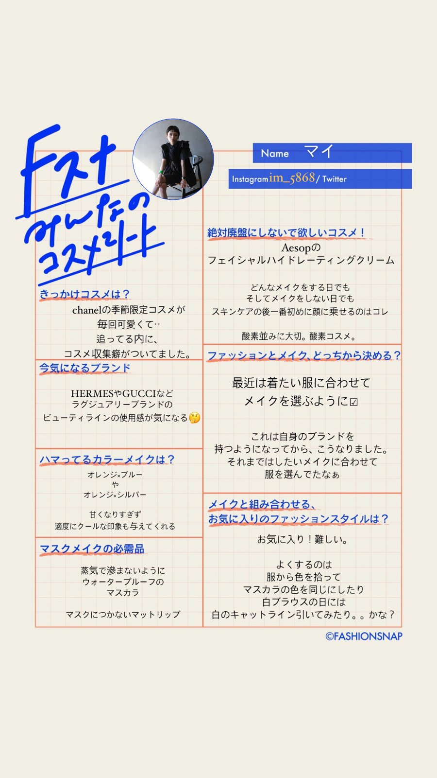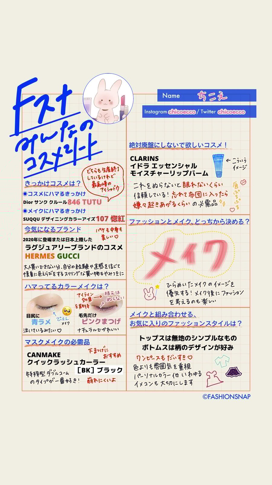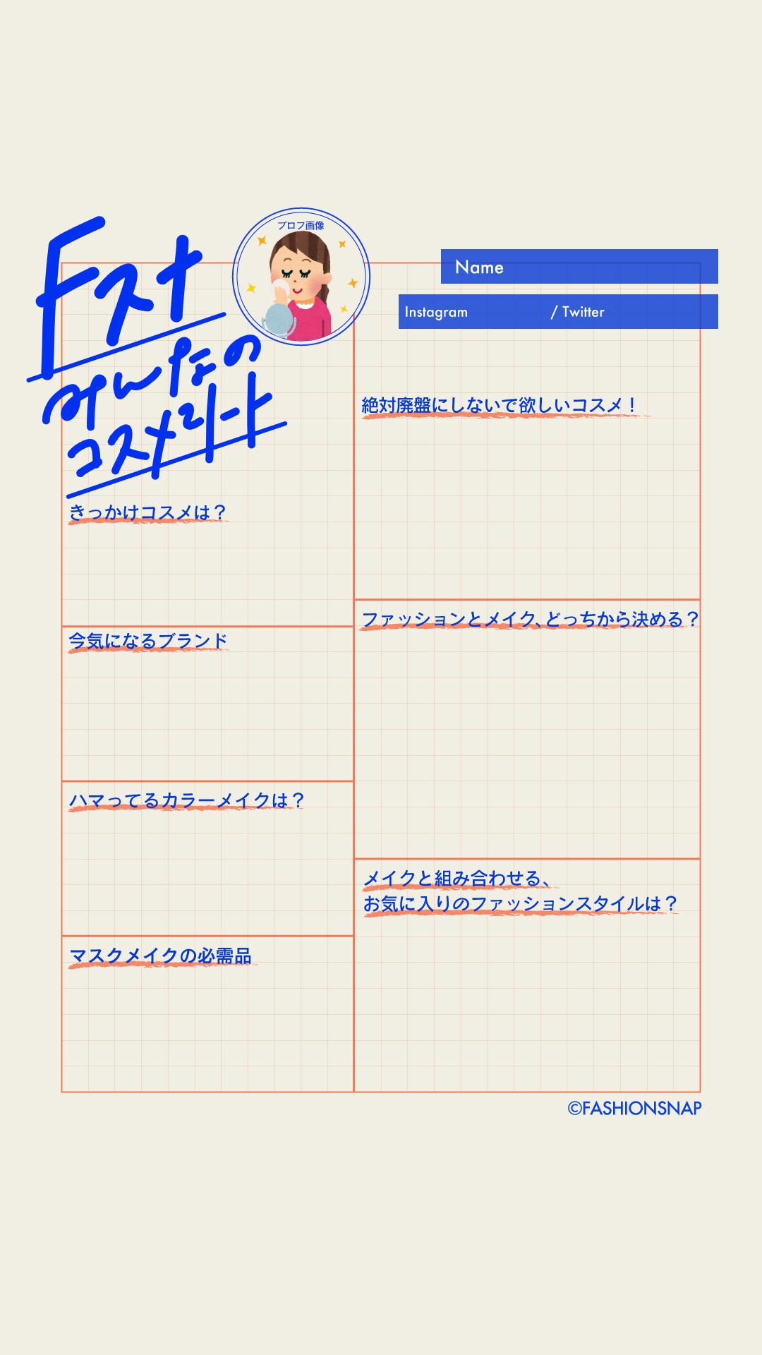 コスメが好きな人はどんなアイテムを使ってるんだろう?逆にコスメが好きな人は、自分が使って良かったコスメをもっと知ってほしい!コスメに対してあくなき探究心を持つからこそ、そんな風に思うもの。そこで、FASHIONSNAPでは「Fスナ みんなのコスメシート」を作成しました。TwitterやInstagramの投稿に使って、是非コスメ好きの輪を広げて下さい!ここではFASHIONSNAPが今気になるビューティパーソンにお願いしたコスメシートを紹介。それぞれの視点で選んだコスメは参考になること間違いなし!
