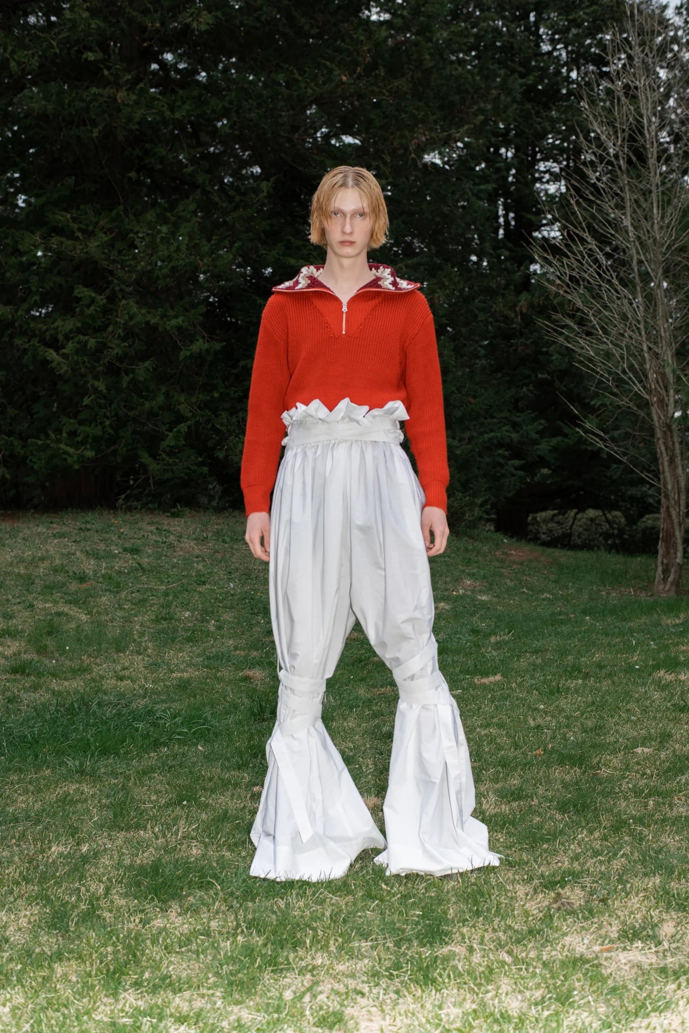 思いつきです、、、。(ハリーは)特別好きというわけではないんですけど、「今」の男性像の象徴だなと思っていて。彼が今年のグラミーでシルバーのジャンプスーツを着ていて、単純に楽しそうなもの、ハッピーなものっていいなって。今のメンズのレッドカーペットシーンはタキシードの文脈で進んできたものから大きく揺れ動いている。それがフェミニンな装いに振り切るわけでもなく。そこが面白いなと思って、その影響はあるかもしれません。