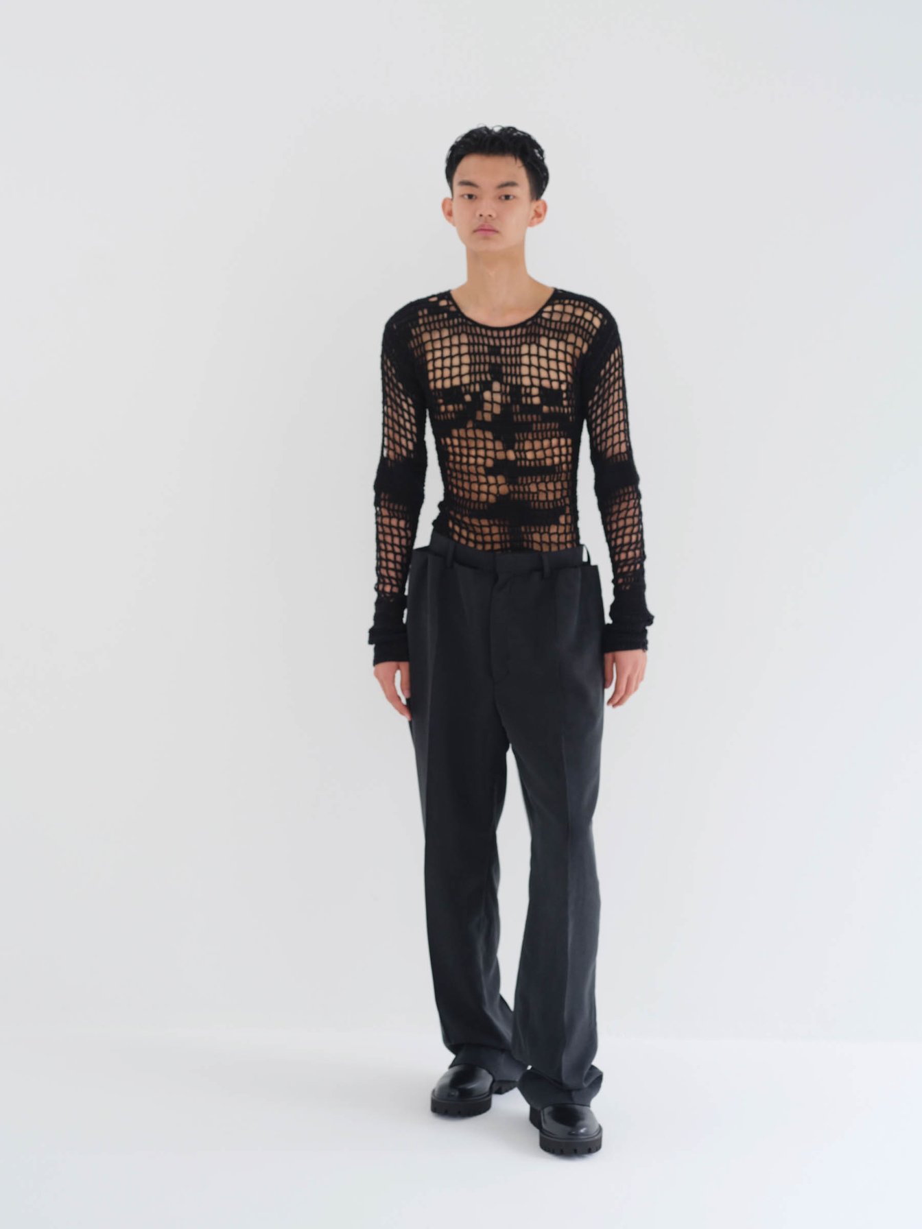 抽象的ですが「透け感」「エレガント」「モード」「キラキラ」など、自分の中にあったキーワードからです。フルスは一応メンズの文脈に載せたくて、例えばスパンコールをモヘアのトップスに編み込んだりして、キーワードを反映させていきました。