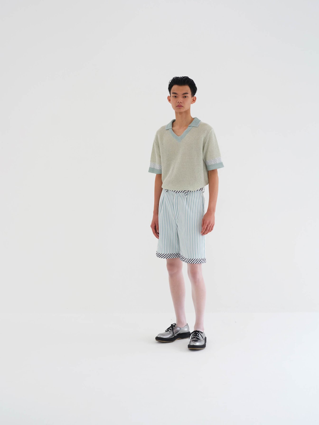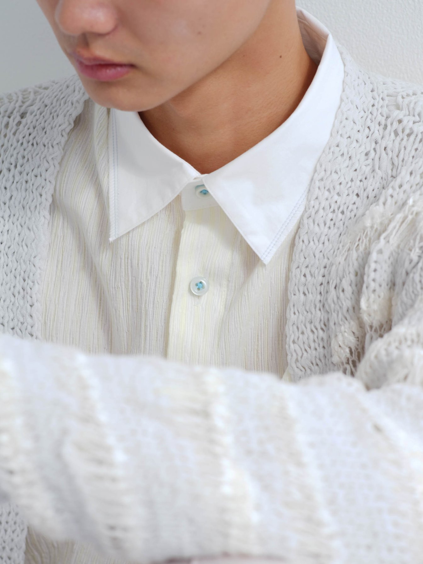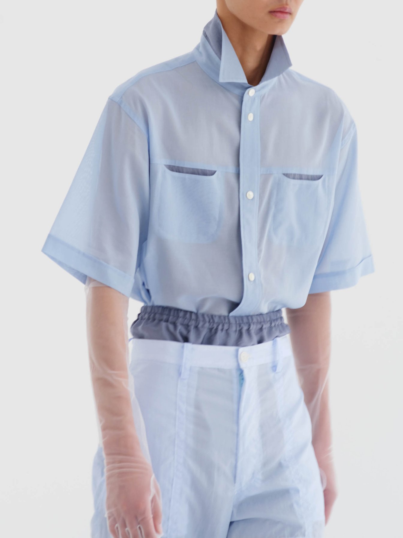 ー試着させてもらったブルーの半袖シャツも、ボックスシルエットに透け感のある生地のコントラストが面白かったです。ステイトメントには「結論の出ることのないグレーゾーンの世界を映し出したい」とあるように、カジュアルな要素は引き継がれつつ、キーワードに挙がった対照的な要素が生地やディテールから感じられるシーズンでした。