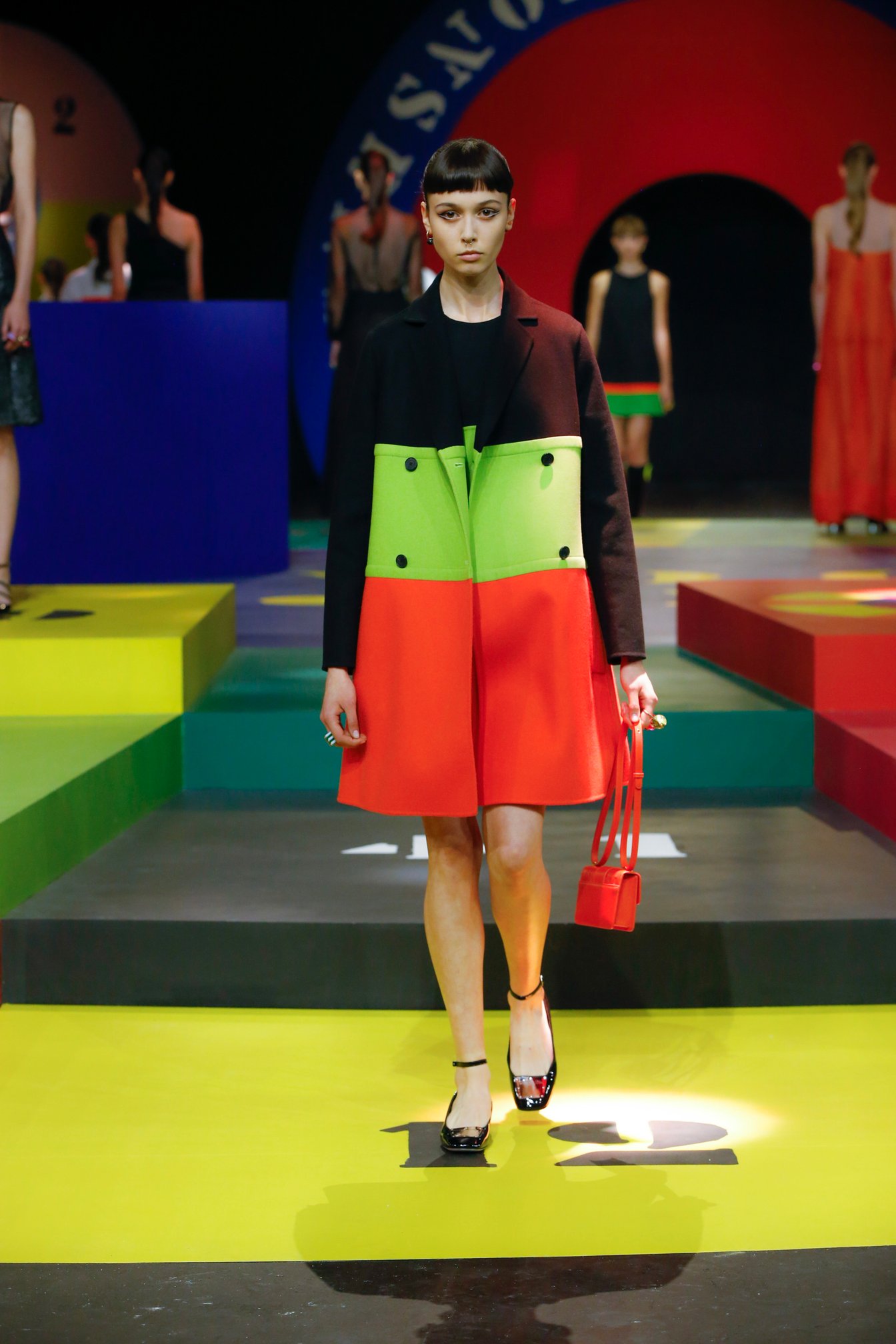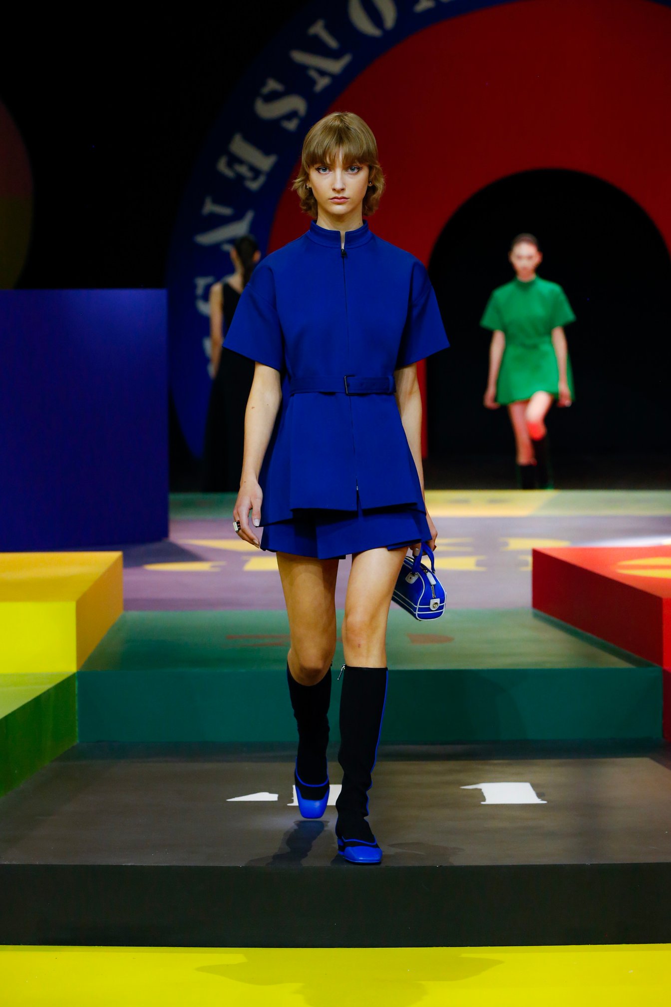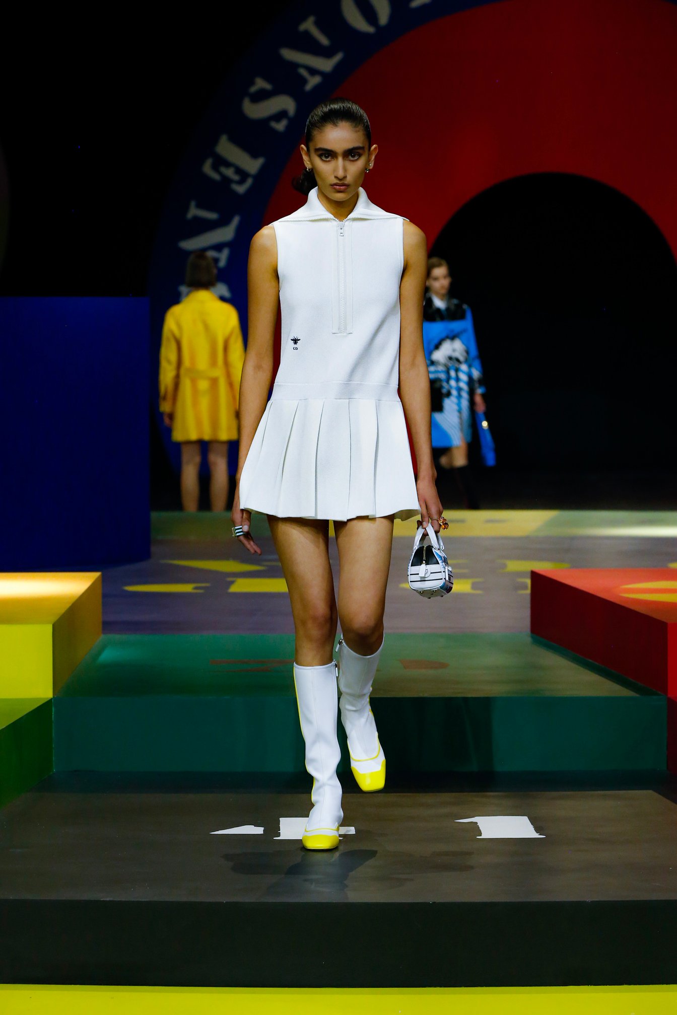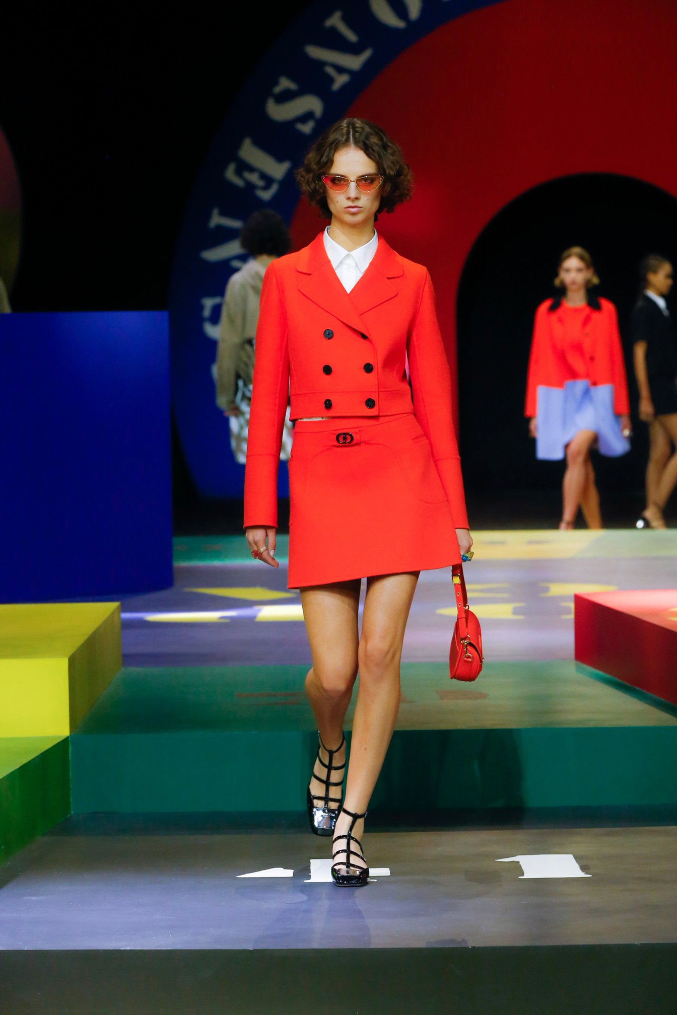 コレクションのインスピレーションとなったのは、ディオール3代目のアーティスティック ディレクターとして1960年から30年にわたってクリエイションを率いたマルク・ボアン(Marc Bohan)のアーカイヴ。1961年春夏コレクションで発表された「スリム・ルック」へのトリビュートとして、タイトなボックスシルエットのジャケットとミニスカートのセットアップや、ウエストを絞ったスタイリングが登場。モノトーンをはじめ2トーンや3トーンの鮮やかなカラーブロックも1960年代を彷彿とさせる。