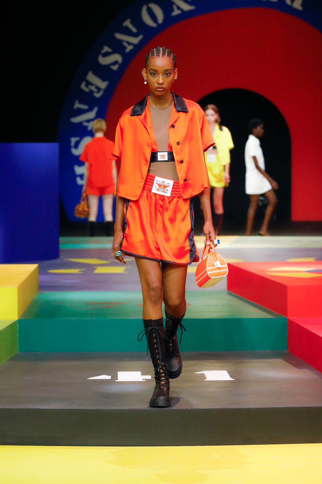 バッグはマイクロサイズが多く提案され、アイコン的な「レディ ディオール」や「30 モンテーニュ」などは、鮮やかなレッド、ピンク、イエローで彩られた。「ディオール ボビー」の丸みのあるデザインは、レクタンギュラー バージョンの「イースト ウエスト」バッグとして再解釈。また、スポーツテイストのマイクロバッグ「ディオール ヴァイブ」が発表された。