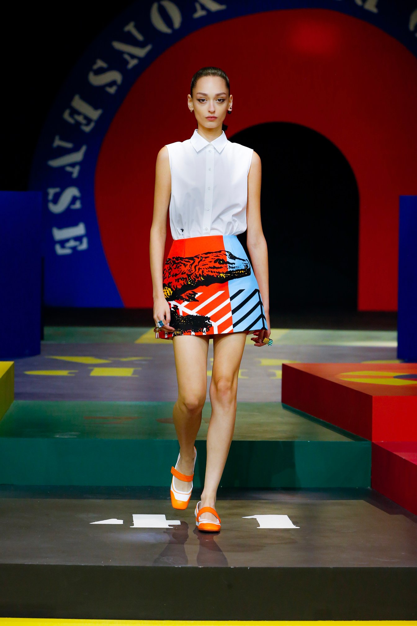 後半は「トワル ドゥ ジュイ」に着想を得たアニマルのグラフィックが様々なアレンジで登場。タイガー、ライオン、レオパード、ゼブラ、アリゲーターといったイラストに、道路標識がモチーフのストライプ柄が組み合わされている。また、フローラルとレオパードを融合したという煌びやかなテキスタイルも提案された。