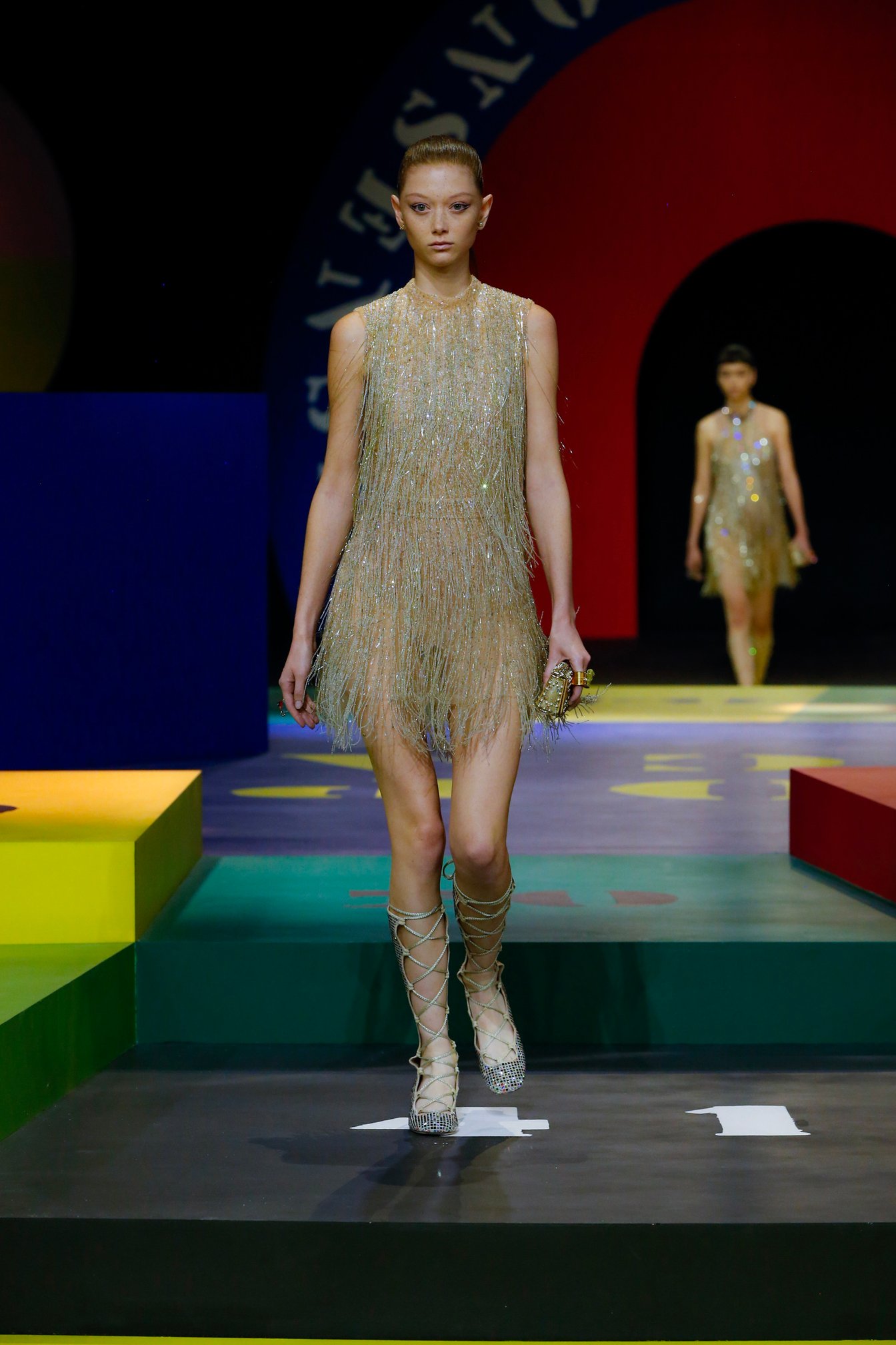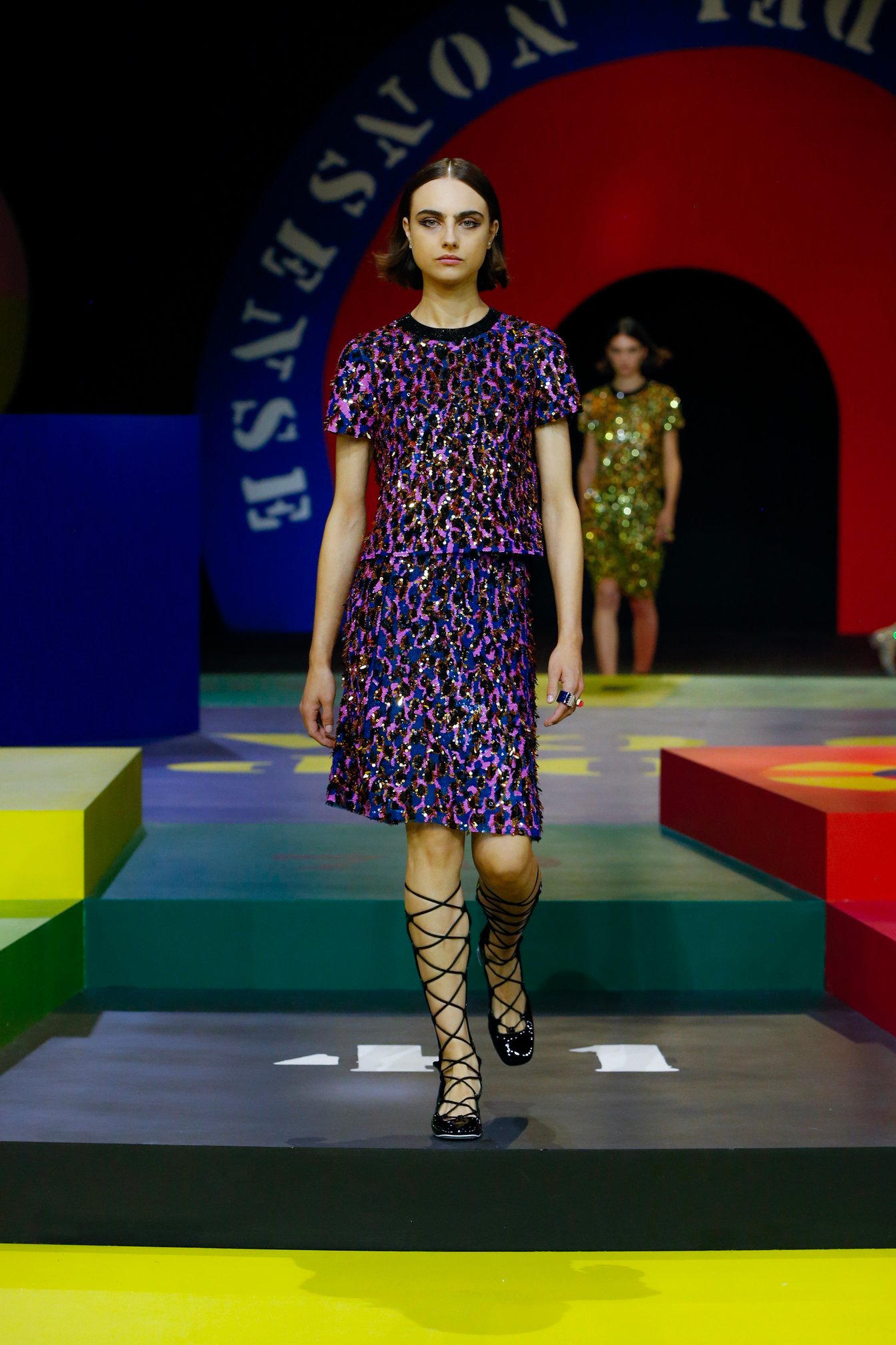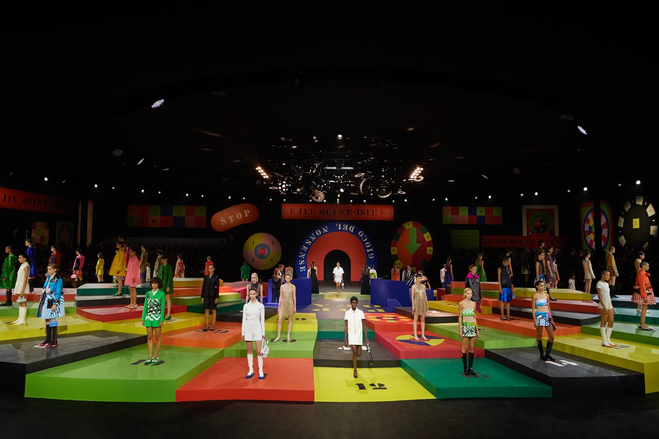 マリア・グラツィア・キウリ(Maria Grazia Chiuri)が手掛ける「ディオール(DIOR)」が、パリで2022年春夏コレクションを発表した。アーティストのアンナ・パパラッチ(Anna Paparatti)による舞台装飾はカラフルなゲームがモチーフ。1960年代のムードをまとったグラフィカルなスタイルのモデルが、巨大なボードゲームの上で駒を進めるようにウォーキングした。