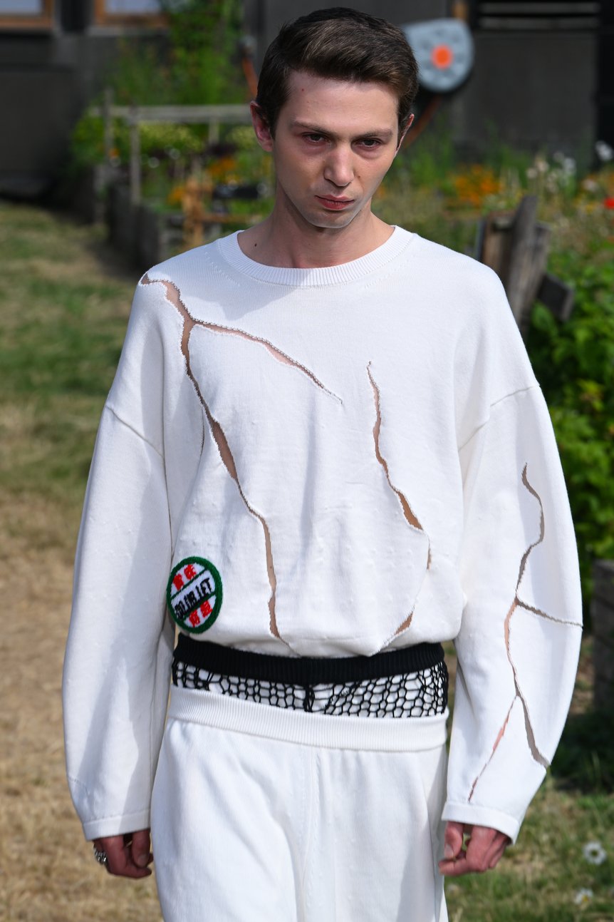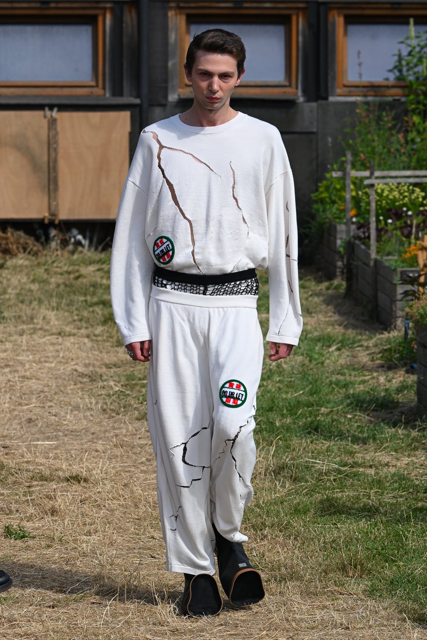 「ドーバー ストリート マーケット(DOVER STREET MARKET)」を介して縁を得たというアーティスト、ダン・コーレンが2011年に創設した非営利団体「スカイ ハイ ファーム(SKY HIGH FARM)」との協働も注目に値する。同組織は食を通じた社会貢献を理念とし、収益の50%を農場に還元している。ダブレットは同ファームのキャラクターを配したアイテムや、大地との繋がりを象徴する泥染めスーツなどを展開した。