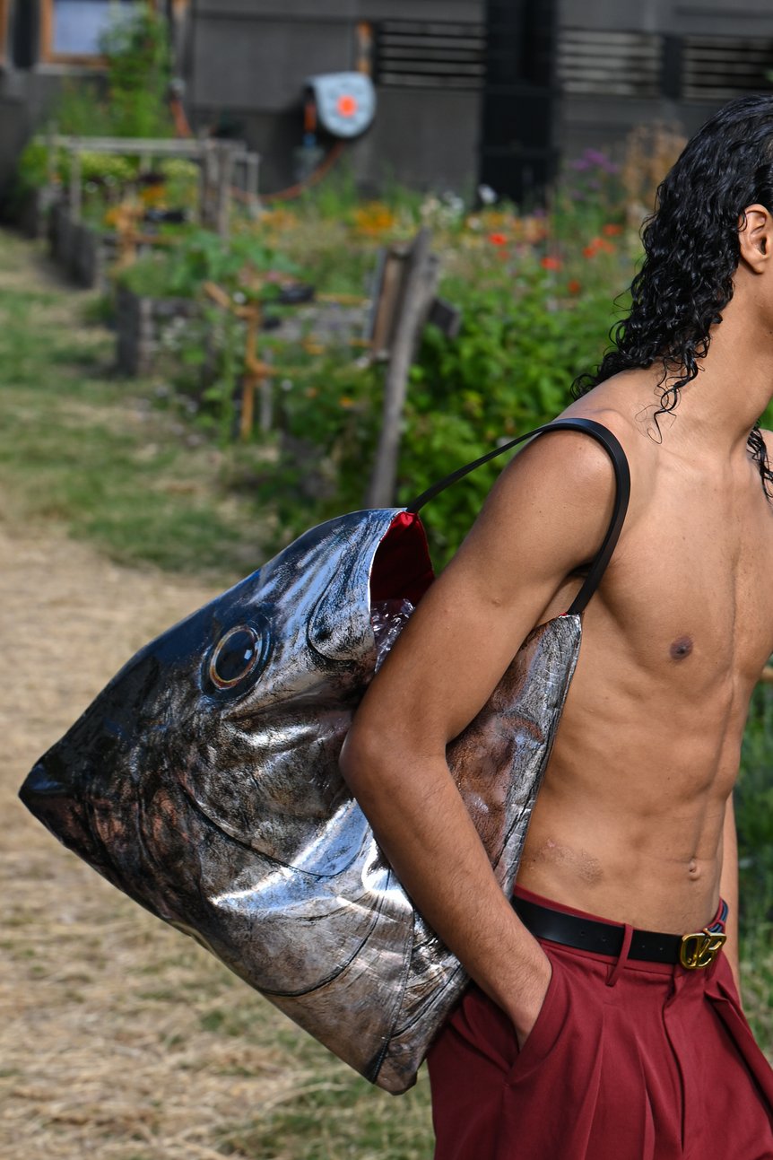 ロールプレイングゲームのように活動を通じて仲間を増やしていく同ブランドらしく、今季も継続を含む多数のコラボレーションが展開された。漁業で使う長靴をひっくり返したようなデザインのシューズは「キッズ ラブ ゲイト(KIDS LOVE GAITE)」と製作。目玉焼きのようなハットは「キジマ タカユキ(KIJIMA TAKAYUKI)」、サングラスは「817 BLANC LNT」、魚頭をプリントしたバッグや長靴バッグは「ベータ ポスト(beta post)」とコラボし、そのほか「アシックス(asics)」をはじめ、「エー レザー(A LEATHER)」「レボマックス(REVOMAX)」「ワコール(Wacoal)」「シンフラックス(Synflux)」とプロダクトを開発した。