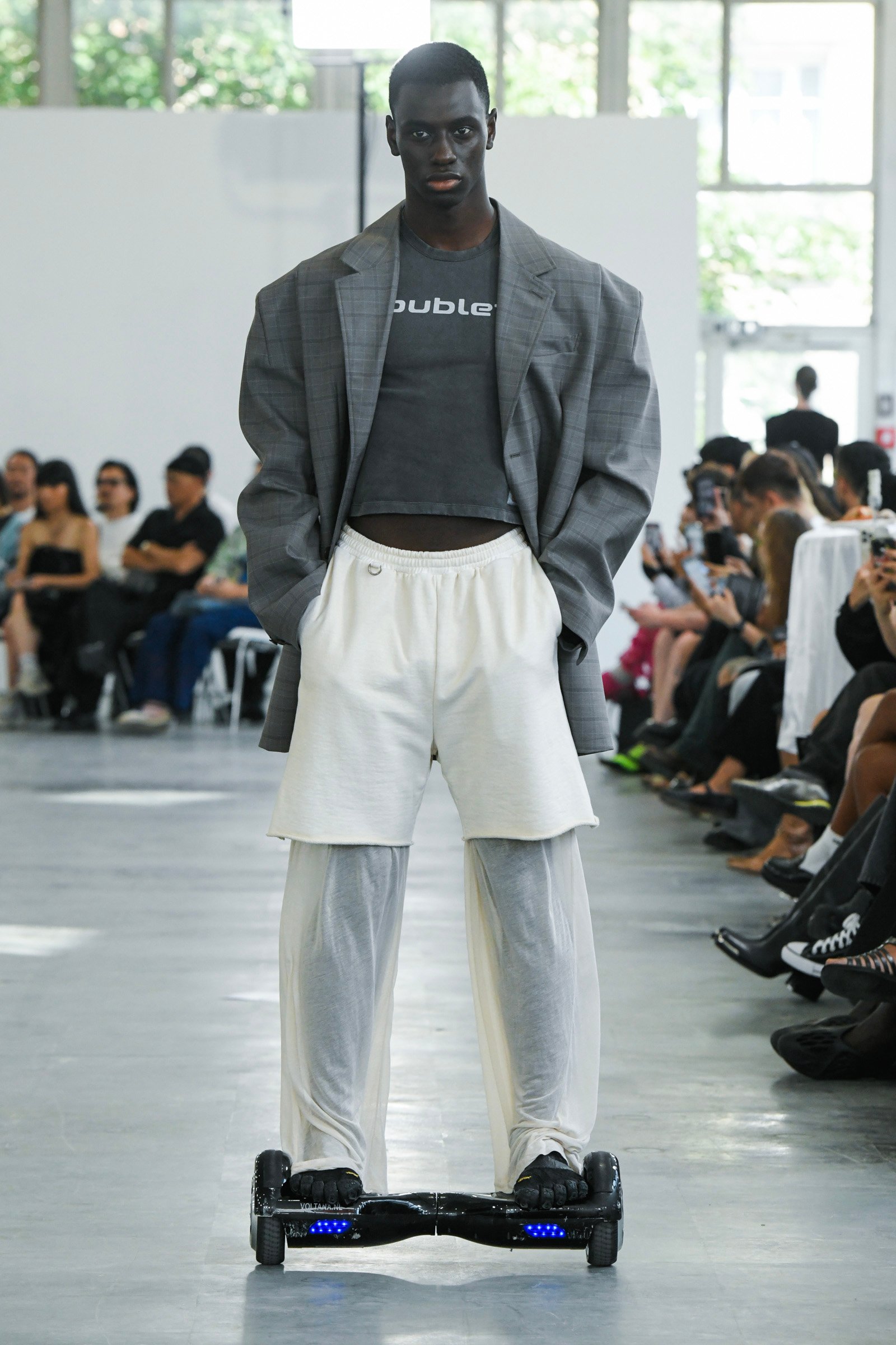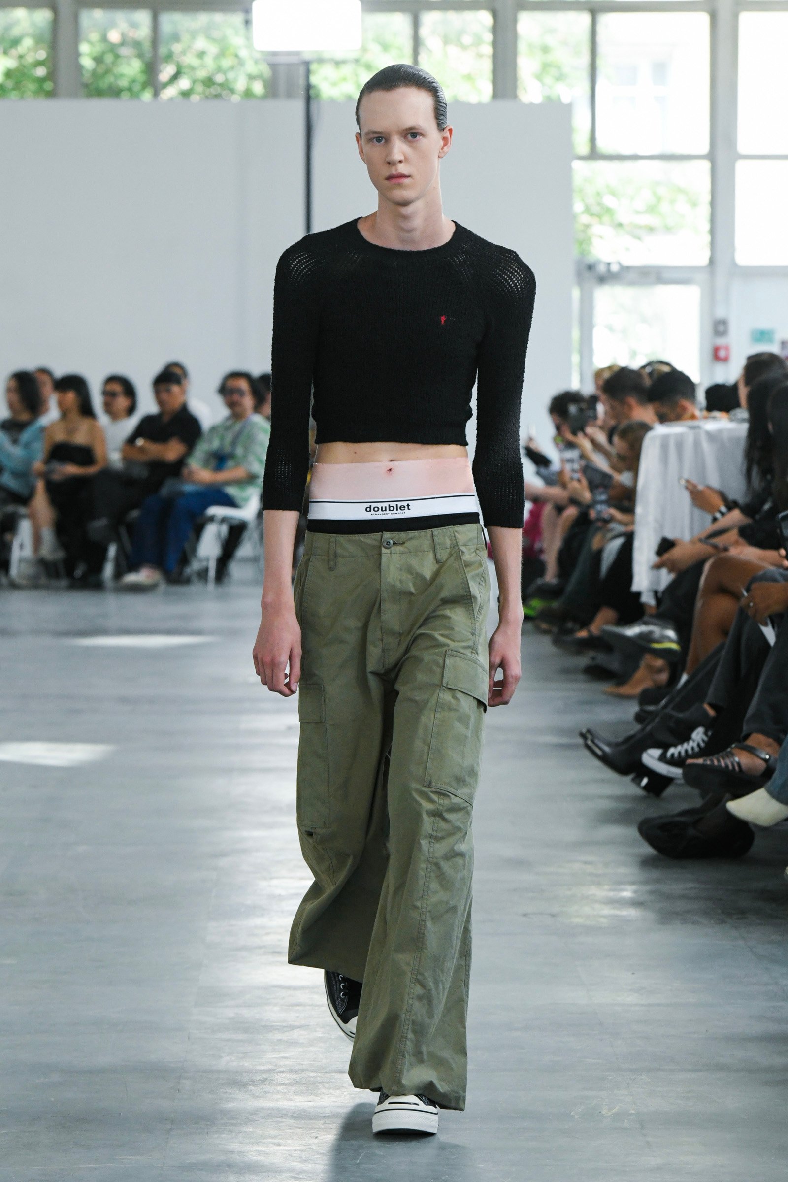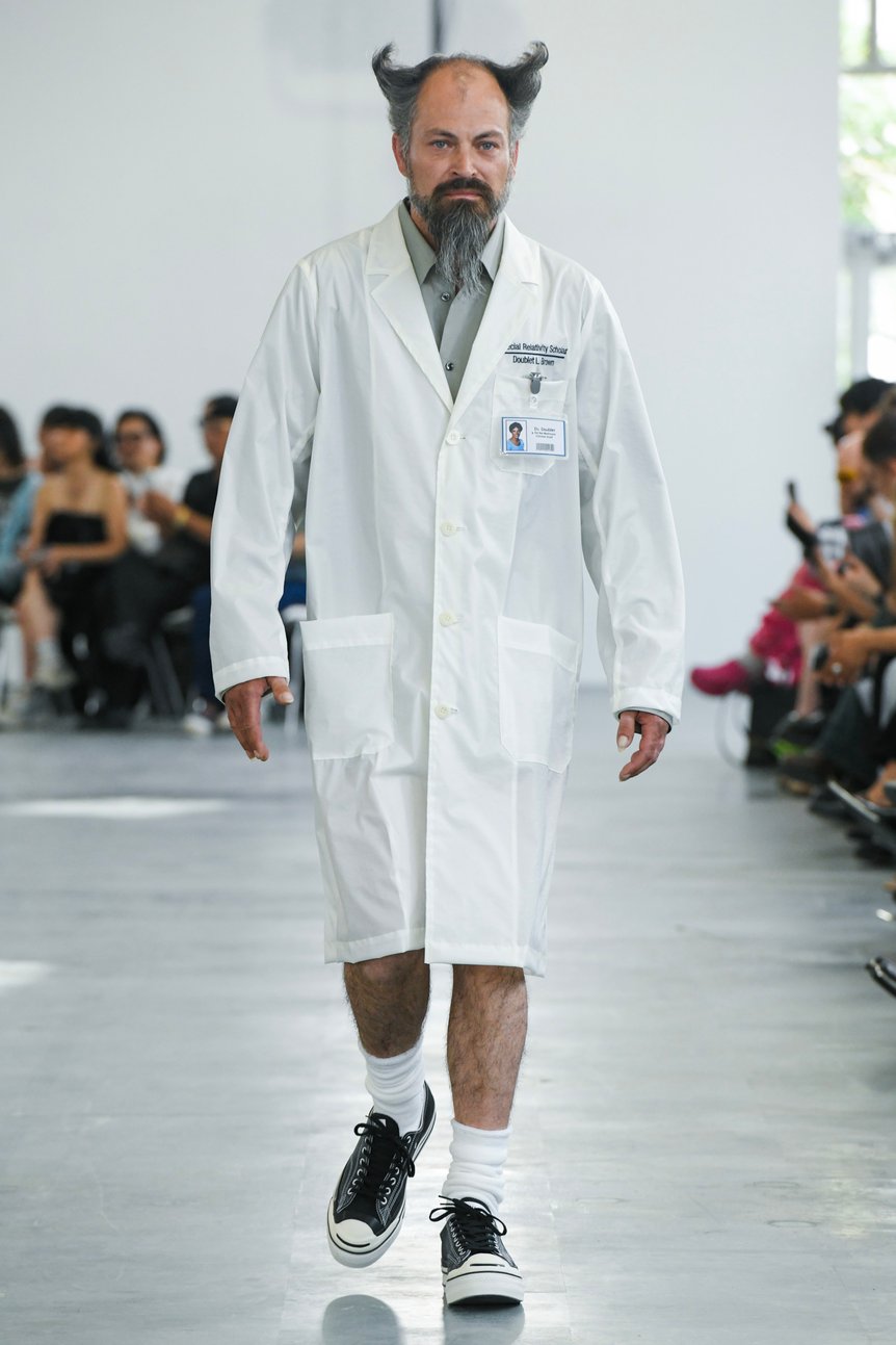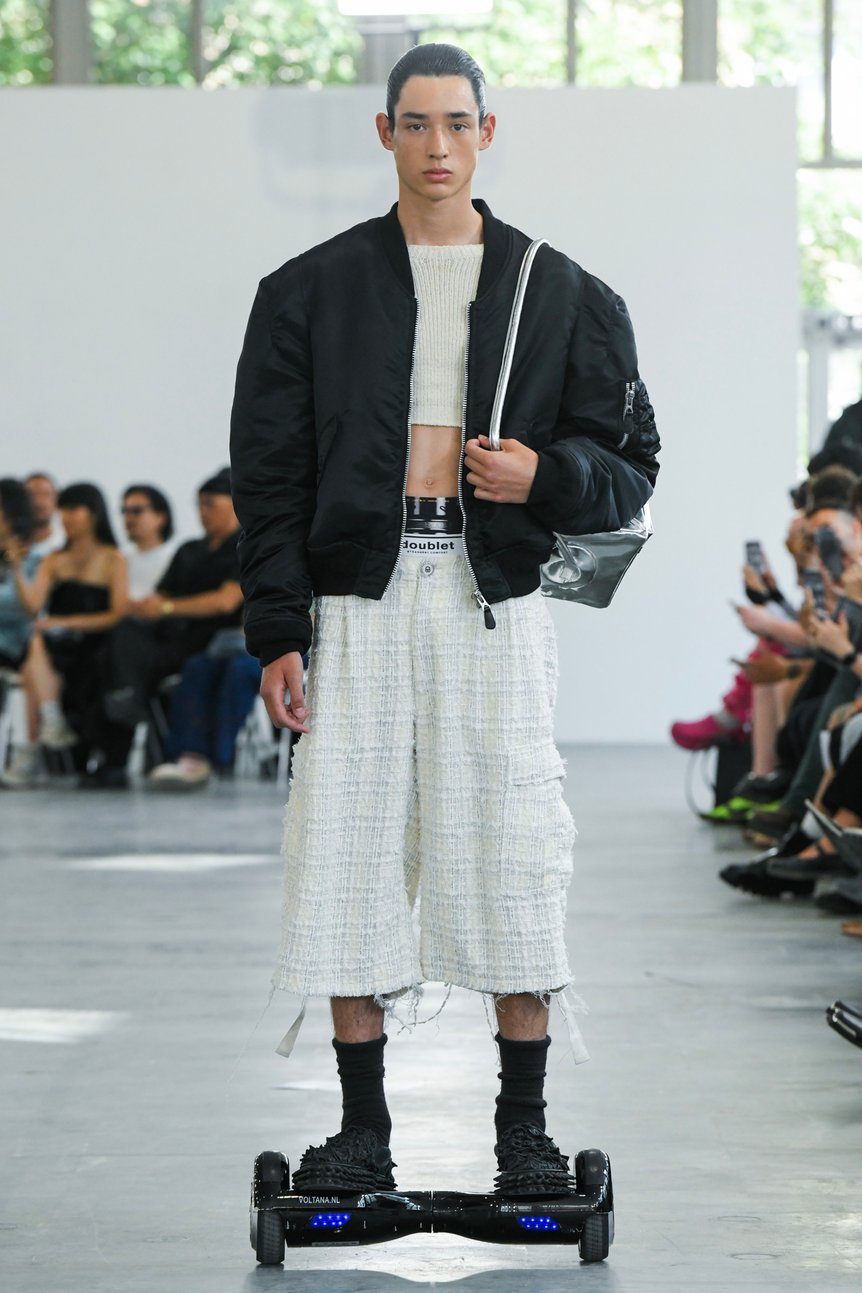 ここ数シーズン継続しているサイズという概念への揺さぶりも、バリエーション豊富にフォルムの提案として行われている。ウエストと袖に生地を余らせたニットや袖山にダーツが入りショルダーが落ちたジャケット、タイトフィットのニットなど、腹部をプリントしたアンダーウェアやトロンプ=ルイユ風のスカートといったダブレットらしいユーモアも交えながら提案している。また、「スイコック(SUICOKE)」とは以前コラボレーションして恐竜など動物の足跡がつくシューズを発売したが、今シーズンは5本指シューズを披露した。
