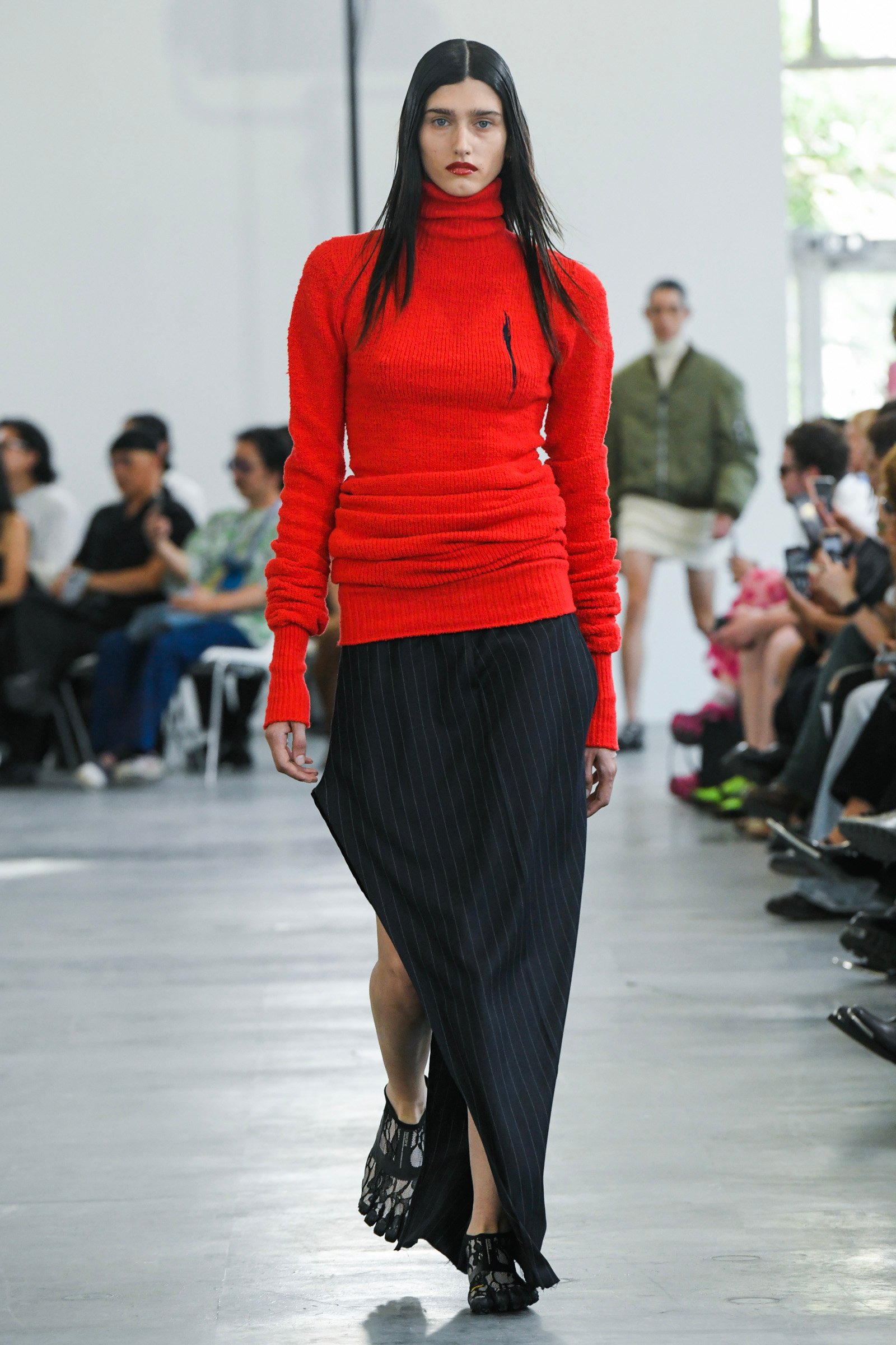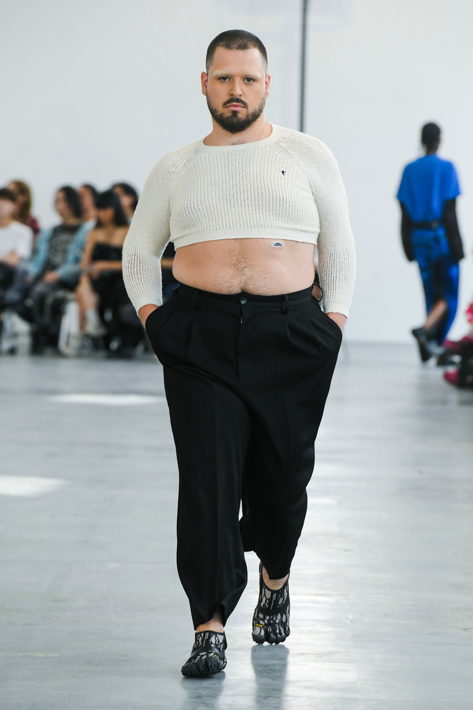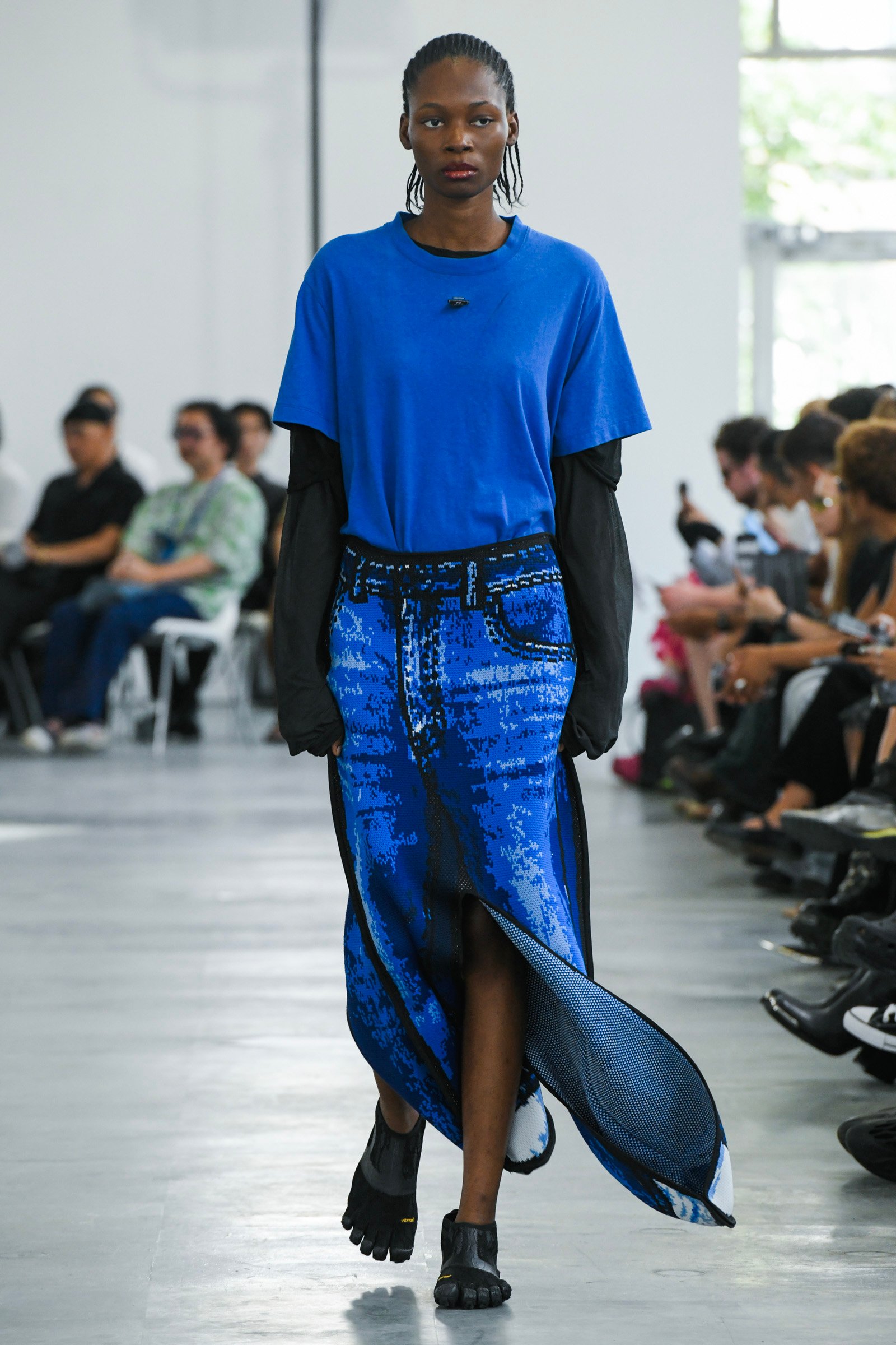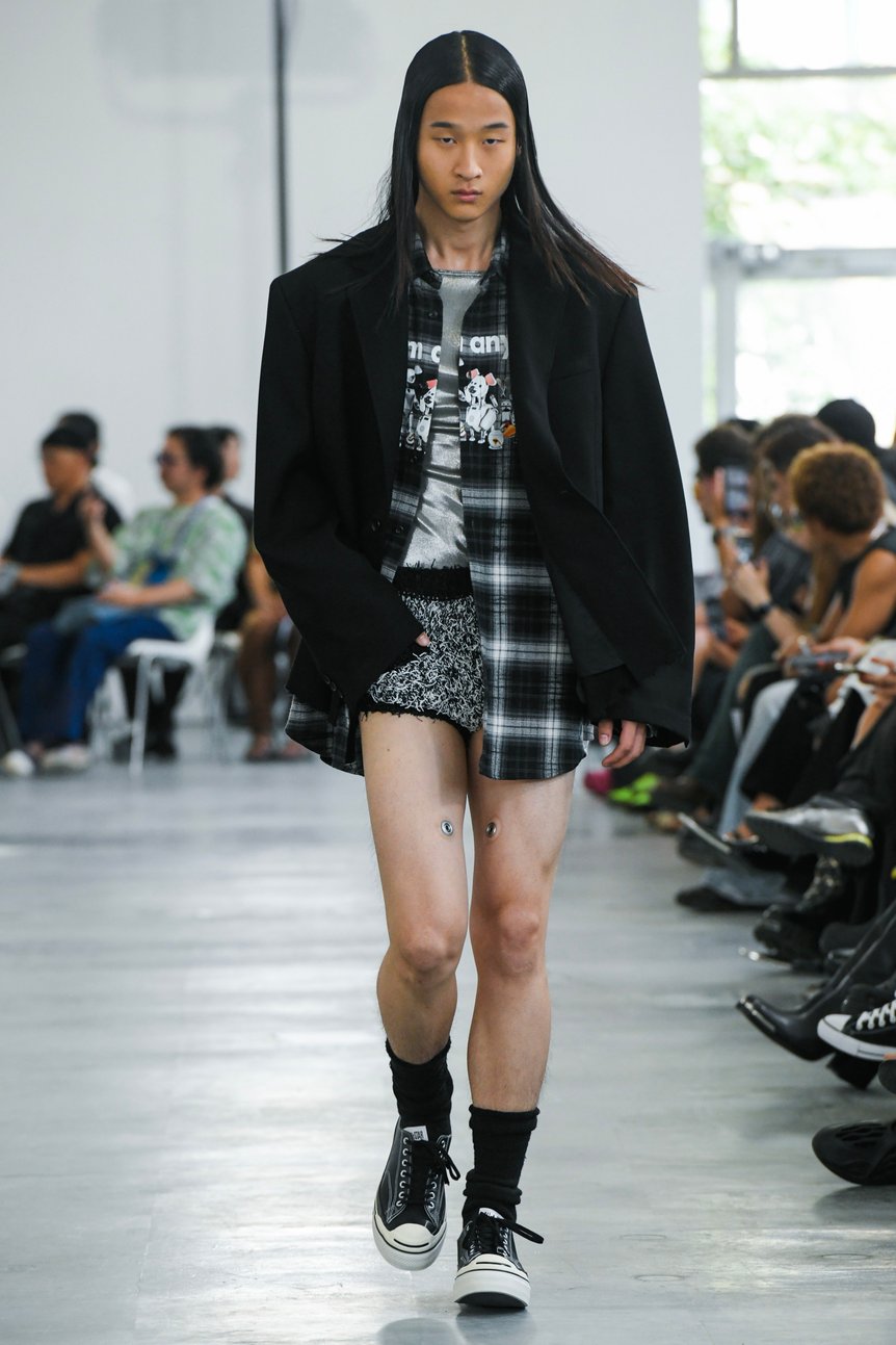 ここ数シーズン継続しているサイズという概念への揺さぶりも、バリエーション豊富にフォルムの提案として行われている。ウエストと袖に生地を余らせたニットや袖山にダーツが入りショルダーが落ちたジャケット、タイトフィットのニットなど、腹部をプリントしたアンダーウェアやトロンプ=ルイユ風のスカートといったダブレットらしいユーモアも交えながら提案している。また、「スイコック(SUICOKE)」とは以前コラボレーションして恐竜など動物の足跡がつくシューズを発売したが、今シーズンは5本指シューズを披露した。