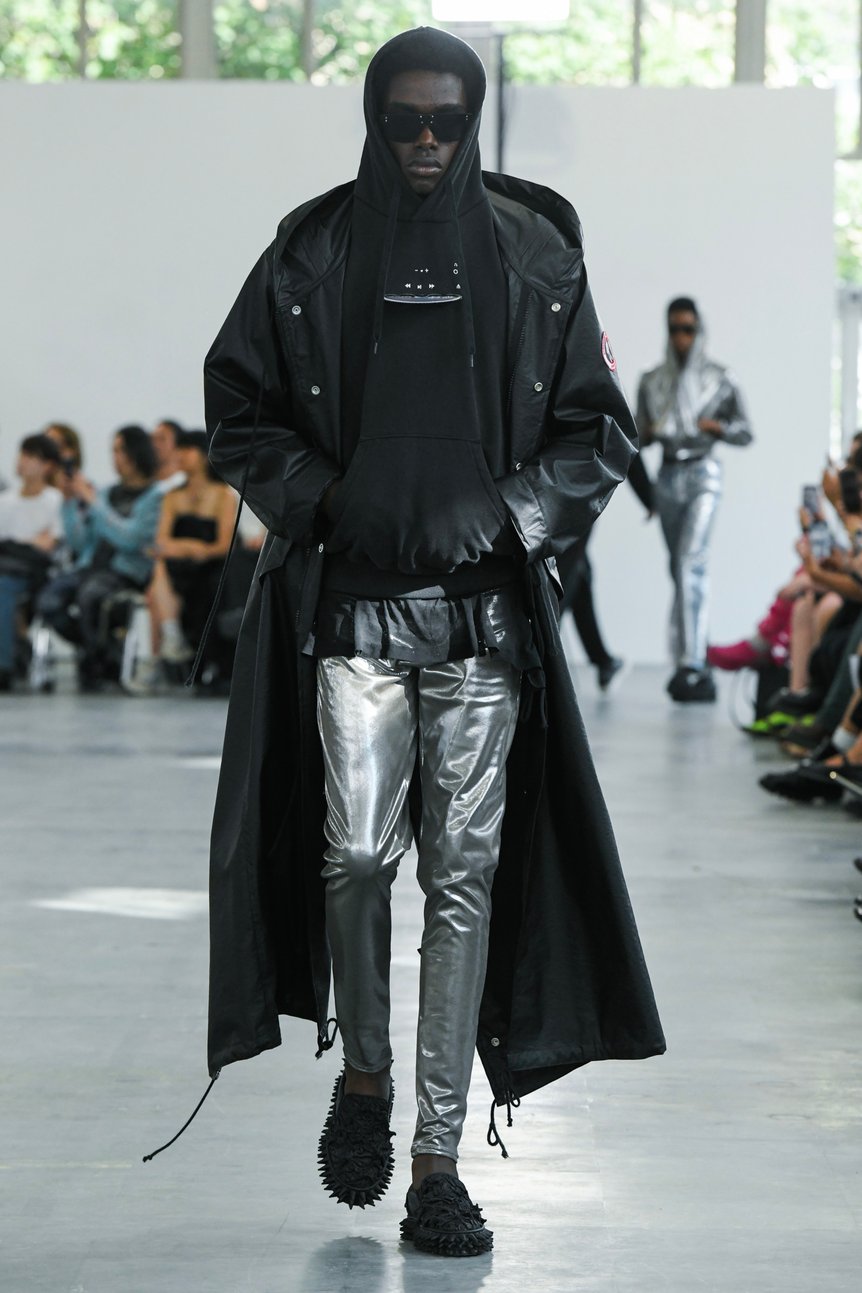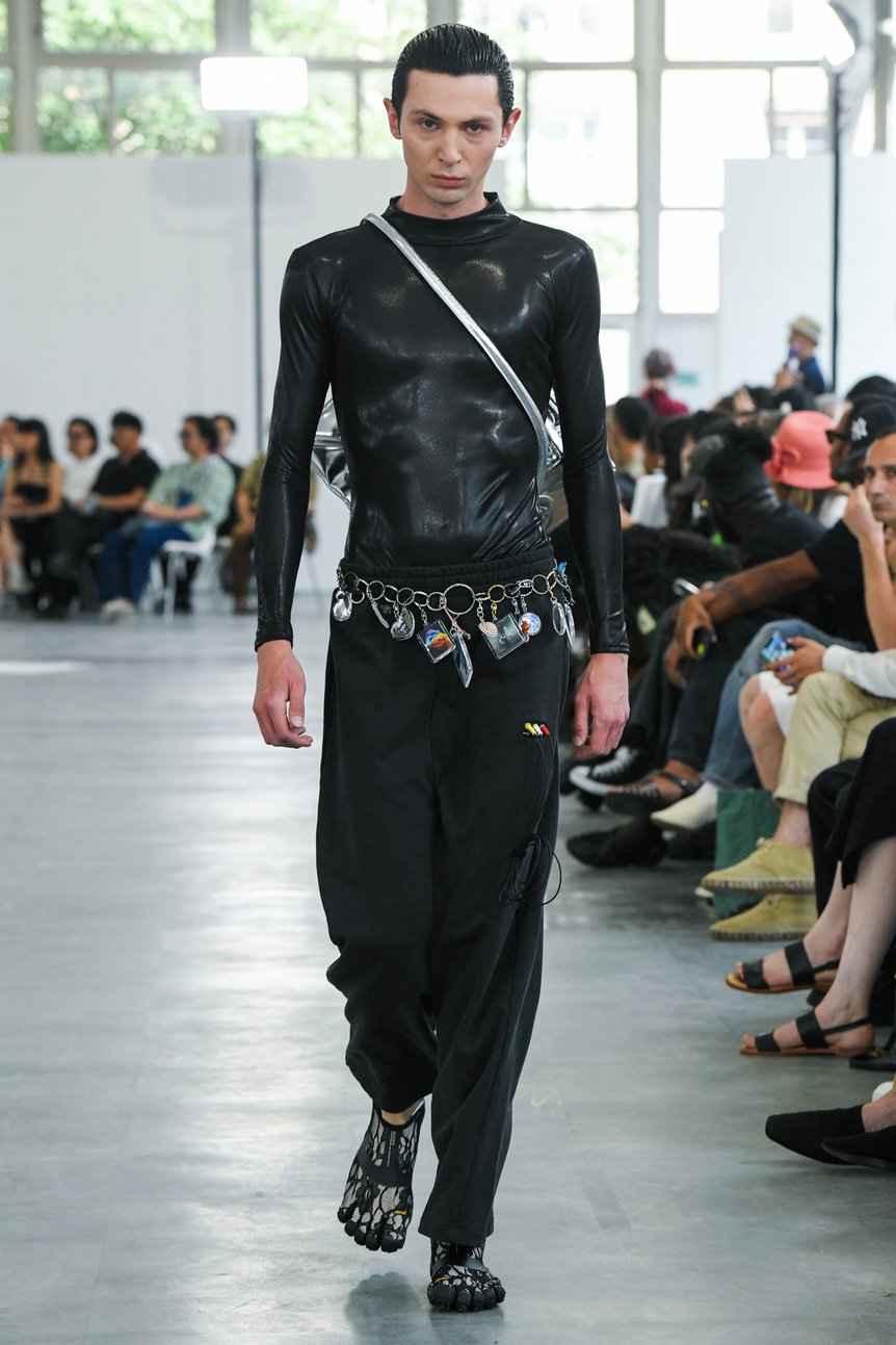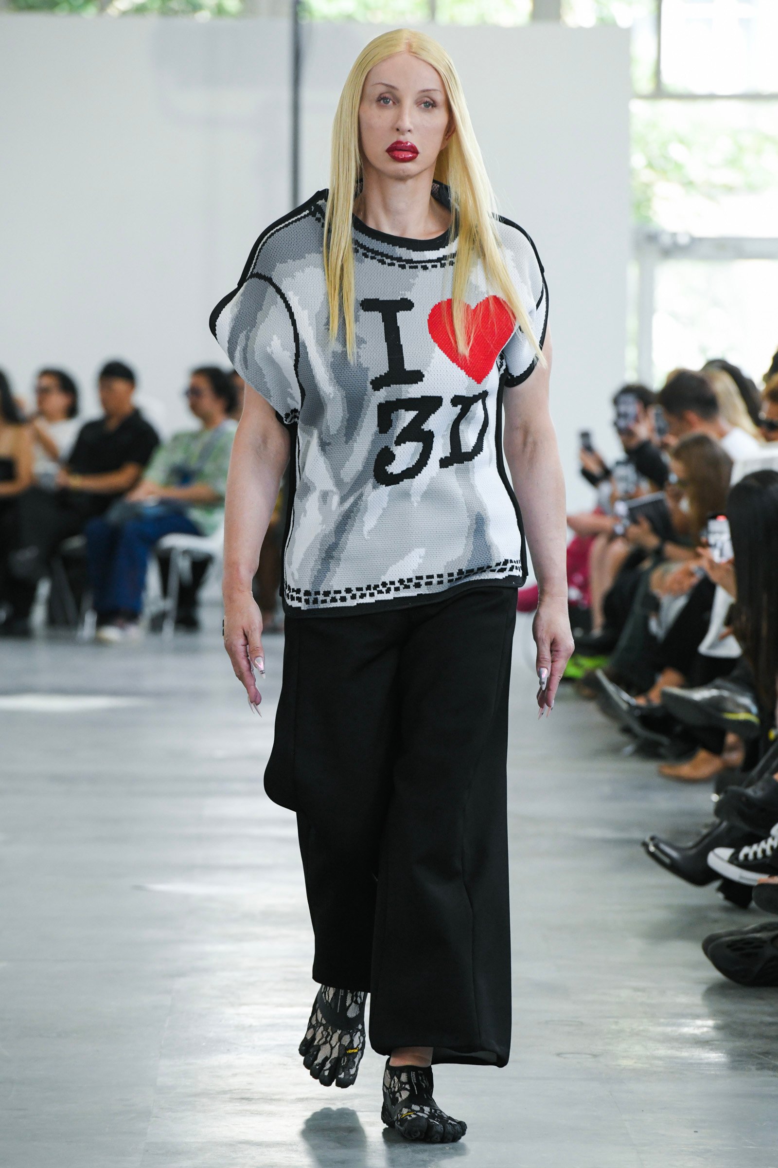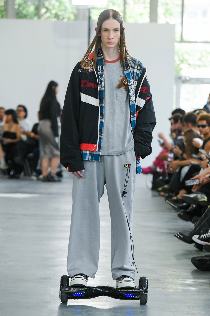 ホバーボードをはじめ、ロボットのプリントやネジ穴のような特殊メイク、3色端子など機械的なディテールに人は人間らしさを感じることができるのか。ぬいぐるみやハートマーク、現代では推し活の必須アイテムとなったアクリルキーホルダーなど「愛着」に関するデザインと共存させたりと、何を差し引き、何を足せば人間足らしめるのか、2024年春夏コレクションはそうした「人間っぽさ」の追求が軸にある。