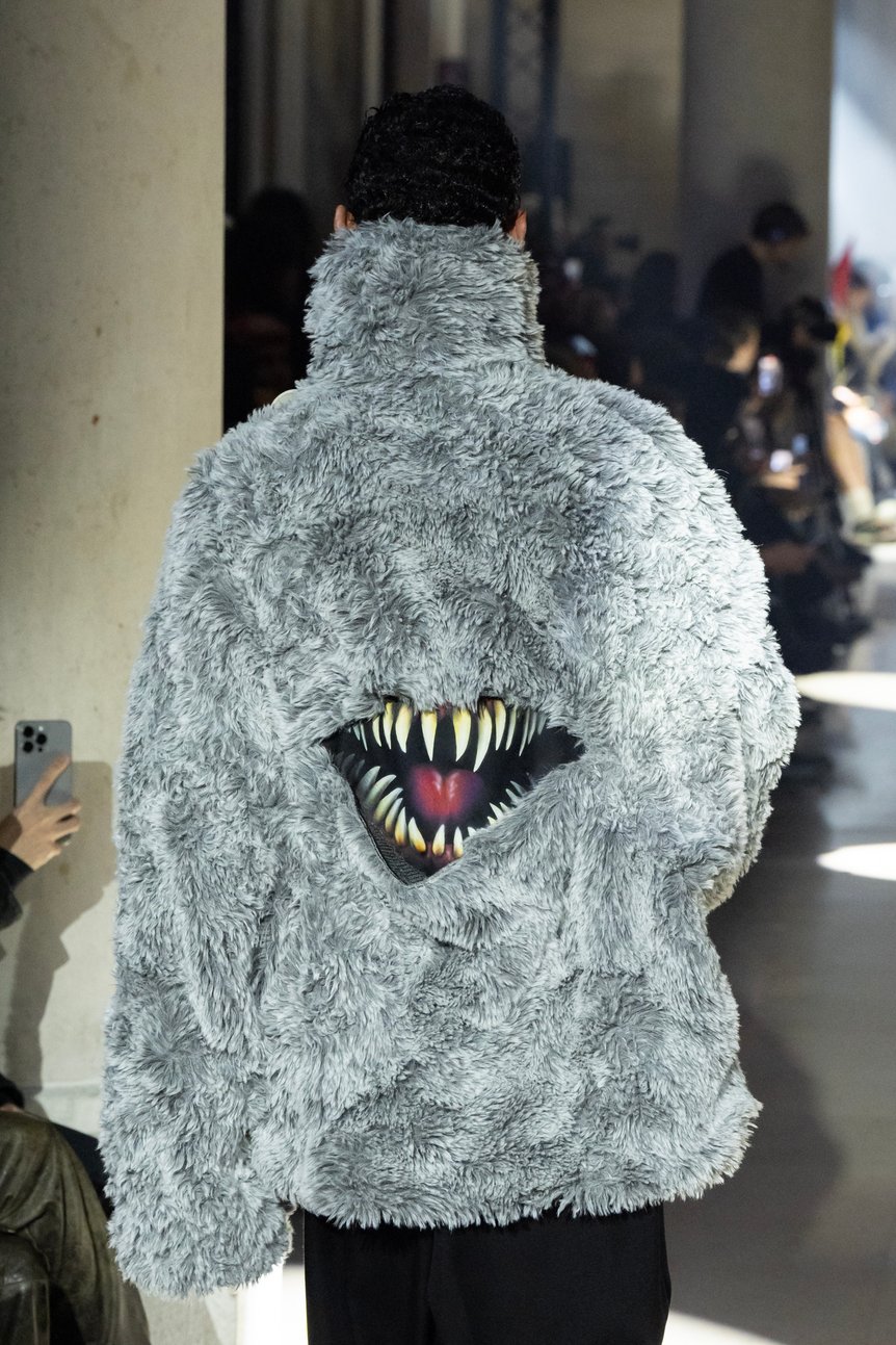 「悪役たち」のモチーフは特攻服のヤンキーにとどまらず、ハリー・ポッターの「スリザリン」が着想源かのような蛇をモチーフにしたパーカの紐、キッズ ラブ ゲイトとコラボ製作した怪物の口のようなデザインの靴先が開いたレザーシューズ、怪物の口がプリントされたシアリングブルゾン、ドラキュラのような高い襟と長く広がった袖など、ダブレットらしく表現した。