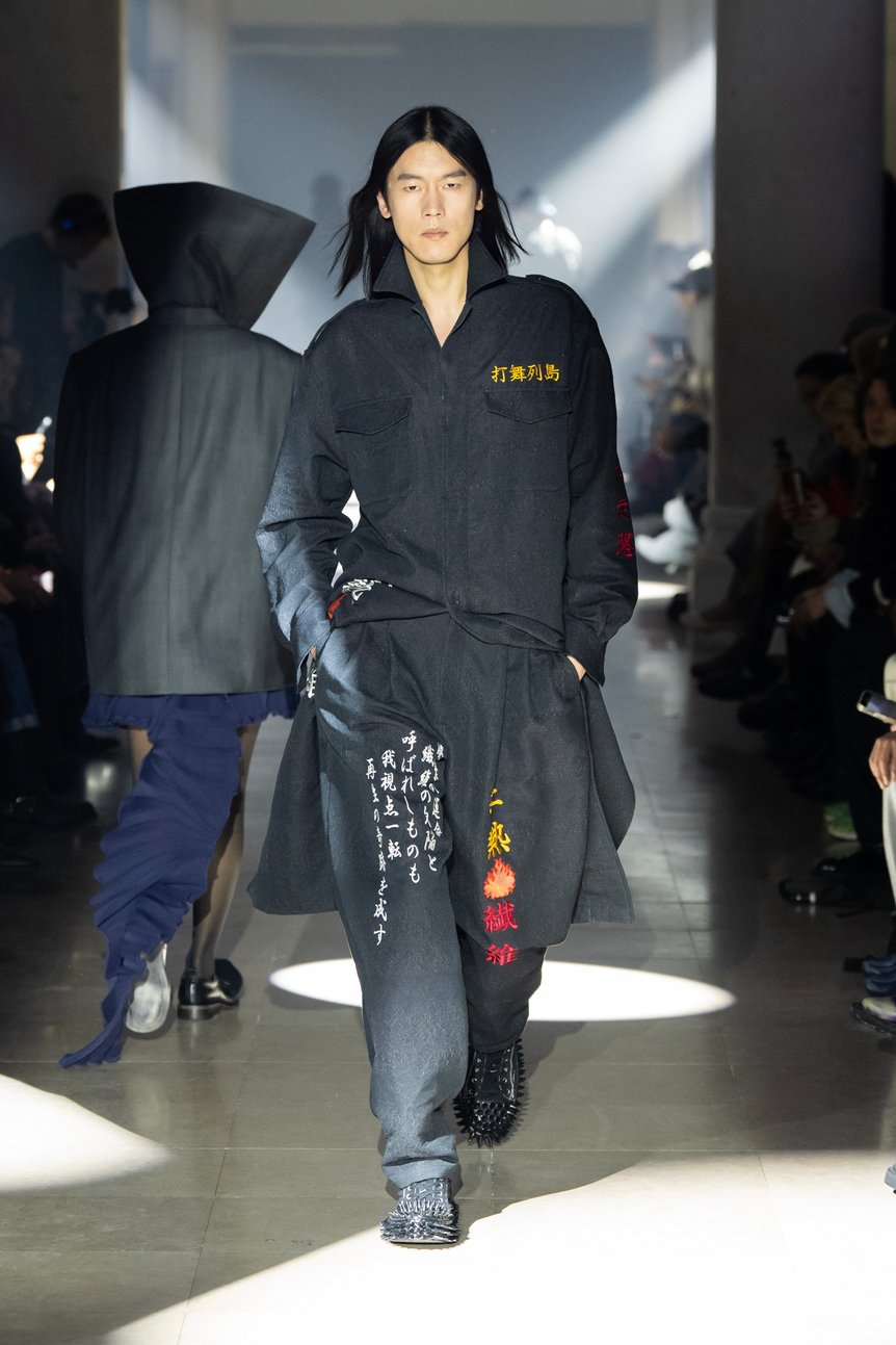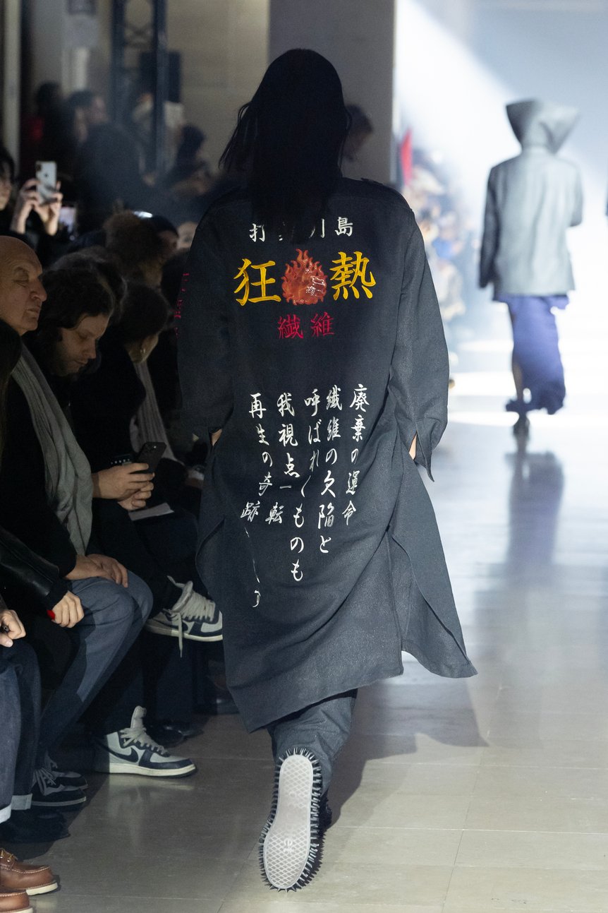 ダブレットのデザインには、腑に落ちる理由がある。例を挙げれば、2021年秋冬で登場し、話題を集めた頭までを覆えるコートも、一見ネタを追求したものに見えるが、闇雲に作るビッグシルエットでは納得感がないと、別途用途を設けることであのフォルムは作られた。シーズンテーマに沿わせながら、デザインに意味を持たせるため、ここでは素晴らしい素材を世に広めるため、ファイバークレーズの機能素材は、ダブレットにかかれば「打舞列島 狂熱繊維」という文字と同素材についての「ヤン詩」を刺繍した特攻服に仕上がる。