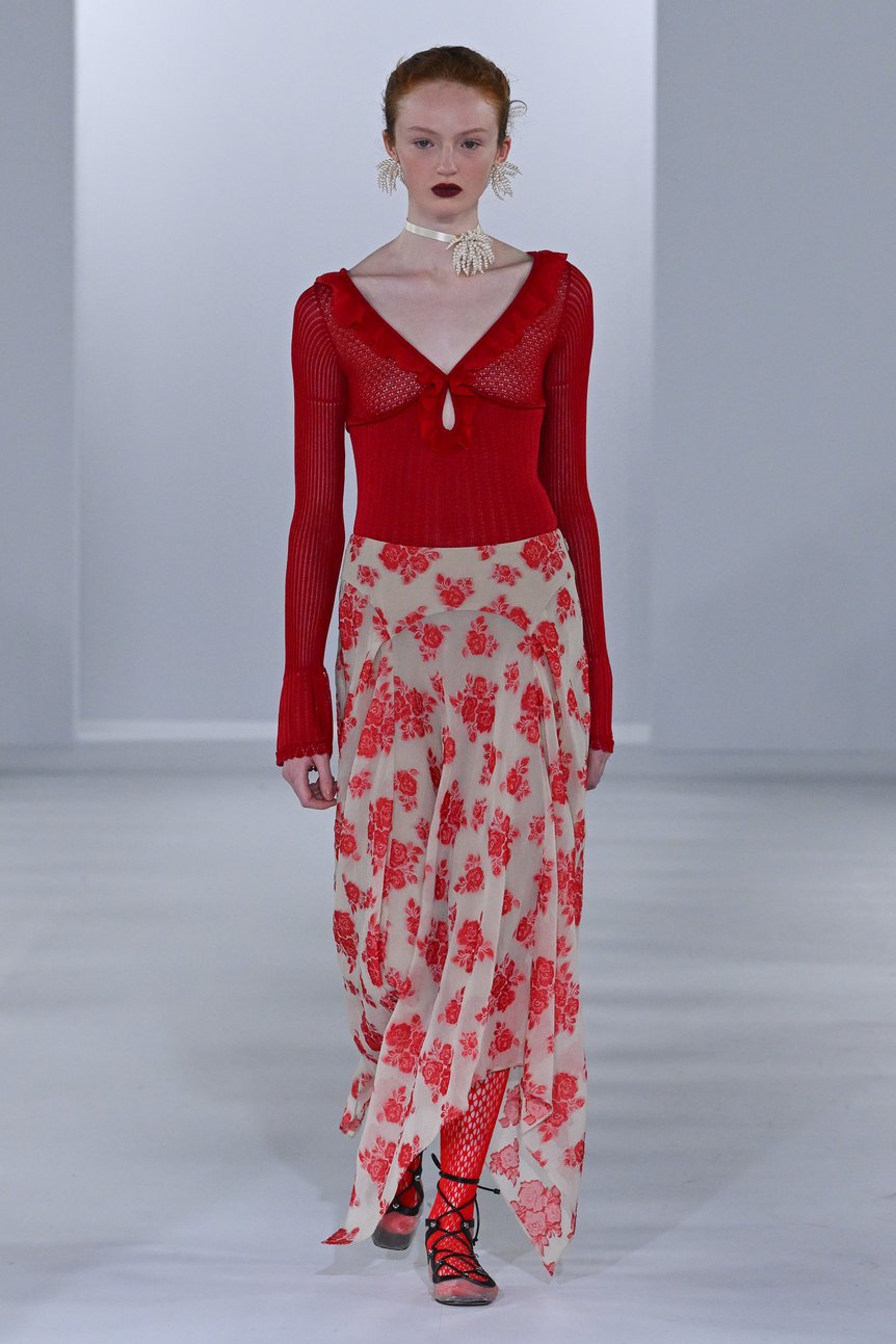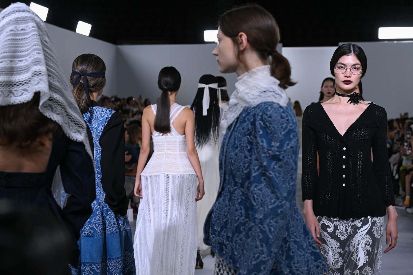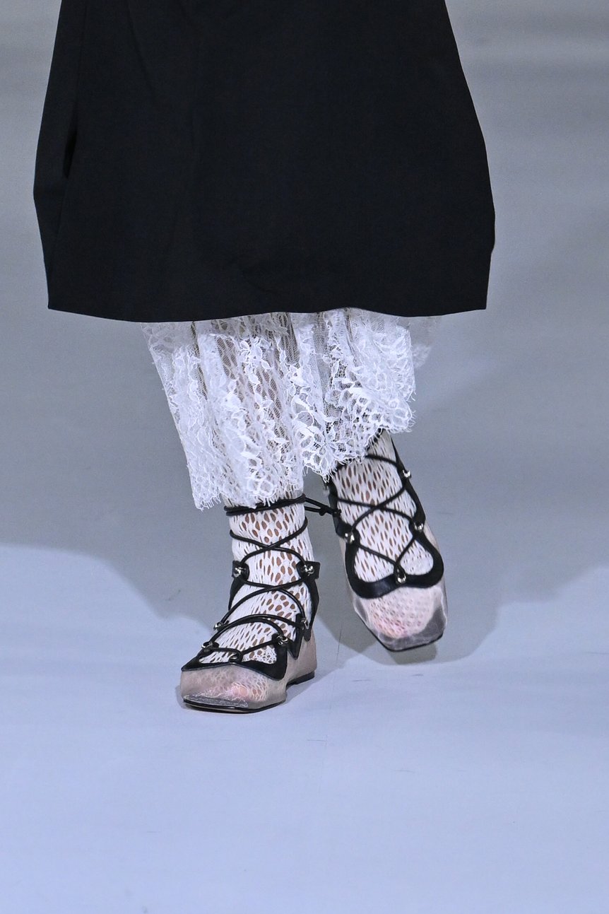 多様な柄のレースや編み地、透け感のある素材などをレイヤードしたスタイリングも、今季は目を引いた。裾から美しい花柄のレースが覗くスカートと格子柄の編みタイツ、リバーレースのミニドレスとふんだんにギャザーが寄ったトップス、透かし編みのニットとジョーゼットなど、さまざまな柄や質感の布地や編地が身体の上で繊細に重なり合うさまにも、女性の持つ多面性や奥深さが表れている。