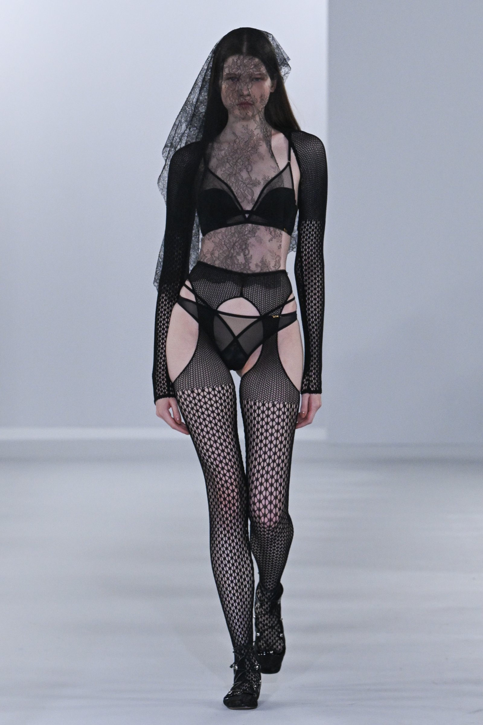 そして今回のショーでも印象的に登場した、アイコンでもある官能的でフェティッシュな“ランジェリールック”。ブラとショーツに、ウエストとヒップ部分に大きな穴が空いたデザインの網タイツとアームカバーを重ねた挑発的なスタイルから、繊細なレースとプリーツが特徴のミニ丈のスリップドレスまで、豊富なバリエーションを提案している。非常に美しく、フェティコの美意識や世界観を豊かに伝えるものではありつつも、街中や日常ではとても着られそうにないこれらのルックを、舟山はなぜ作り続けるのか。ショーを終えた彼女にその背景にある思いを尋ねてみたところ、こんな言葉が返ってきた。