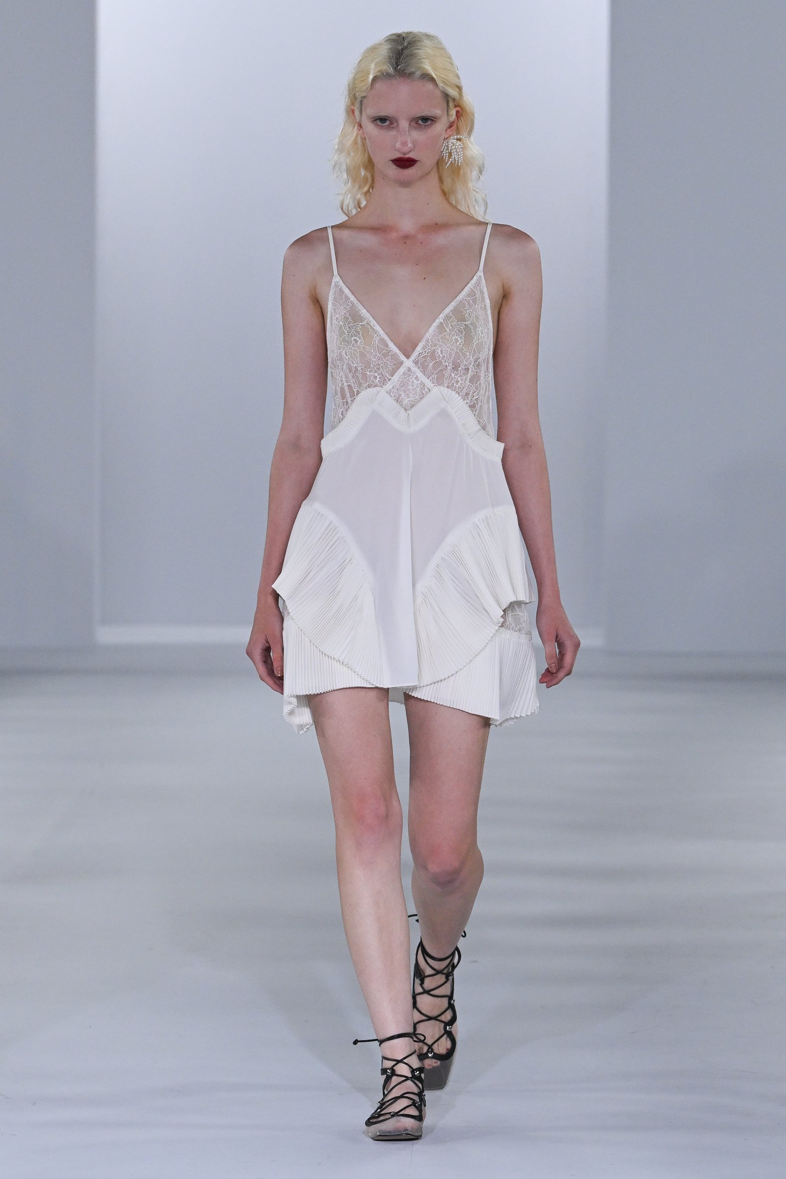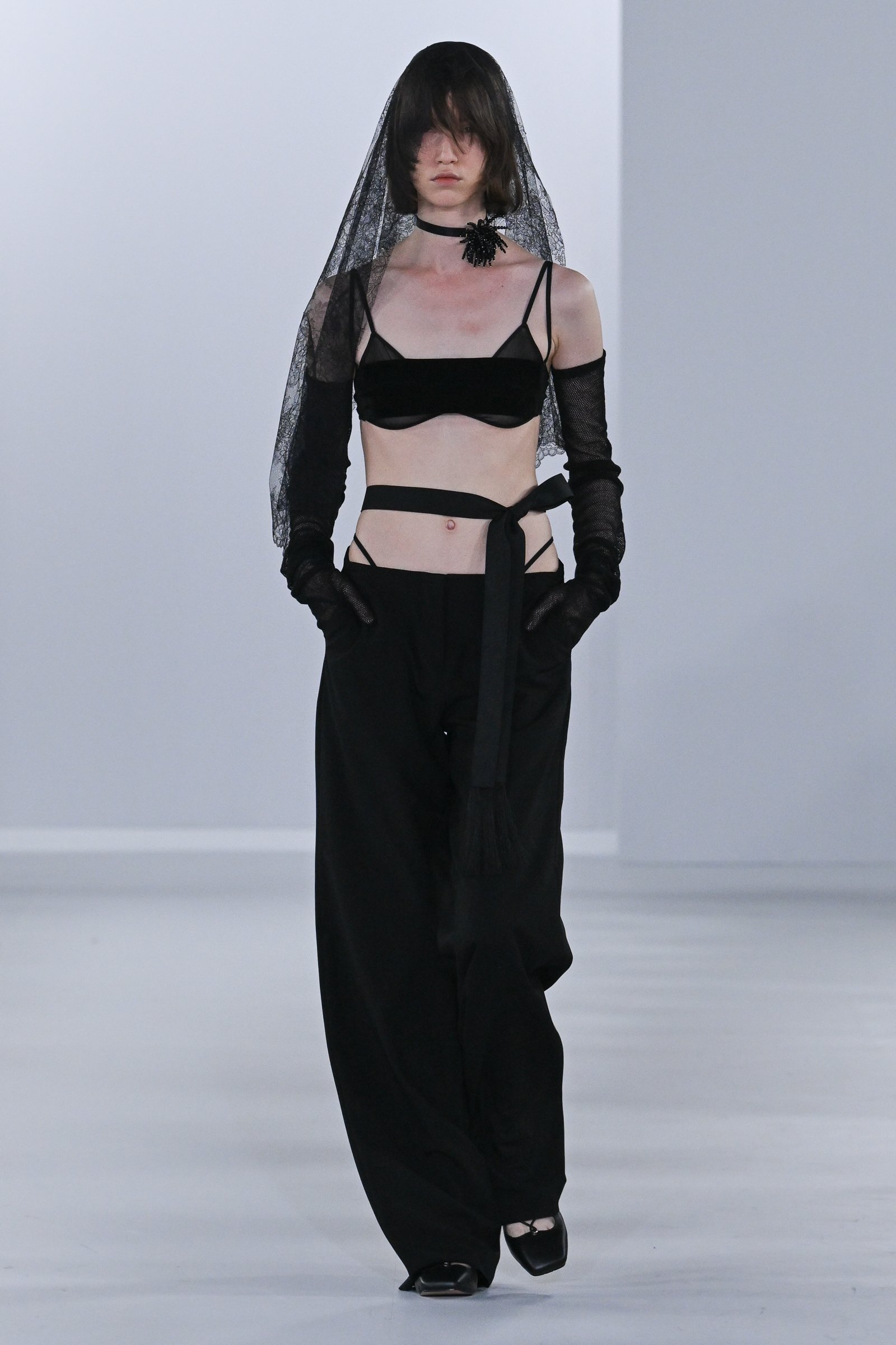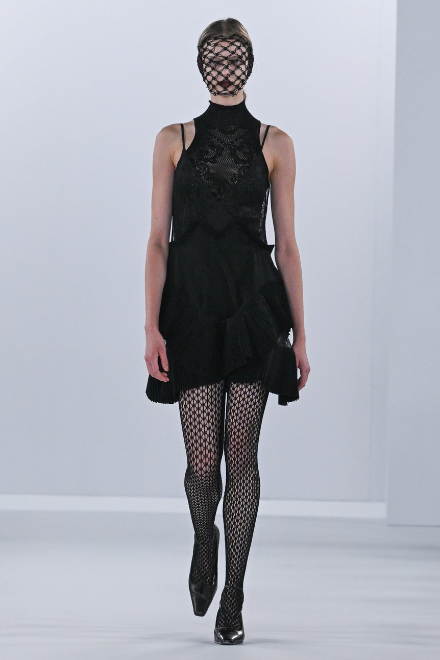 コレクションでは、レベッカ・ホルンの作品に登場する羽根や放射状のモチーフをフリンジやプリーツ、切り替えなどのデザインとして、イリナ・イオネスコの作品の退廃的な世界観を1920年代のランジェリーの要素やダマスク柄として随所に散りばめ、フェティコならではの女性の造形美を引き立てるシルエットと融合。ダマスク柄の編み地のノースリーブトップスに、胸元にレース、裾にプリーツをあしらったミニ丈のスリップドレスを重ね、顔と脚を格子状のマスクとタイツで覆ったスタイルのファーストルックにも、その要素が色濃く反映されている。
