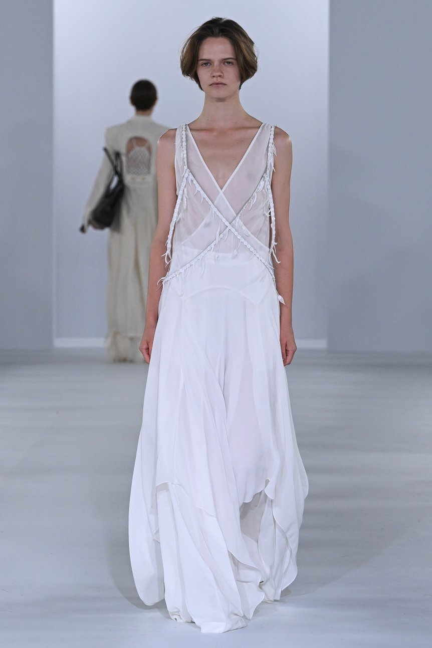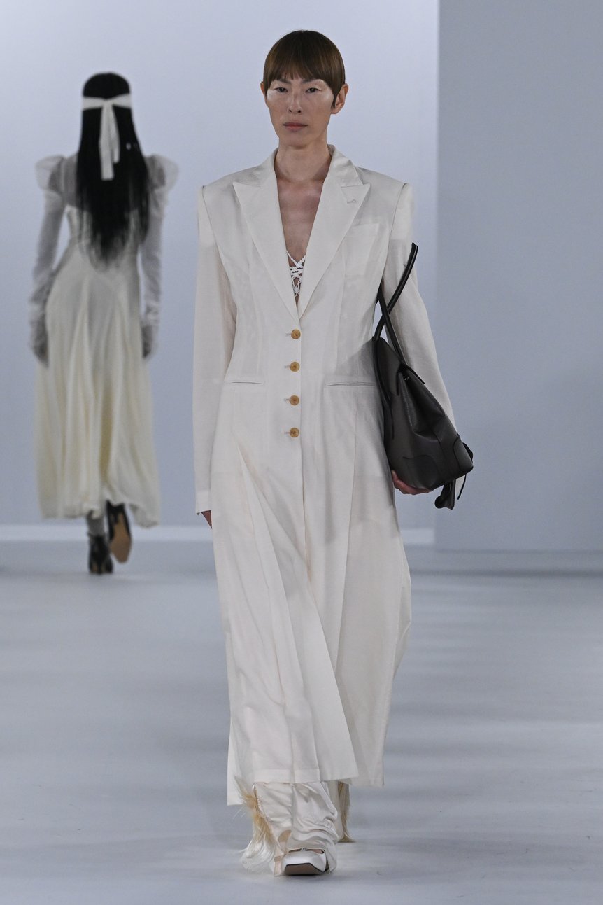 同ブランドにとって設立5周年のアニバーサリーコレクションとなった今回、舟山がテーマに掲げたのは、「彼女の奥深さ(The Depth of Her)」。ドイツの現代美術家 レベッカ・ホルン(Rebecca Horn)と、ルーマニア系フランス人の写真家 イリナ・イオネスコ(Irina Ionesco)という2人の先駆的な女性アーティストの作品に着想を得て、表層的な美しさだけではない、女性の内なる強さと複雑さを繊細にコレクションに落とし込んだ。