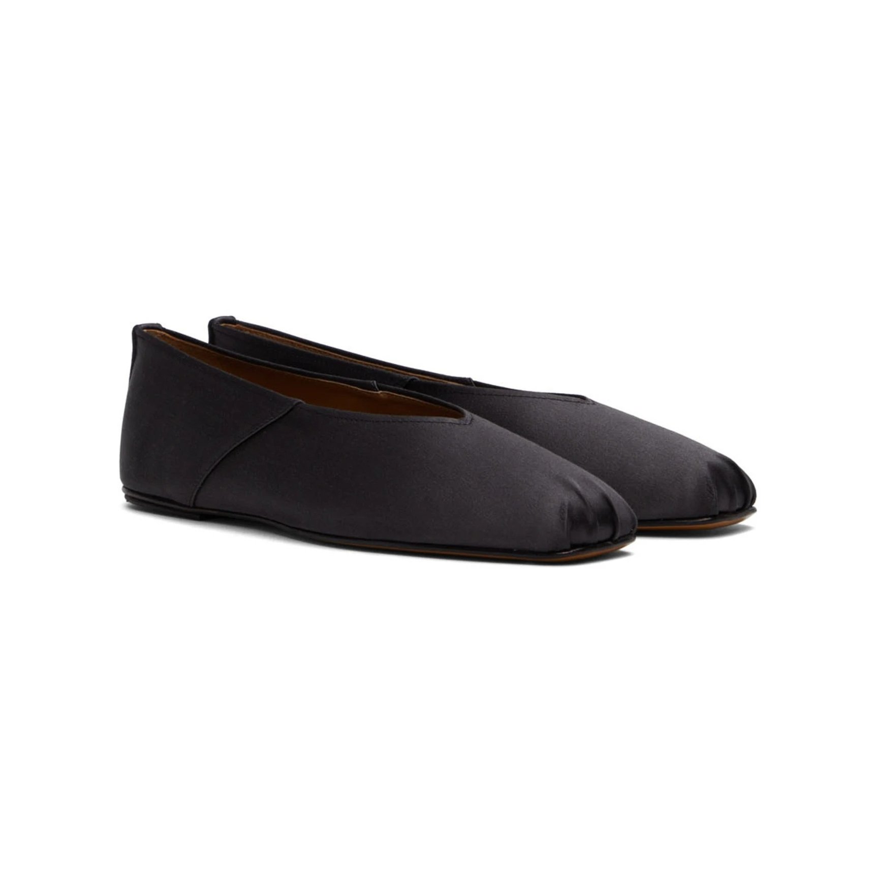 サテンを採用した光沢感のある表情に高級感が宿る「ザ・ロウ(THE ROW)」のフラットシューズ。タックを施したスクエアトゥや、切り返しを入れたボディのデザインなど、シンプルながら程よくアクセントの入ったデザイン。シックな足元を演出してくれます。
